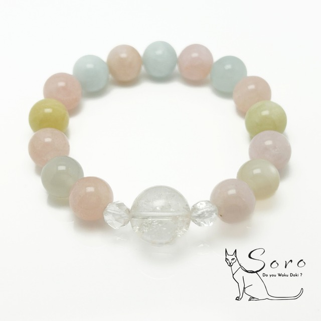 ご購入前に本文の注意書きを必ずご覧ください やわらかな色彩が重なり合う10mmサイズのミックスベリルに、虹の輝きを宿す13.7mmの大きなピンクアイリスクォーツ、 2粒のムーンストーンが優しい光を放つブレスレット。 淡く上品なトーンが手元を彩り、女性らしいやさしさと華やかさを感じさせます。 この組み合わせは、愛情や思いやりを引き出しながら、心を整え穏やかな人間関係へと導くヒーリング寄りの構成。 自分自身を大切にしながら、人とのつながりをやわらかく育てたい方におすすめです。 気持ちに余裕を持ちたい時、 愛情を素直に受け取りたい時、 心をやさしく整えたい時にも、 内側からふんわりと満たしてくれるようなエネルギーを感じられます。 ミックスベリルが愛や癒しのエネルギーをバランスよく巡らせ、 ピンクアイリスクォーツが希望や前向きな気持ちを引き出し、 ムーンストーンが感情の波を穏やかに整えながら女性性を高めます。 無理をせず、自分らしい愛し方や在り方を大切にしたい方へ。 優しさと調和をもたらすお守りブレスレットです。 ≪ 石ごとの代表的な効果 ≫ *ミックスベリル … 愛情・癒し・調和・魅力を高める・人間関係のバランス *ピンクアイリスクォーツ … 希望・前向きなエネルギー・魅力アップ・心の解放・運気の好転 *ムーンストーン … 感情の安定・女性性・直感力・守護・恋愛運 やさしい愛の光に包まれるように、 心のバランスを整えてくれる天然石ブレスレットです。 ¥12000+tax サイズ 内径:約15.5cm ------------------------------- 天然石の製品について以下の点にご注意ください 【個々の違い】 天然石は一つひとつ表情が異なるため、同じデザインでもお色味や模様が画像と異なる場合がございます。 一点もの表記以外の製品は可能な限り近いものをお届けするよう努めておりますが、予めご了承ください。 【サイズ変更】 サイズ変更をご希望の場合は備考欄にご希望の内径をご記載ください。 特にご指定がない場合は無料で調整させて頂きますが、備考欄から追加する石やデザインのご指定は承り兼ねます。 ※サイズ変更により本来のデザインと変わる場合がございます。(大幅な変更はございません) ※天然石の大きさによりジャストサイズへのご変更は難しくなっております。出来る限り近いサイズに調整させて頂きますのでご了承下さい。 特定の石を追加したい場合は有料となますので、公式ラインよりお問い合わせください。 【掲載画像】 掲載している画像は弊社スタッフが撮影したものです。 出来る限り実物と相違がない様撮影しておりますが、デバイスにより見え方が違う場合もございますのでご理解をお願い申し上げます。 【天然石の特性】 天然石のため細かな欠けや凹み、歪み、クラックなどがある場合があります。 【サイズの誤差】 サイズは目安であり細かな誤差が生じる場合があります。 これらの点をご理解の上、ご購入いただきますようお願いいたします -------------------------------