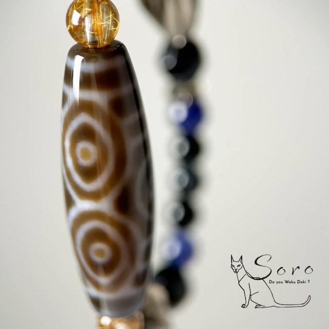 ご購入前に本文の注意書きを必ずお読みください 圧倒的な存在感を放つ龍眼天珠を主役に、 ルチルクォーツ、オニキス、サファイア、スモーキークォーツ、天眼石を組み合わせた重厚なブレスレット。 黒とブラウンを基調に、深いブルーとゴールドが差し込む、 静かな強さを纏う一本です。 ■ 龍眼天珠 「龍の眼」と「天の眼」を併せ持つ特別な守護紋様。 ● 龍の眼 = 強力な守護・邪気払い・成功への昇運 ● 天の眼 = すべてを見通す智慧・災難回避・洞察力 古来より “持ち主を常に見守り、危機から守る石”とされ、 経営者や勝負の世界に身を置く人々にも好まれてきました。 目の模様は「魔を見抜く」「真実を見通す」「道を誤らせない」 という意味を持つといわれています。 まさに ✔ 人を見る目 ✔ タイミングを見る目 ✔ 流れを読む力 を象徴する存在。 経営者や仕事を頑張る方にふさわしい、格のある守護天珠です。 ■ その他の石の意味 *ルチルクォーツ … 金運・成功運・突破力 *サファイア … 冷静な判断・誠実・集中力 *オニキス … 邪気除け・意志の強化 *スモーキークォーツ … 安定・地に足をつける力 *天眼石 … 魔除け・洞察力・精神の安定 これらの組み合わせは、 守護・判断力・勝負強さを兼ね備えたブレスレットです。 内径約17cm ¥25800 ------------------------------- 天然石の製品について以下の点にご注意ください 【個々の違い】 天然石は一つひとつ表情が異なるため、同じデザインでもお色味や模様が画像と異なる場合がございます。 一点もの表記以外の製品は可能な限り近いものをお届けするよう努めておりますが、予めご了承ください。 【サイズ変更】 サイズ変更をご希望の場合は備考欄にご希望の内径をご記載ください。 特にご指定がない場合は無料で調整させて頂きますが、備考欄から追加する石やデザインのご指定は承り兼ねます。 ※サイズ変更により本来のデザインと変わる場合がございます。(大幅な変更はございません) ※天然石の大きさによりジャストサイズへのご変更は難しくなっております。出来る限り近いサイズに調整させて頂きますのでご了承下さい。 特定の石を追加したい場合は有料となますので、公式ラインよりお問い合わせください。 •【掲載画像】 掲載している画像は弊社スタッフが撮影したものです。 出来る限り実物と相違がない様撮影しておりますが、デバイスにより見え方が違う場合もございますのでご理解をお願い申し上げます。 【天然石の特性】 天然石のため細かな欠けや凹み、歪み、クラックなどがある場合があります。 【サイズの誤差】 サイズは目安であり細かな誤差が生じる場合があります。 これらの点をご理解の上、ご購入いただきますようお願いいたします -------------------------------