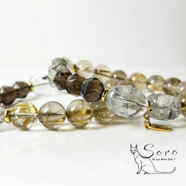 【ご購入前に本文の注意書きを必ずお読みください】 金の針が鋭く輝く11mmルチルクォーツを主役に、エレスチャルクォーツ、ダイヤモンド原石、ハーキマーダイヤモンド、スモーキークォーツを組み合わせた特別仕様のブレスレット。 華美ではなく、本質的な強さを宿す一本。 静かな重厚感が、責任ある立場の手元にふさわしい存在感を放ちます。 ≪ 石ごとの代表的な意味 ≫ *ルチルクォーツ … 金運・事業成功・突破力 *エレスチャルクォーツ … 魂の覚醒・大局的視点・浄化 *ダイヤモンド原石 … 揺るがぬ意志・決断力・永続 *ハーキマーダイヤモンド … 直感力・エネルギー活性・目標実現 *スモーキークォーツ … 邪気除け・精神安定・現実力 ルチルは「経営の石」とも呼ばれることがあるほど、成功者に支持されてきたストーン。 金色の針は“情報とチャンスを掴むアンテナ”の象徴ともいわれ、 決断の瞬間に迷いを断ち切る突破力を与えるとされています。 資金・人脈・タイミング。 流れを読む力と、動く勇気を後押しする石です。 エレスチャルが長期的視野をもたらし、 ダイヤモンド原石が「折れない芯」を象徴。 ハーキマーが直感を研ぎ澄まし、 スモーキークォーツが足元を固める。 理想と現実、攻めと守り。 その両方を兼ね備えた、経営者のための設計。 挑戦を続ける方へ。 守るべきものがある方へ。 決断を下す立場の方へ。 覚醒と成功を同時に引き寄せる、 本物志向のためのルチル主役ブレスレット。 内径:17.5cm ¥37300+tax ------------------------------- 天然石の製品について以下の点にご注意ください 【個々の違い】 天然石は一つひとつ表情が異なるため、同じデザインでもお色味や模様が画像と異なる場合がございます。 一点もの表記以外の製品は可能な限り近いものをお届けするよう努めておりますが、予めご了承ください。 【サイズ変更】 サイズ変更をご希望の場合は備考欄にご希望の内径をご記載ください。 特にご指定がない場合は無料で調整させて頂きますが、備考欄から追加する石やデザインのご指定は承り兼ねます。 ※サイズ変更により本来のデザインと変わる場合がございます。(大幅な変更はございません) ※天然石の大きさによりジャストサイズへのご変更は難しくなっております。出来る限り近いサイズに調整させて頂きますのでご了承下さい。 特定の石を追加したい場合は有料となますので、公式ラインよりお問い合わせください。 •【掲載画像】 掲載している画像は弊社スタッフが撮影したものです。 出来る限り実物と相違がない様撮影しておりますが、デバイスにより見え方が違う場合もございますのでご理解をお願い申し上げます。 【天然石の特性】 天然石のため細かな欠けや凹み、歪み、クラックなどがある場合があります。 【サイズの誤差】 サイズは目安であり細かな誤差が生じる場合があります。 これらの点をご理解の上、ご購入いただきますようお願いいたします -------------------------------