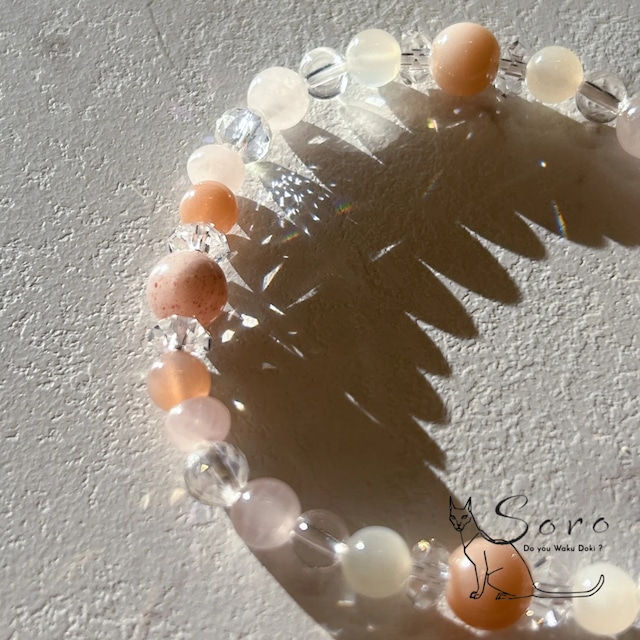 ご購入前の本文の注意書きを必ずお読みください ホワイト~ベージュのムーンストーンの穏やかで柔らかな色合いと、淡いピンクが愛らしいローズクォーツに清らかな水晶を組み合わせた恋愛系ブレスレット。 愛に向き合う心をやさしく包み込み、自然体の魅力を引き出します。 ≪ 石ごとの代表的な効果 ≫ *ムーンストーン … 恋愛運・感情の安定・女性性 *水晶 … 浄化・良縁引き寄せ・エネルギー調整 *ローズクォーツ … 恋愛成就・自己愛・心の癒し ムーンストーンが恋のタイミングやご縁を整え、水晶が不要な感情や迷いを浄化。そこへローズクォーツのやさしい愛のエネルギーが重なり、愛を受け取り、与える心を育ててくれる組み合わせです。 新しい出会いを望む方にも、大切な人との関係を深めたい方にもおすすめ。 恋を焦らず、自然な流れで育てたい時にそっと寄り添う、やさしい恋愛のお守りブレスレットです。 サイズ 内径16cm ¥5260+tax ------------------------------- 天然石の製品について以下の点にご注意ください 【個々の違い】 天然石は一つひとつ表情が異なるため、同じデザインでもお色味や模様が画像と異なる場合がございます。 一点もの表記以外の製品は可能な限り近いものをお届けするよう努めておりますが、予めご了承ください。 【サイズ変更】 サイズ変更をご希望の場合は備考欄にご希望の内径をご記載ください。 特にご指定がない場合は無料で調整させて頂きますが、備考欄から追加する石やデザインのご指定は承り兼ねます。 ※サイズ変更により本来のデザインと変わる場合がございます。(大幅な変更はございません) ※天然石の大きさによりジャストサイズへのご変更は難しくなっております。出来る限り近いサイズに調整させて頂きますのでご了承下さい。 特定の石を追加したい場合は有料となますので、公式ラインよりお問い合わせください。 •【掲載画像】 掲載している画像は弊社スタッフが撮影したものです。 出来る限り実物と相違がない様撮影しておりますが、デバイスにより見え方が違う場合もございますのでご理解をお願い申し上げます。 【天然石の特性】 天然石のため細かな欠けや凹み、歪み、クラックなどがある場合があります。 【サイズの誤差】 サイズは目安であり細かな誤差が生じる場合があります。 これらの点をご理解の上、ご購入いただきますようお願いいたします -------------------------------