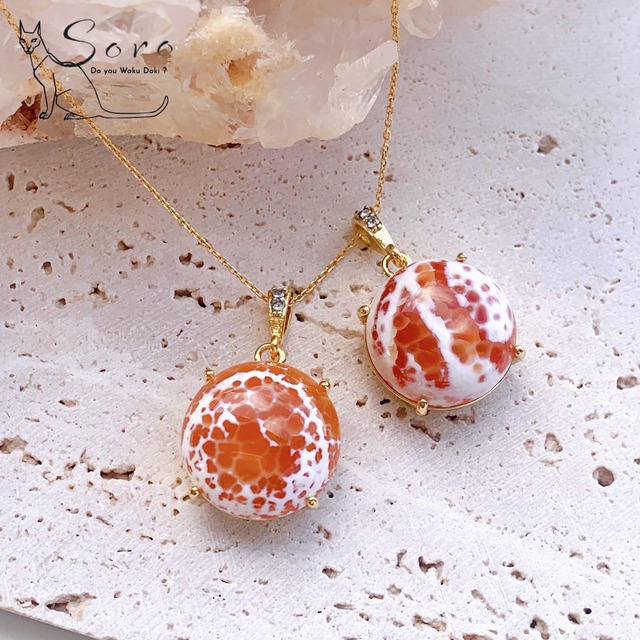 ご購入前に本文の注意書きを必ずご覧ください ジューシーなオレンジとホワイトの模様が印象的なブラジル産のファイアアゲート。 自然が描いたアートのような斑紋は、一点ごとに異なる唯一無二の表情を持っています。 丸みのあるフォルムが柔らかさを演出しつつ、 内側から灯るような温かいカラーが胸元に存在感を与えてくれるペンダントトップです。 ファイアアゲートは「情熱」「活力」「行動力」を象徴する石。 停滞したエネルギーを動かし、前向きな一歩を踏み出すサポートをするといわれています。 自信を持って挑戦したいときや、新しいスタートのお守りとしても人気があります。 オレンジは豊かさや創造性の色。 心を明るく照らし、人とのご縁やチャンスを引き寄せるともいわれています。 ▶代表的な意味 ・行動力アップ ・自信と勇気を高める ・チャンスを引き寄せる ・エネルギー活性 ・前向きな変化 内に秘めた“火”を灯すような存在。 新しい挑戦を後押ししてくれる、力強いファイアアゲートのペンダントトップです。 ブラジル産ファイヤーアゲート ペンダントトップ ¥5,320+tax 素材: ステンレス サイズ: 約2.8×2.8cm(金具含まない) ※チェーンは別売りとなります。 ------------------------------- •【掲載画像】 掲載している画像は弊社スタッフが撮影したものです。 出来る限り実物と相違がない様撮影しておりますが、デバイスにより見え方が違う場合もございますのでご理解をお願い申し上げます。 【天然石の特性】 天然石のため細かな欠けや凹み、歪み、クラックなどがある場合があります。 【サイズの誤差】 サイズは目安であり細かな誤差が生じる場合があります。 これらの点をご理解の上、ご購入いただきますようお願いいたします ※その他、ご質問等は公式ラインまたはInstagramよりお気軽にお問い合わせください。