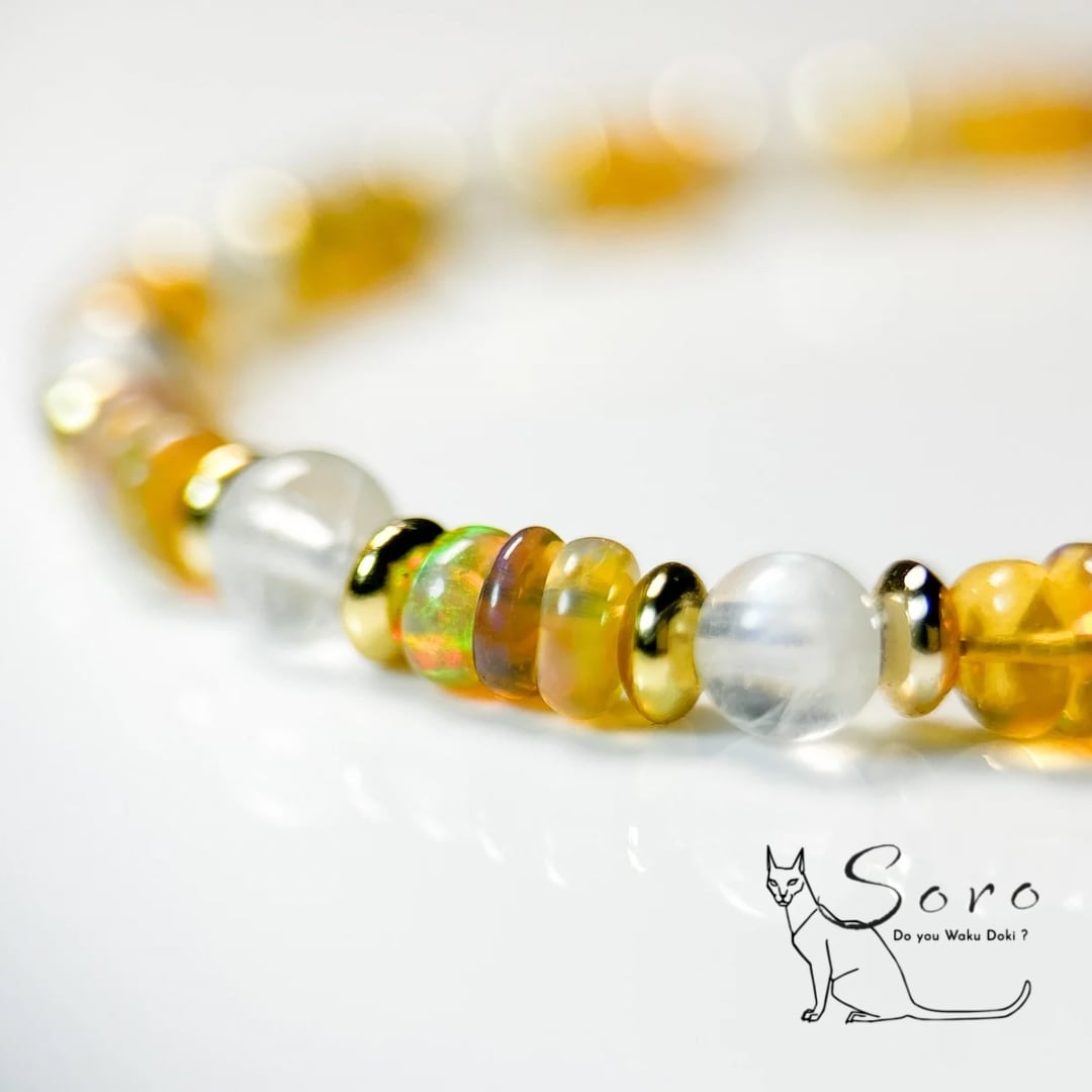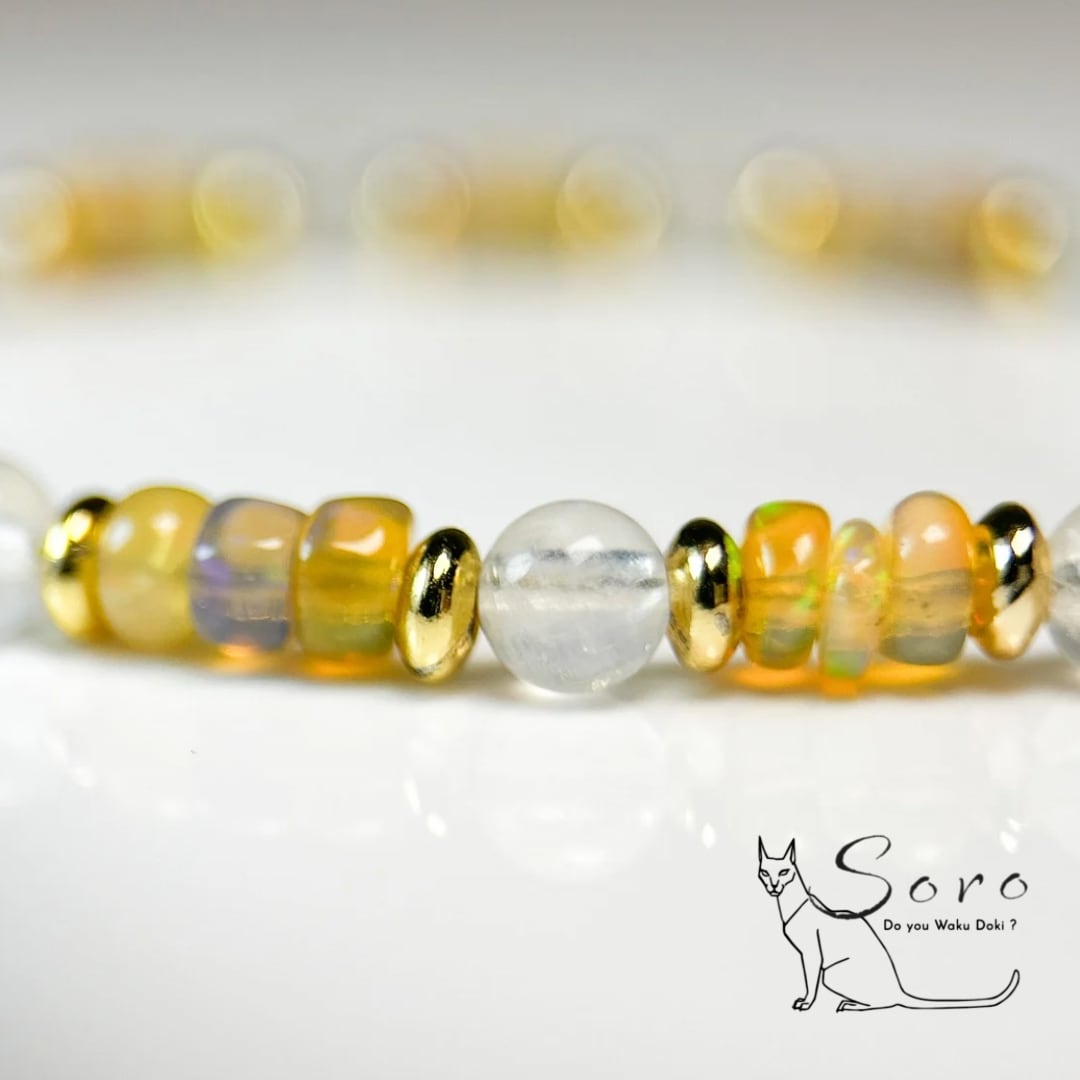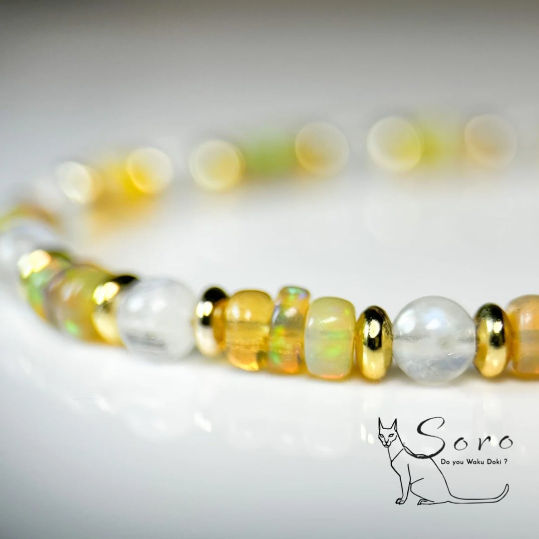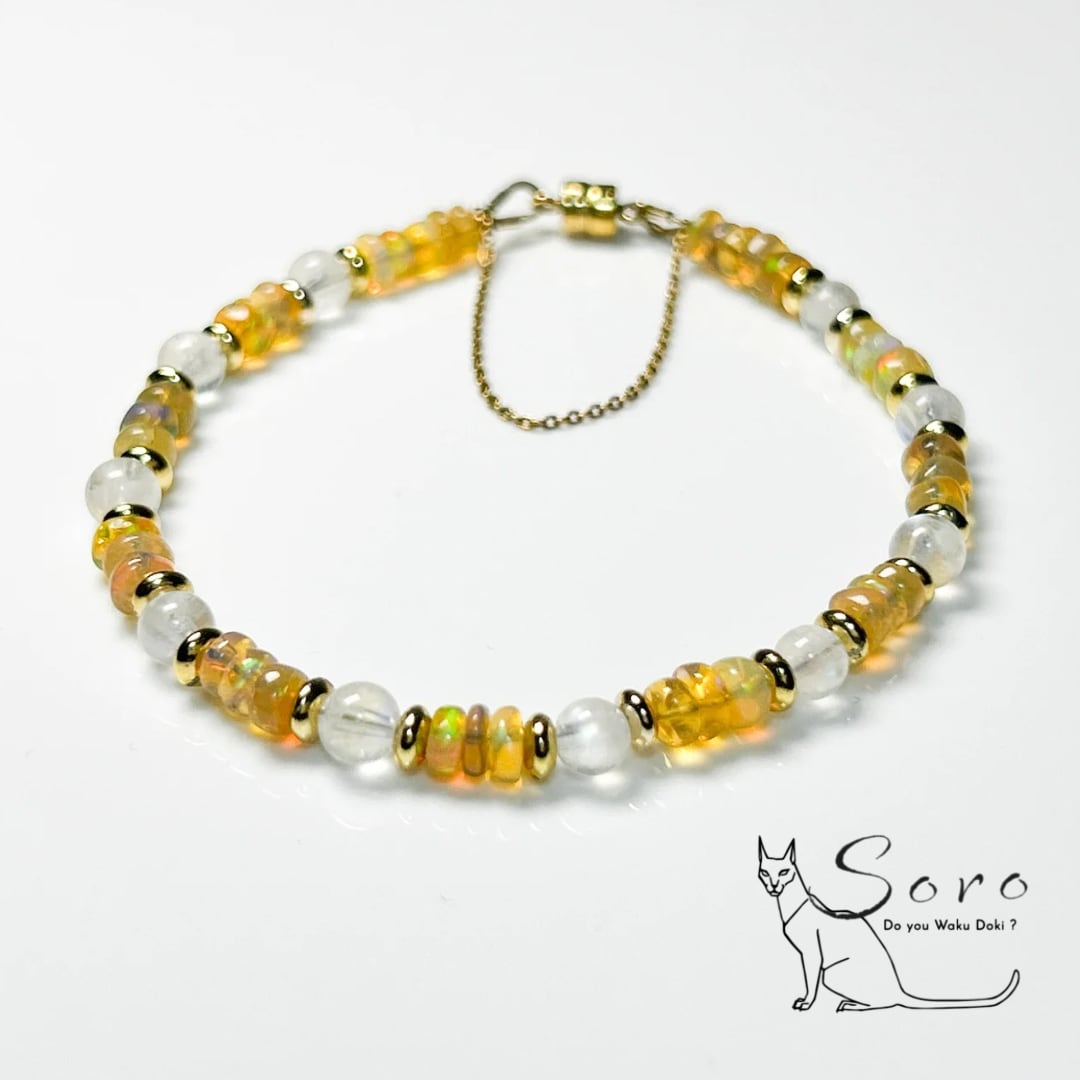 虹色の遊色が美しいプレシャスオパールを組み合わせた、繊細で上品な華奢ブレスレット。