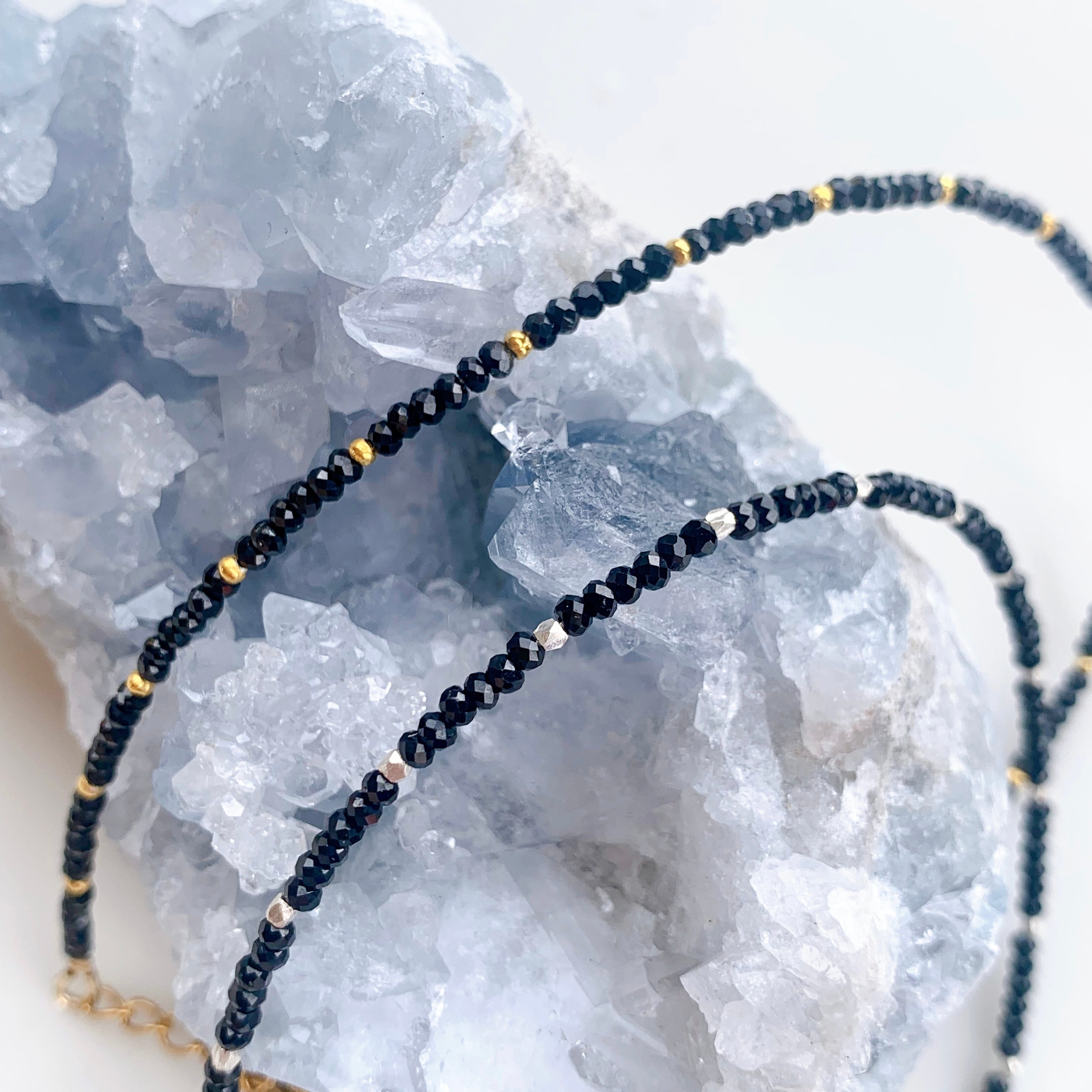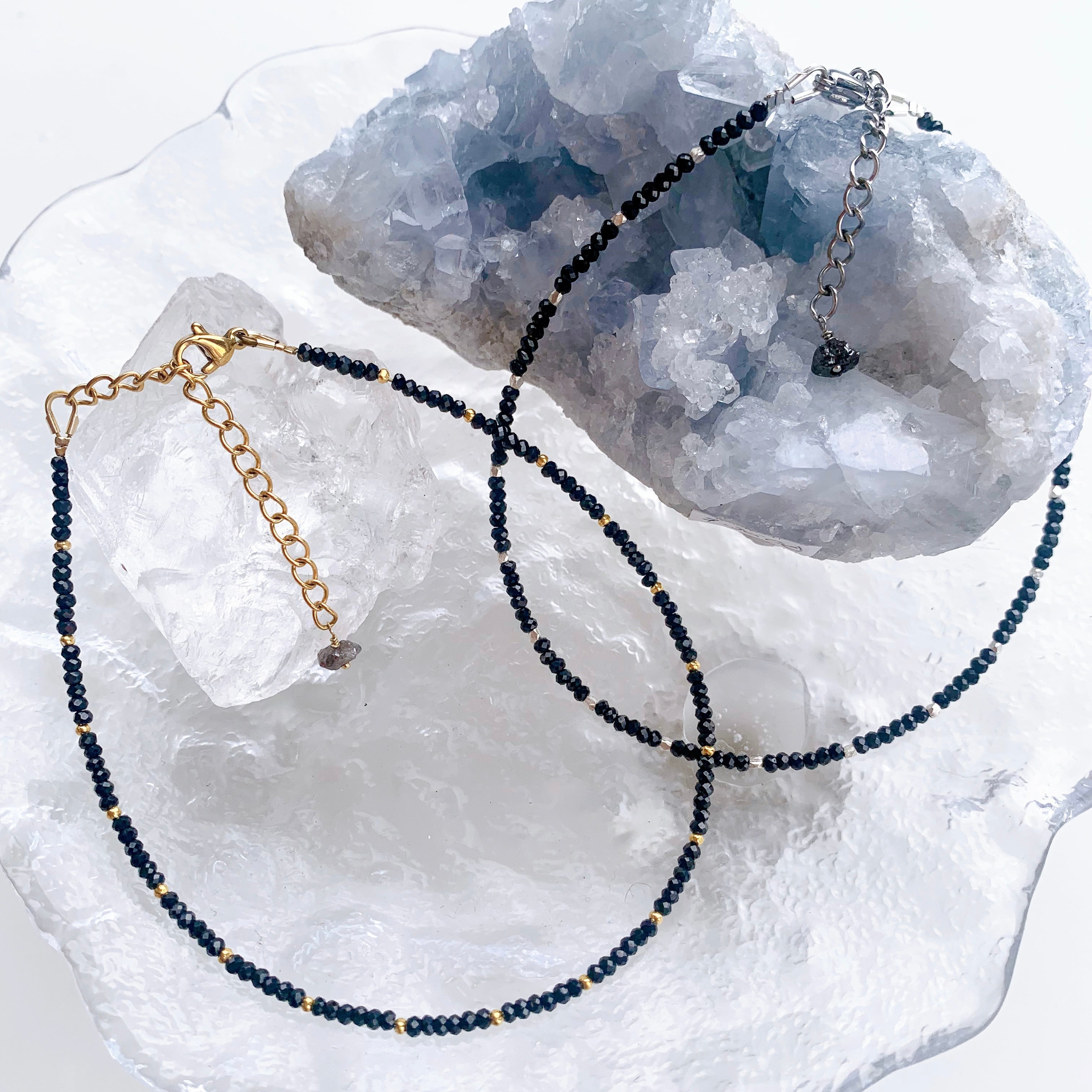 繊細な輝きを放つブラックスピネルをベースに、希少なブラウンダイヤモンドとブラックダイヤモンドをアクセントに配置した、大人のためのラグジュアリーアンクレット。