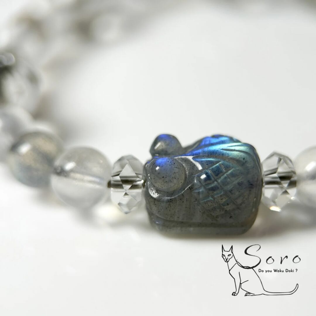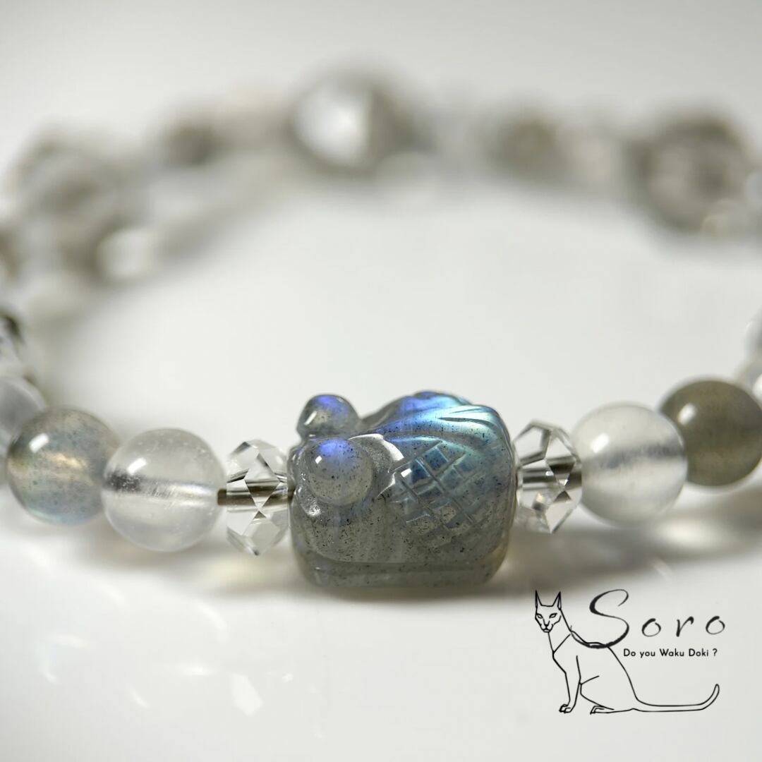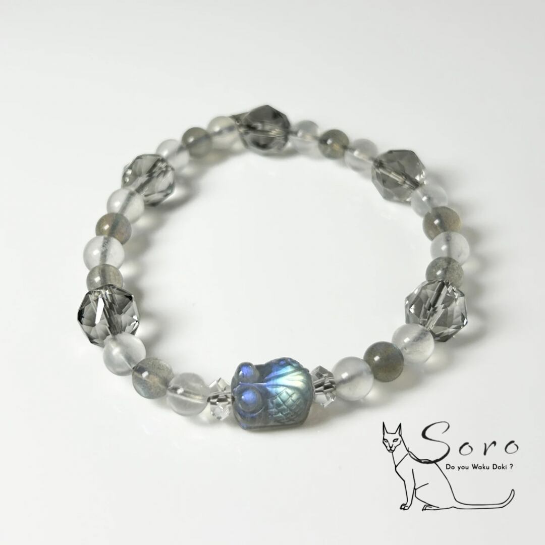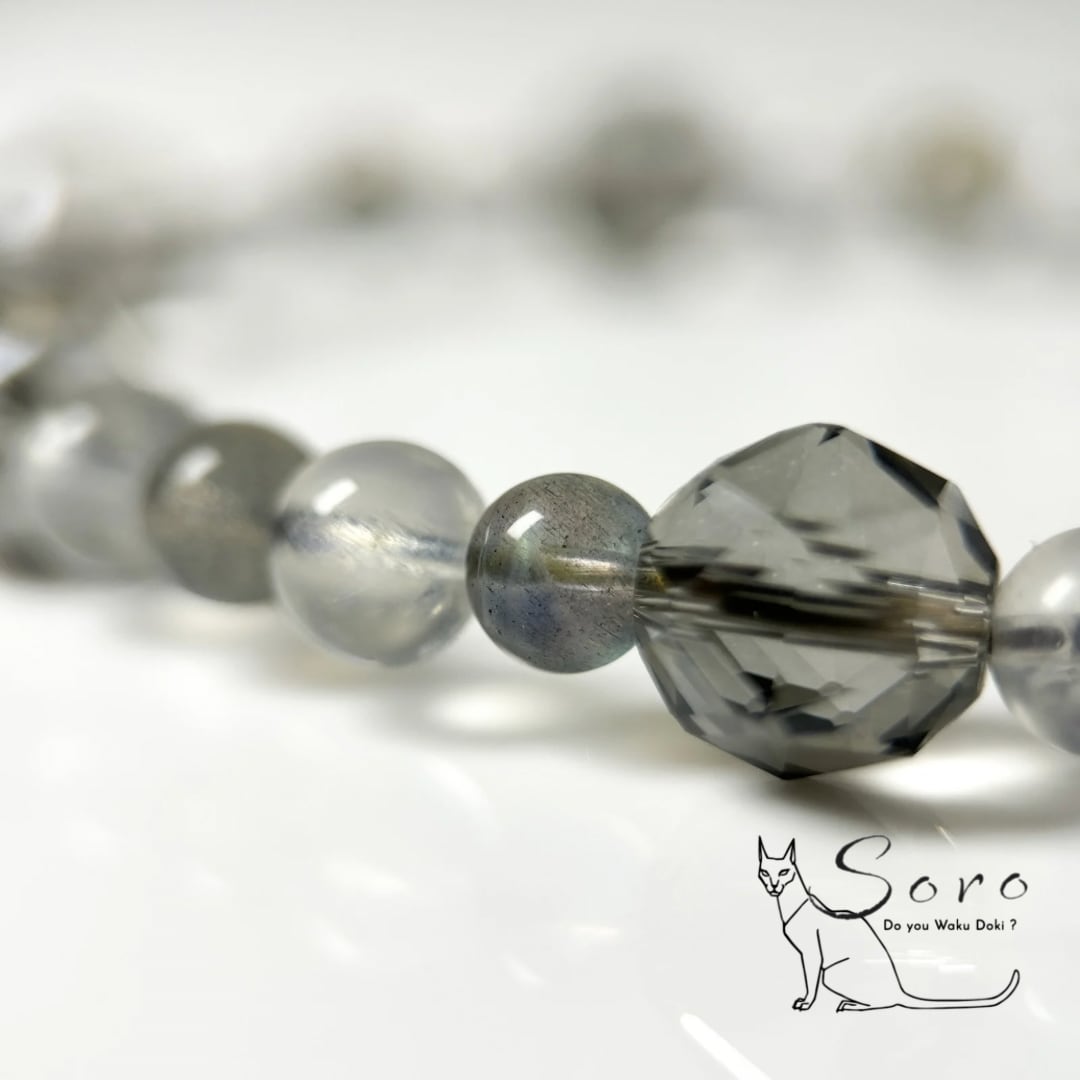 幻想的なシラーを放つラブラドライトの蝉ビーズを中心に、水晶、ブルームーンストーン(ホワイトラブラドライト)、ミッドナイトオーラ水晶を組み合わせた神秘的なブレスレット。