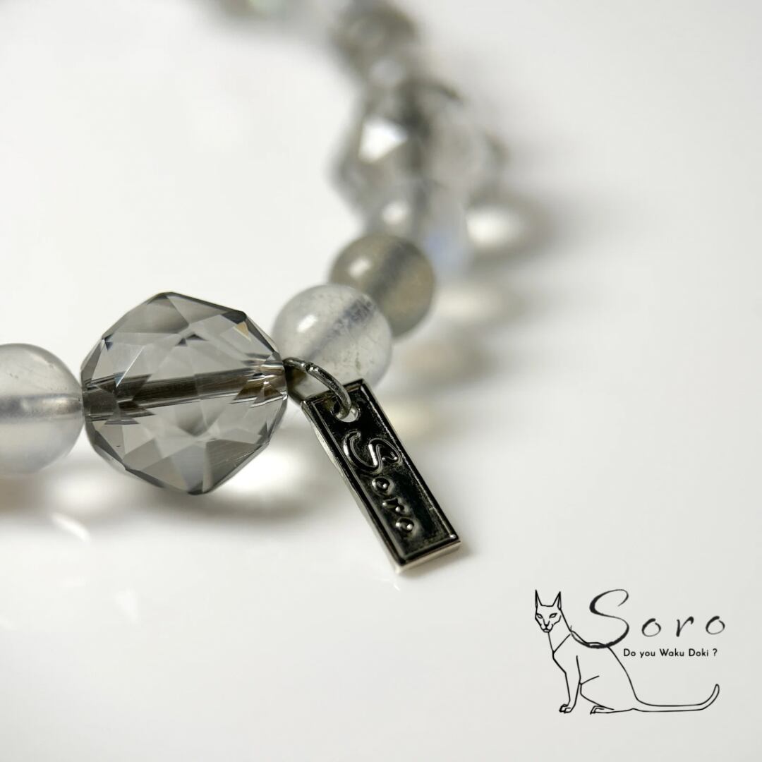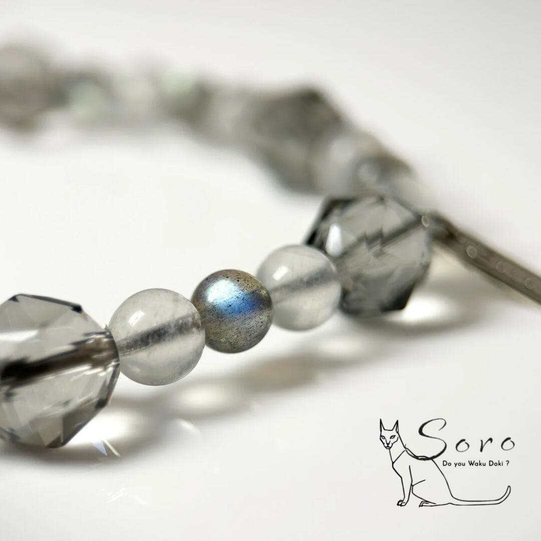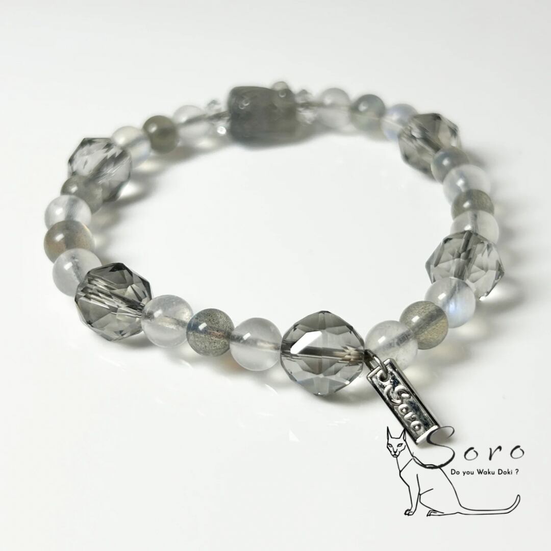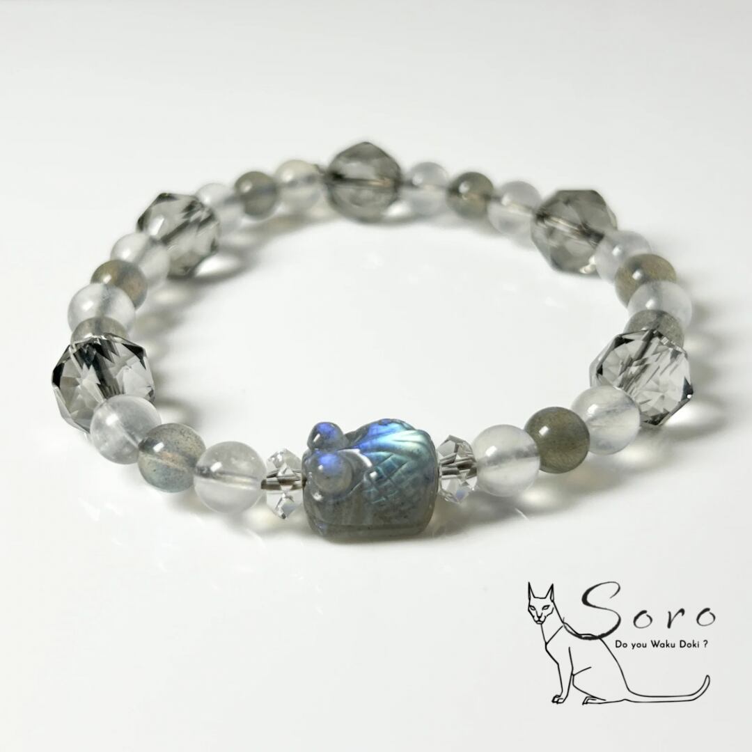 幻想的なシラーを放つラブラドライトの蝉ビーズを中心に、水晶、ブルームーンストーン(ホワイトラブラドライト)、ミッドナイトオーラ水晶を組み合わせた神秘的なブレスレット。