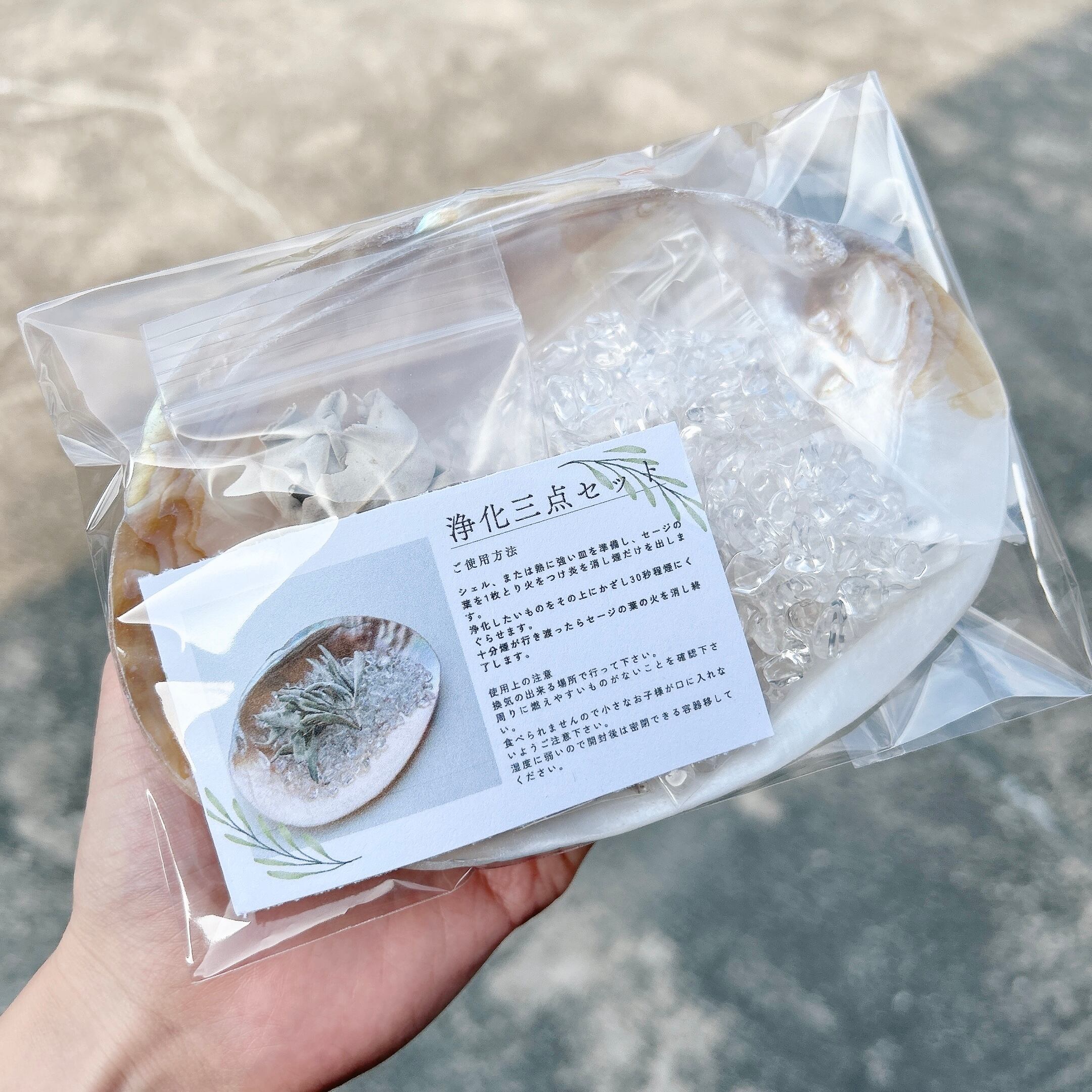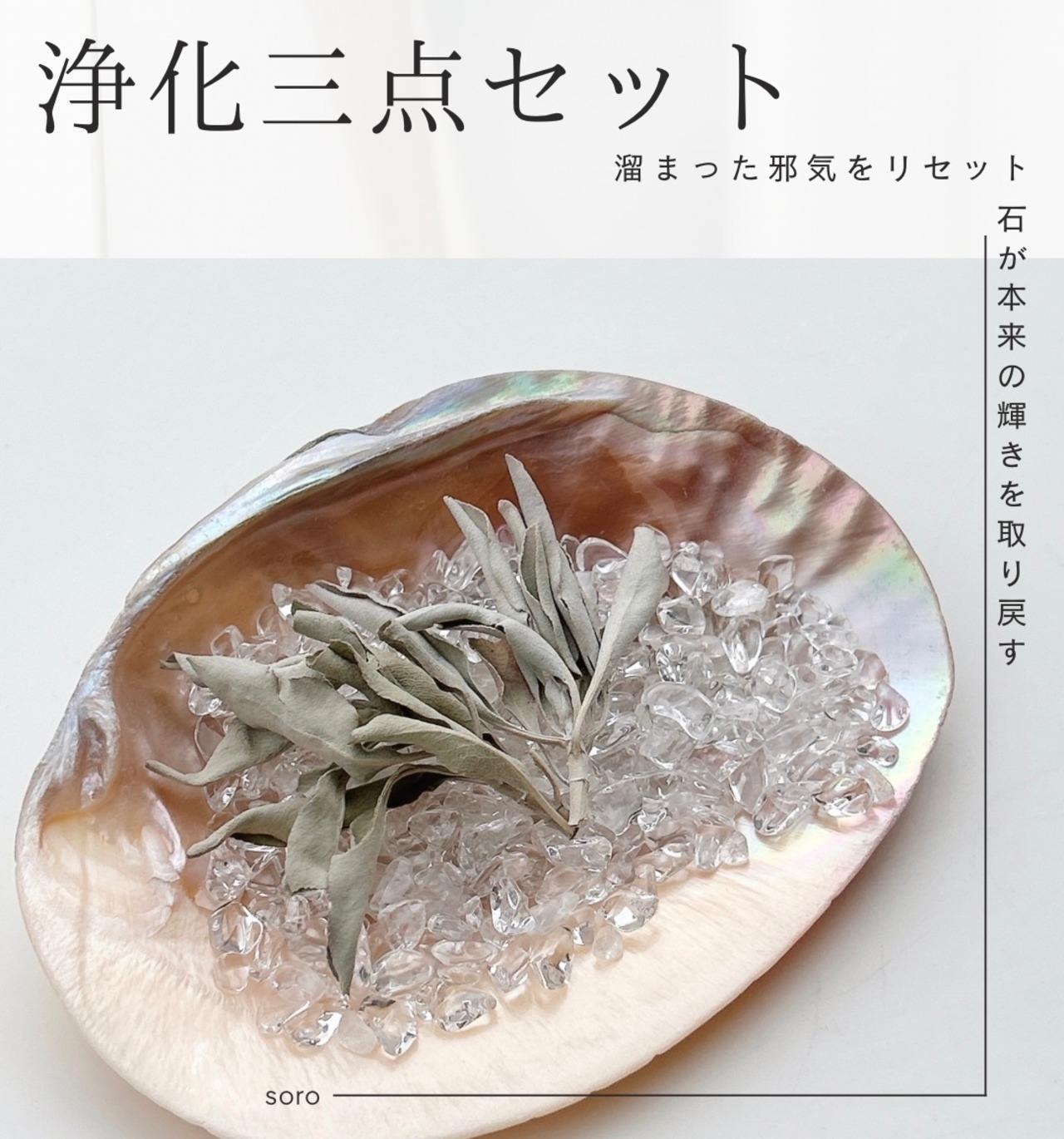 あ る い は セ ー ジ に 火 を つ け ず に、水 晶 をひい た パ ー ル シ ェ ル の 小 皿 で パ ワ ー ス ト ー ン を 浄 化 さ せ る の も ◎