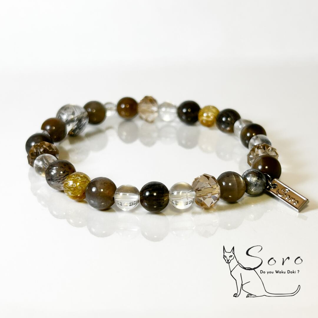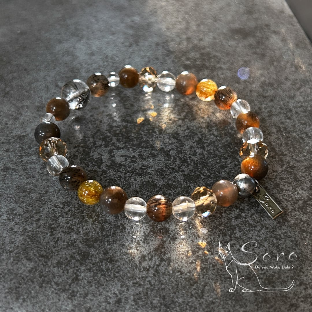 宇宙由来のエネルギーを宿すギベオン隕石をはじめ、力強い成長を象徴するエレスチャルクォーツ、金色の針が輝くルチルクォーツ、深い陰影をもつブラックサンムーンストーン、清らかな水晶を組み合わせたブレスレット。