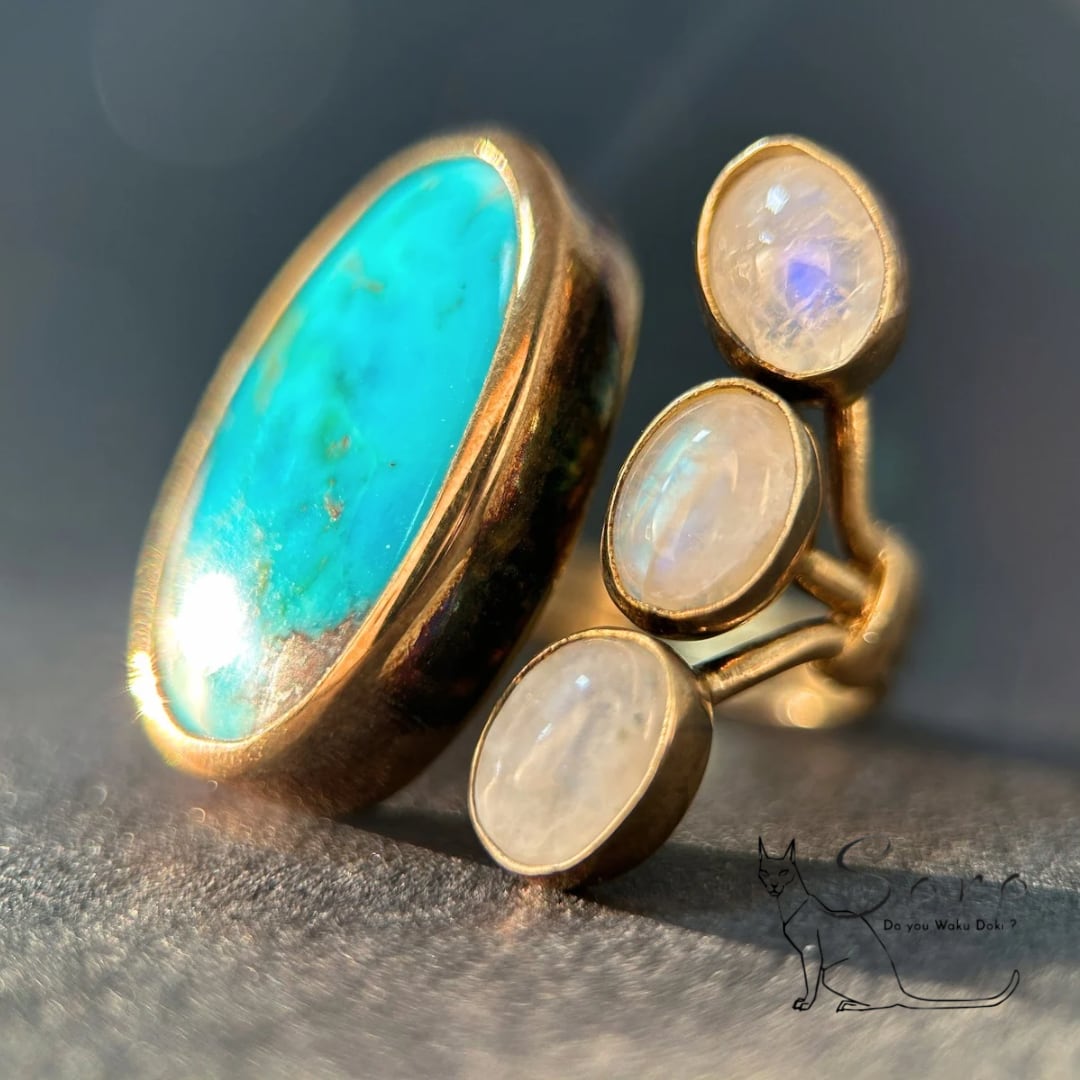 鮮やかなブルーが印象的なターコイズと、幻想的なシラーを放つブルームーンストーンを組み合わせたリング。