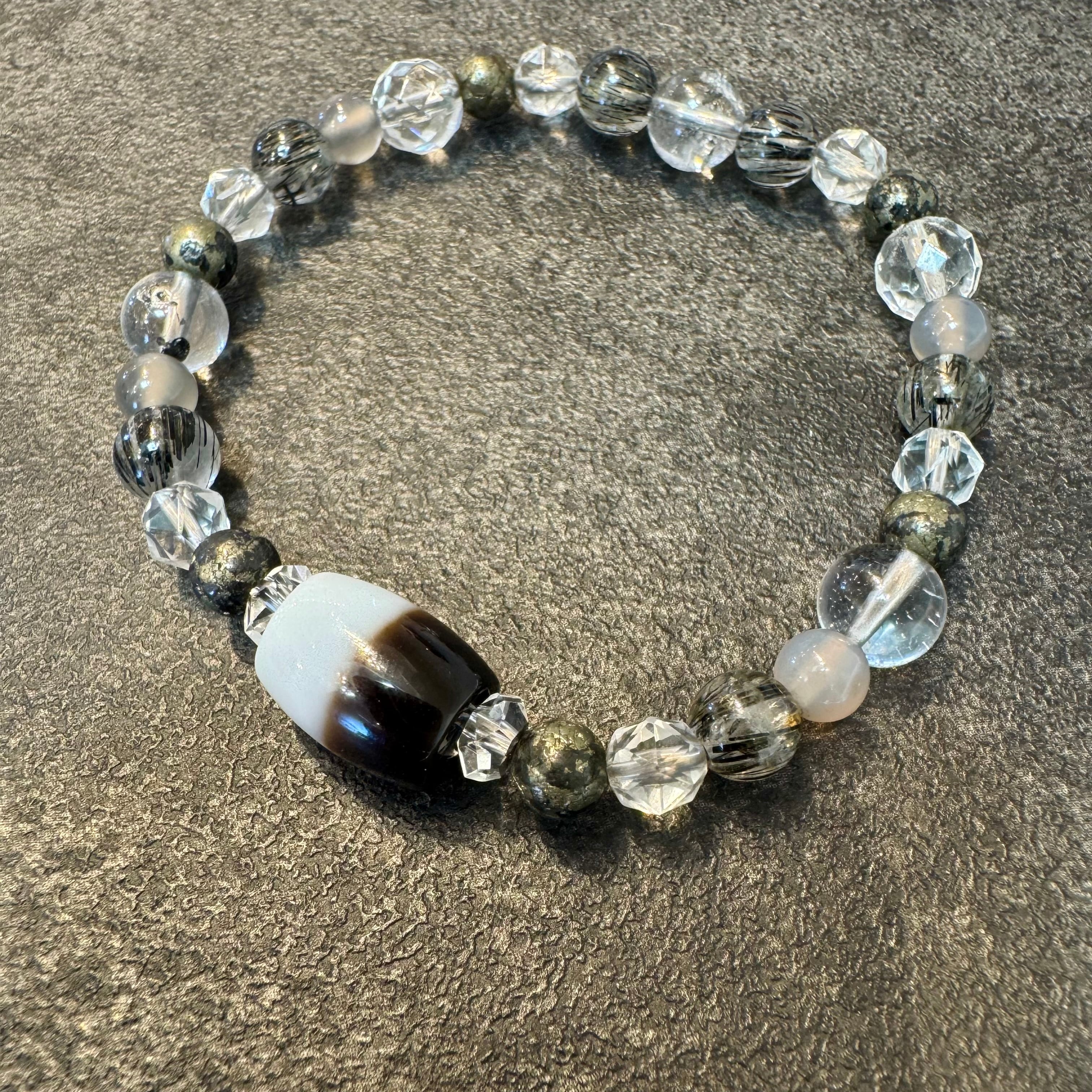 白黒天珠、エレスチャル、パイライト、ブラックトルマリンブレスレット