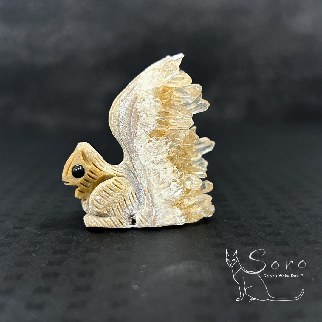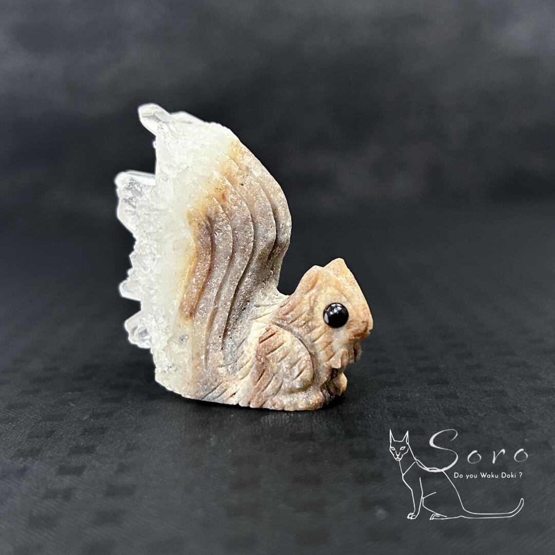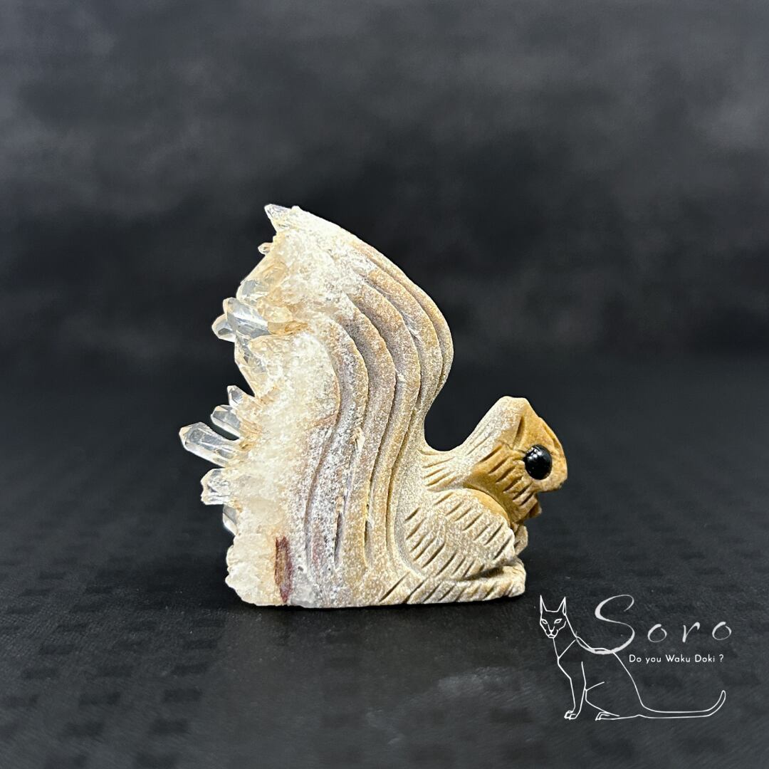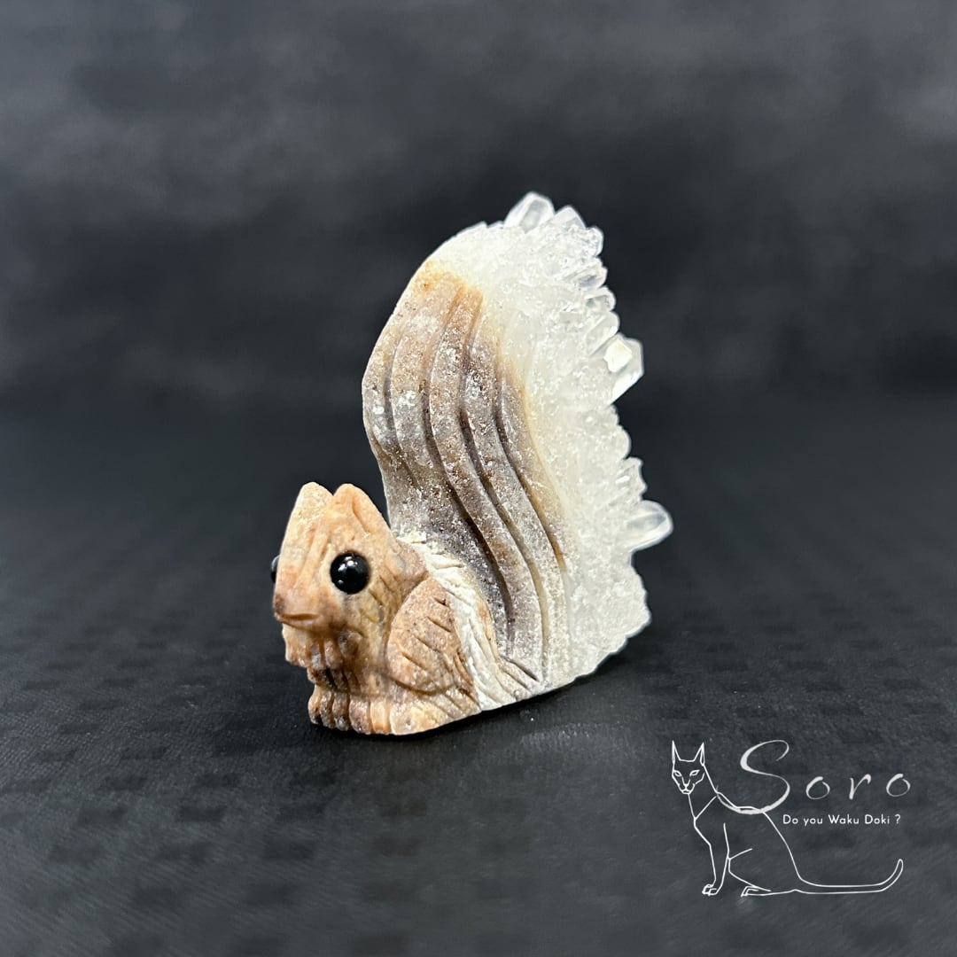 繊細に彫られた愛らしいリスの姿と、自然のままの結晶が広がるクラスター部分が融合した、特別感あふれる一点です。
