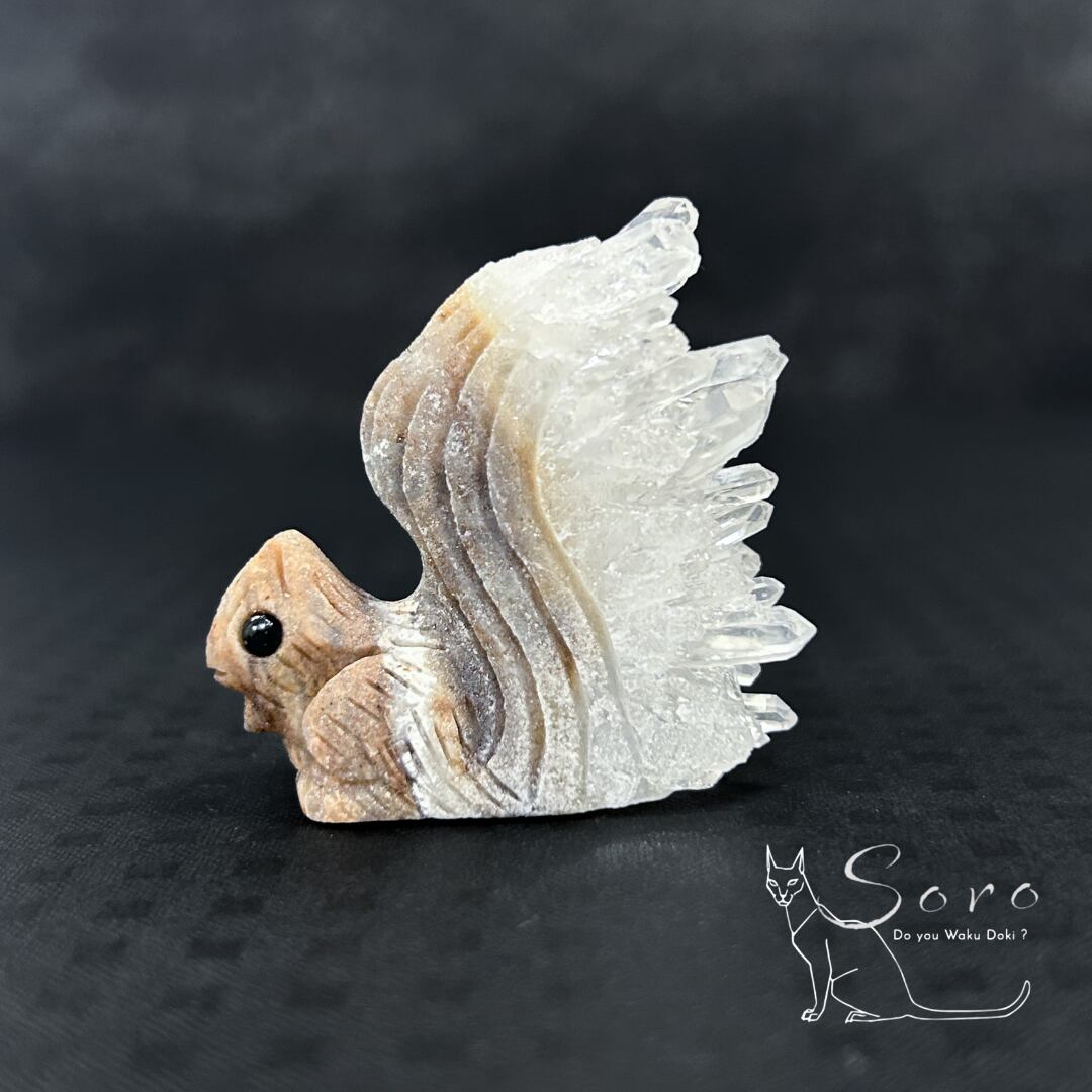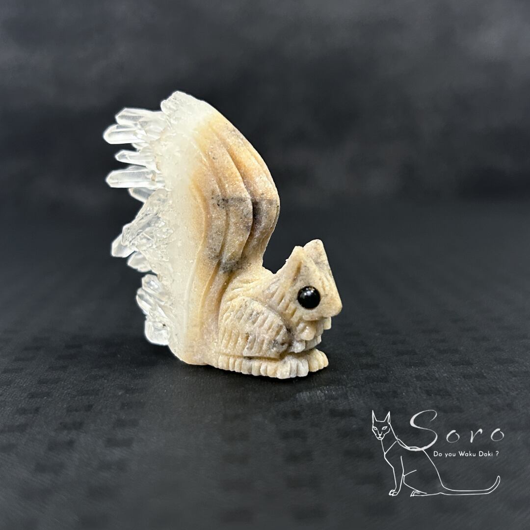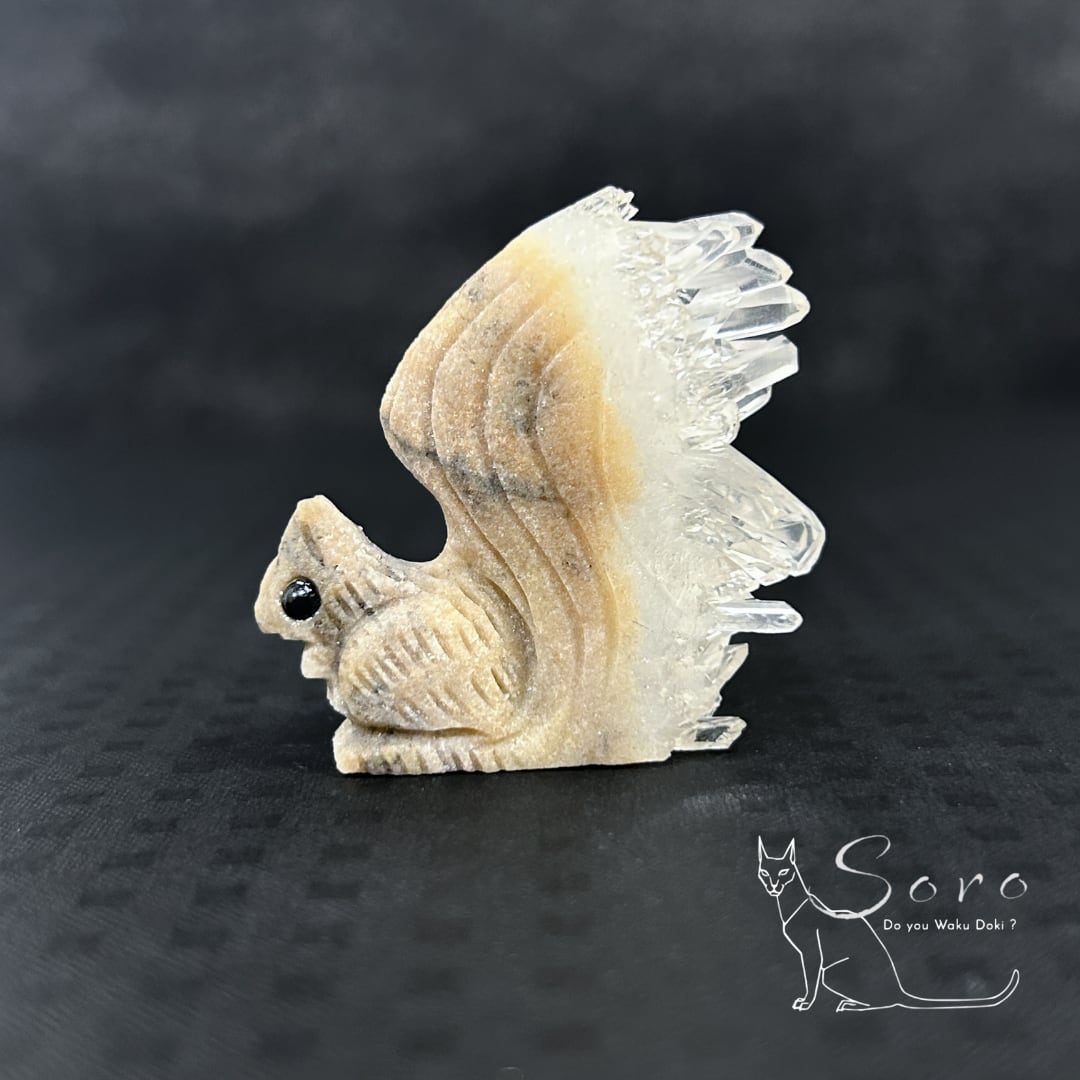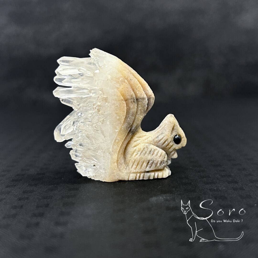 繊細に彫られた愛らしいリスの姿と、自然のままの結晶が広がるクラスター部分が融合した、特別感あふれる一点です。
