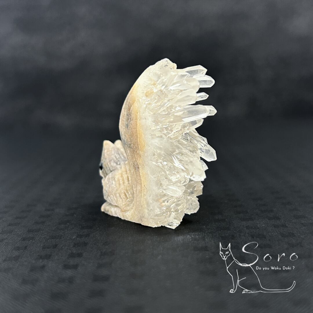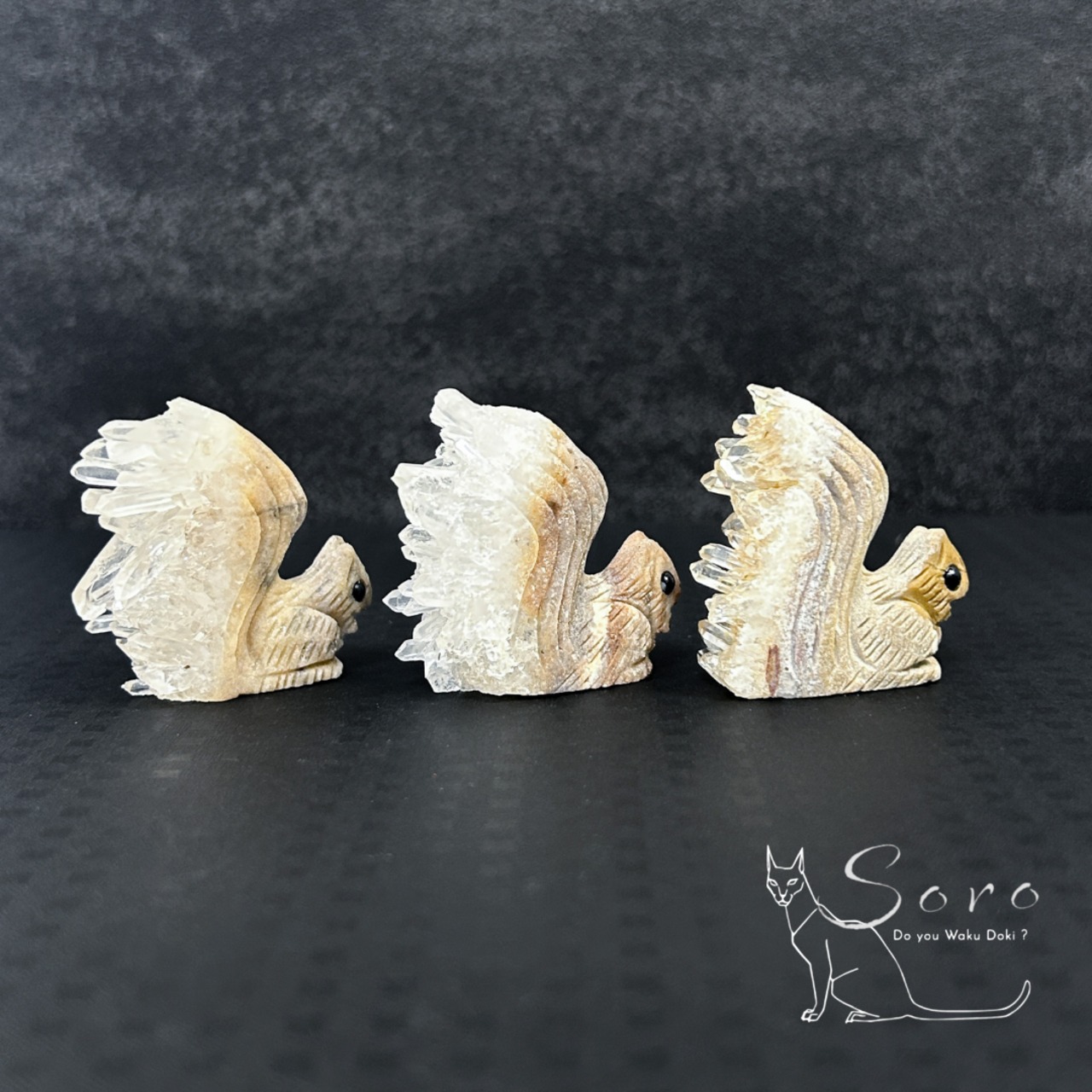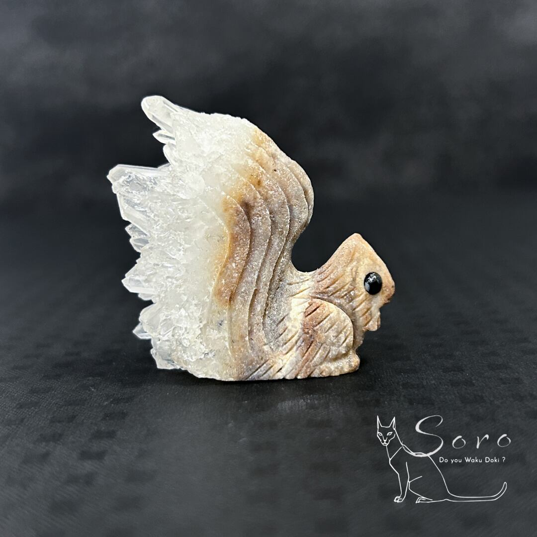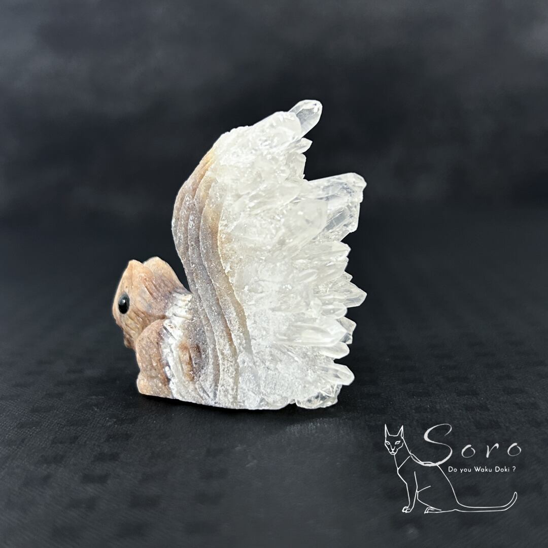 繊細に彫られた愛らしいリスの姿と、自然のままの結晶が広がるクラスター部分が融合した、特別感あふれる一点です。
