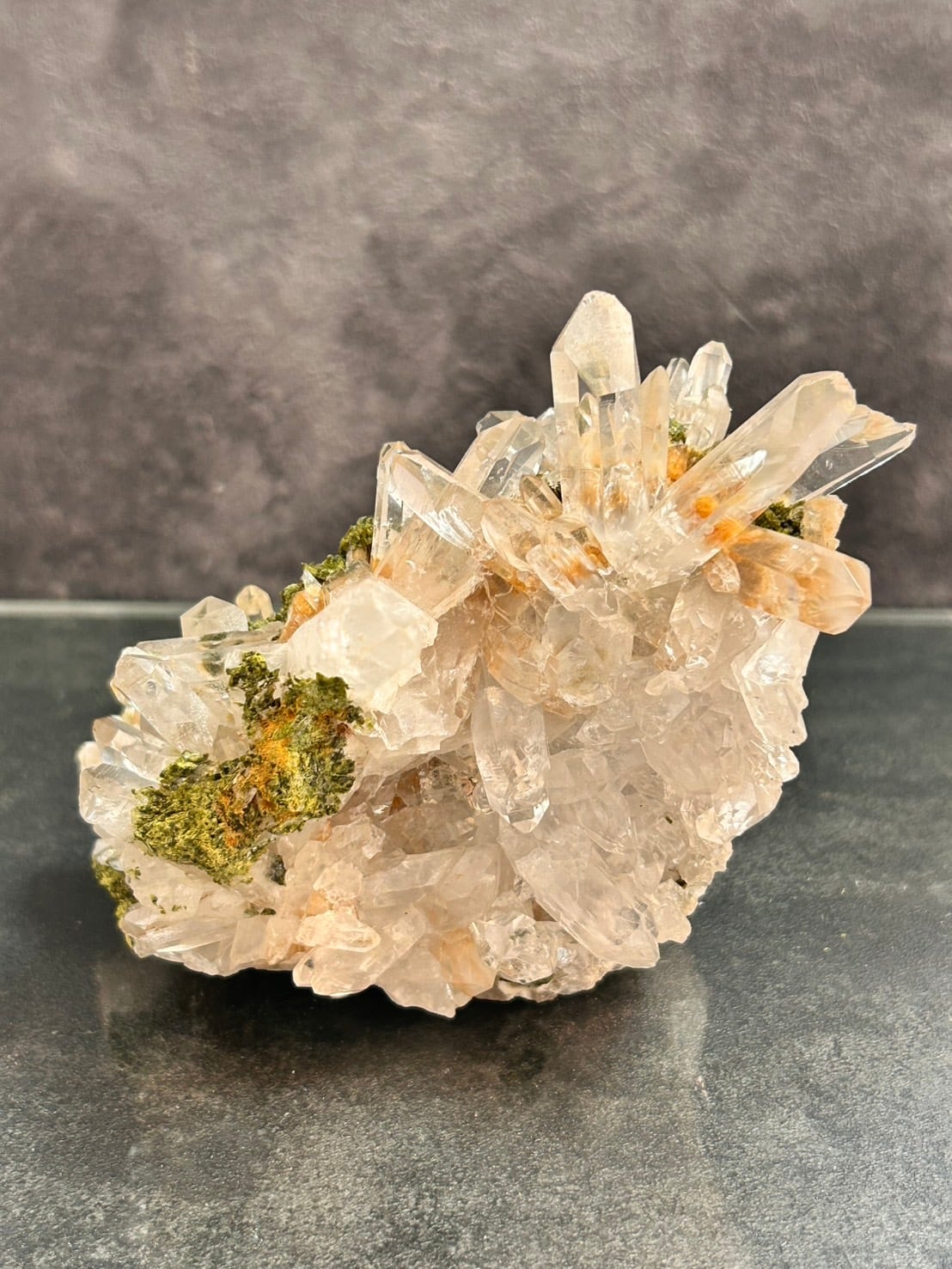 透明感のある水晶に、深いグリーンを宿すエピドート(緑簾石)が共生した美しい原石です。