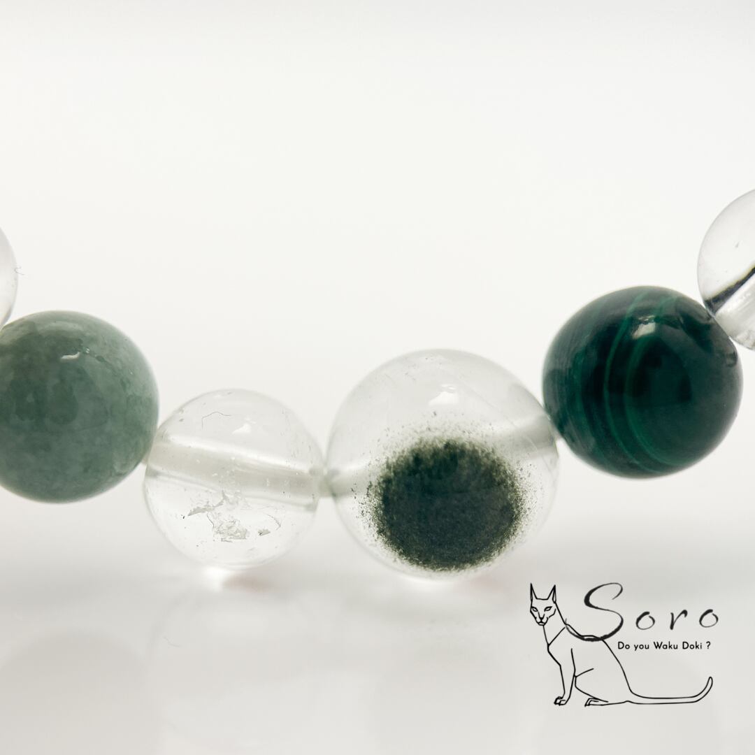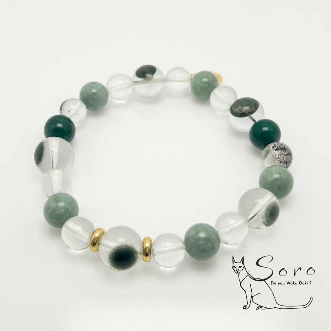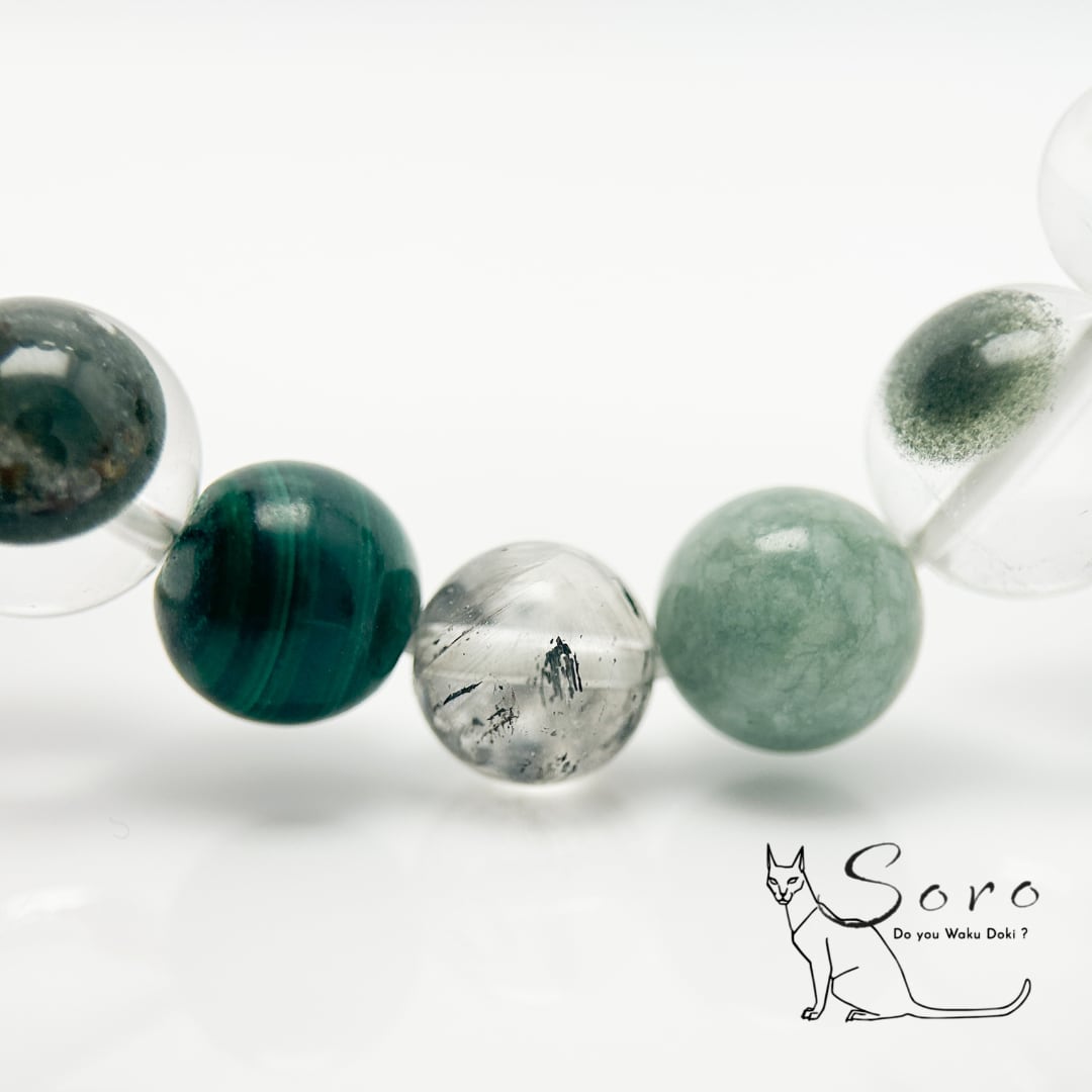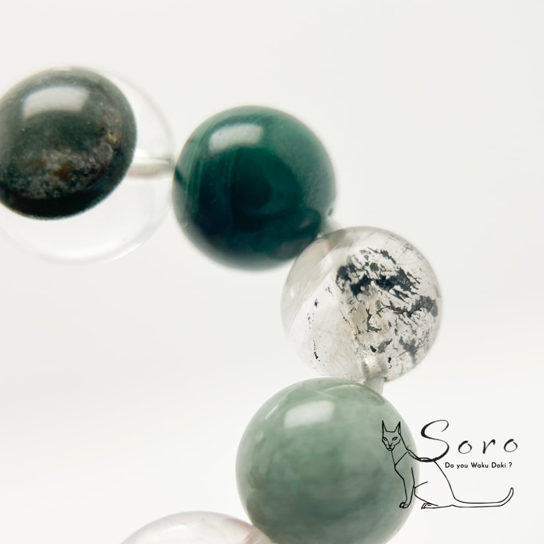 天眼模様が印象的なグリーンファントムを主役に、翡翠・エレスチャルクォーツ・マラカイトを組み合わせ、