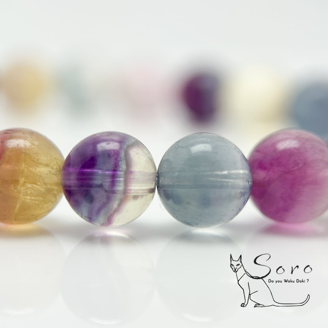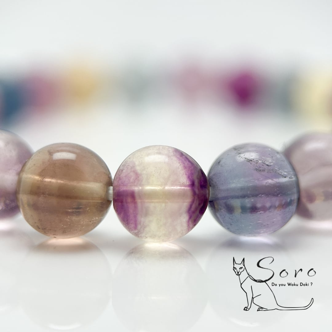 透明感あふれるパープル・ブルー・グリーン・イエローが、そっと溶け合うように並ぶマルチカラーフローライト。
