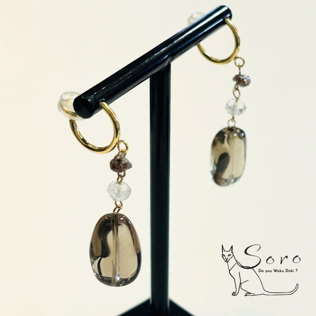 コロンと大きめなスモーキークォーツと、ブラウンダイヤモンド、レインボームーンストーンを組み合わせ、落ち着いた上品なデザインのフープタイプのイヤリングです⟡.*