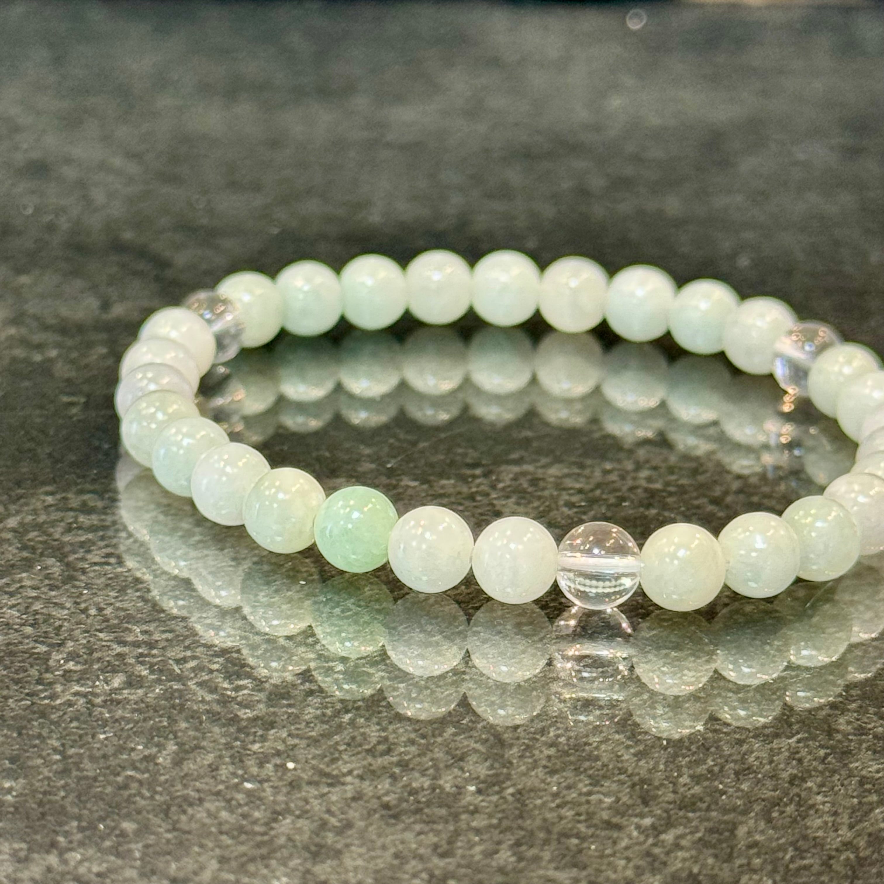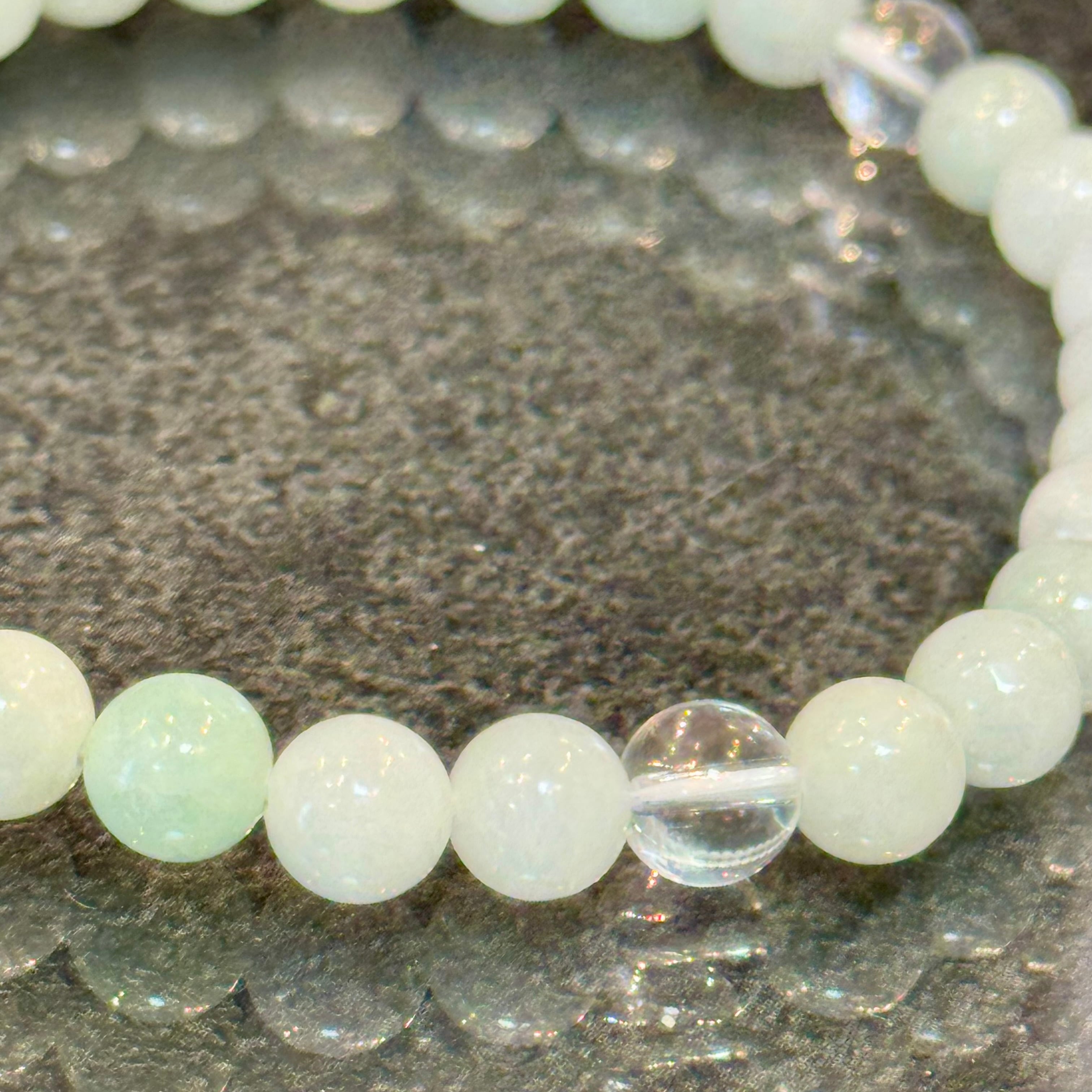 翡翠の「災いから守る力」と水晶の「浄化力」が融合し、ネガティブなエネルギーを遠ざける強力な守護ブレスに。