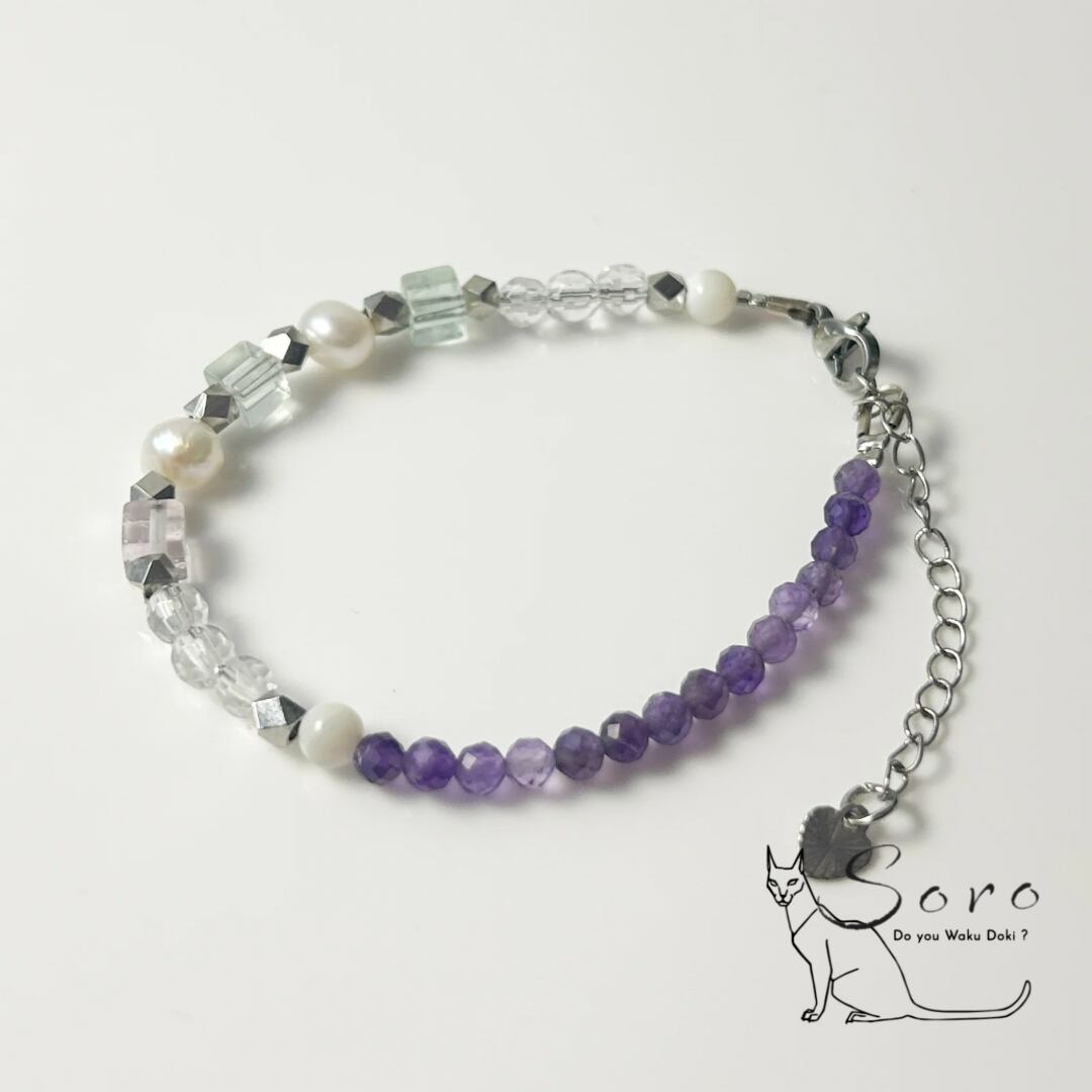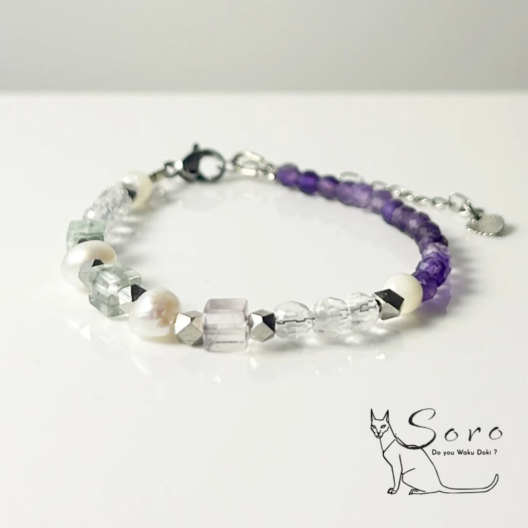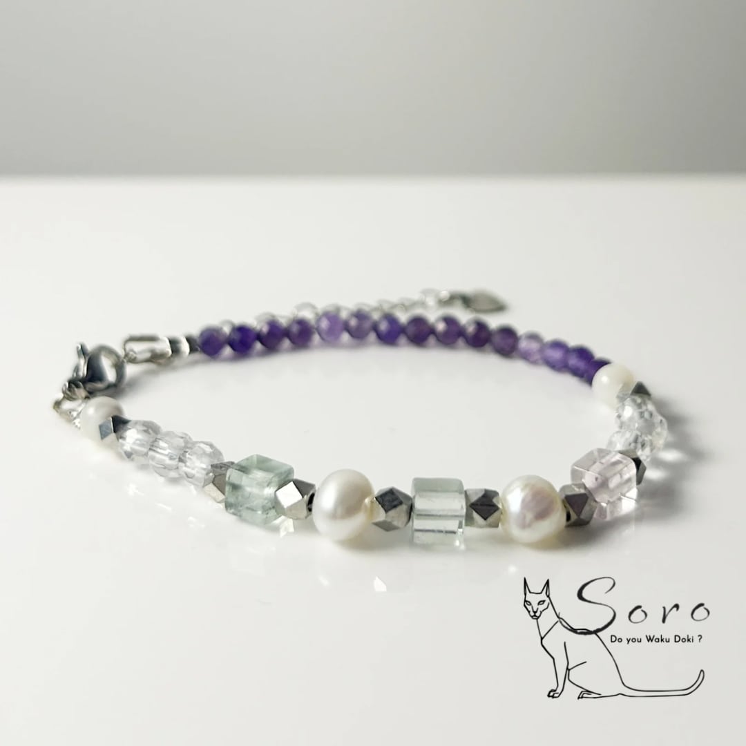 深みのある紫が美しいアメジストに、やわらかな色合いのフローライト、清らかな水晶、上品な艶を放つ淡水パールを組み合わせたブレスレット。