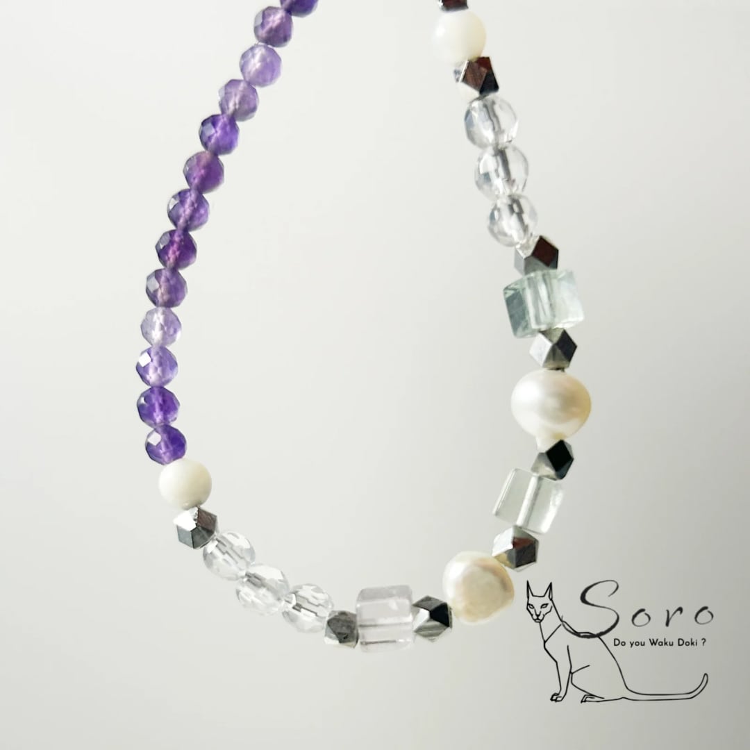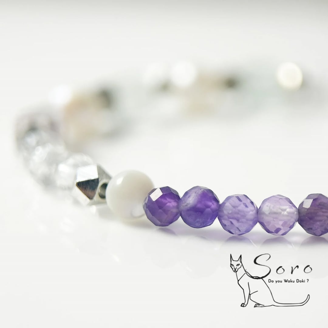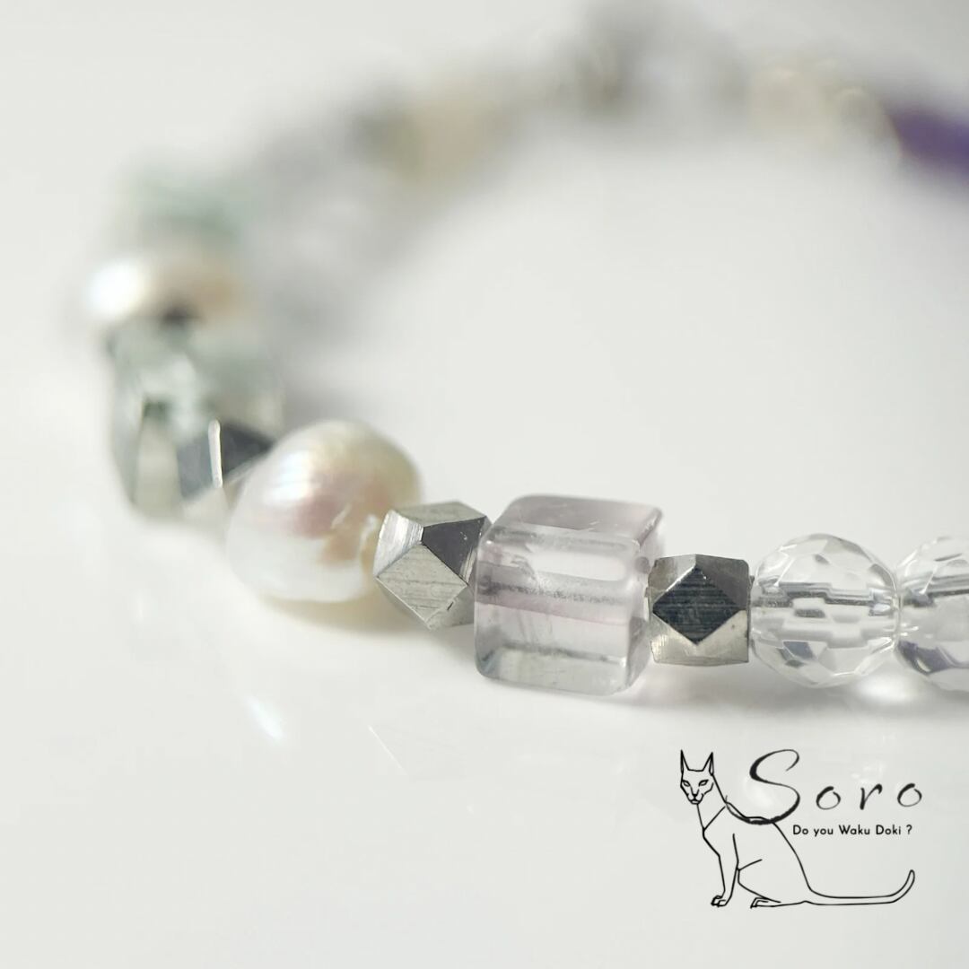 深みのある紫が美しいアメジストに、やわらかな色合いのフローライト、清らかな水晶、上品な艶を放つ淡水パールを組み合わせたブレスレット。