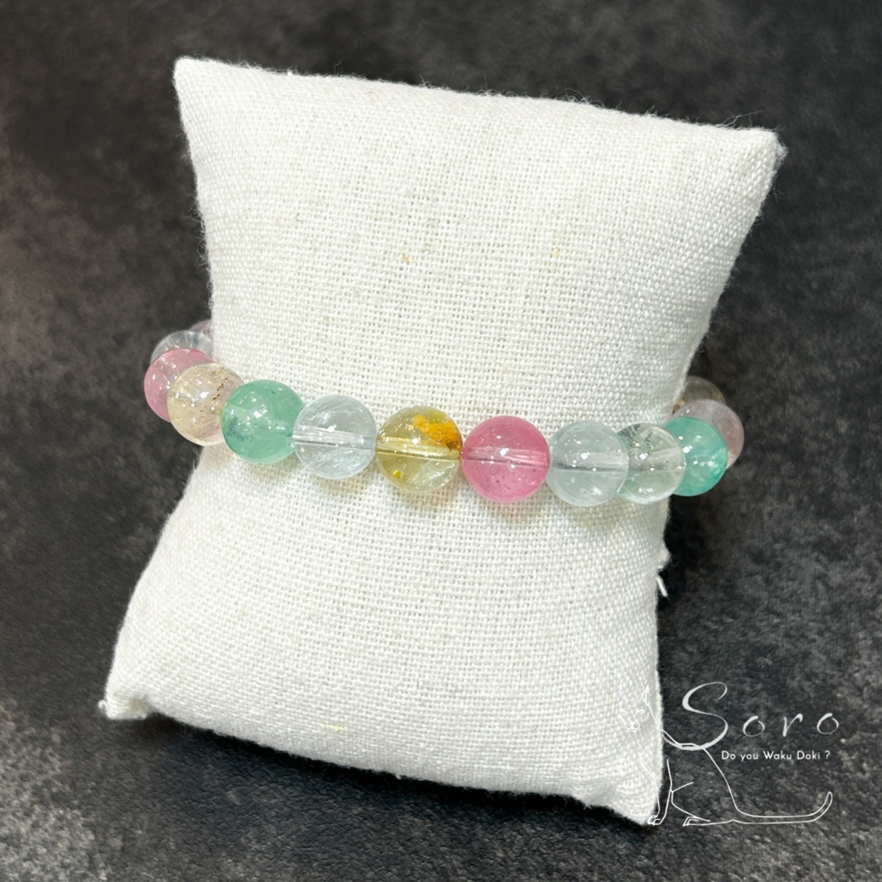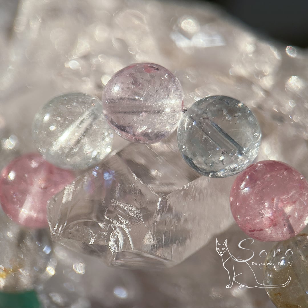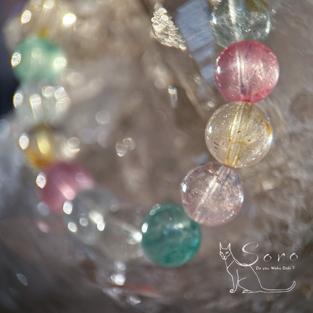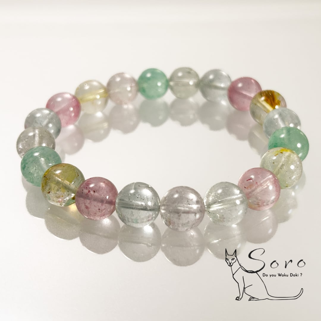 やわらかな色彩と透明感が調和し、見るたびに心がふっと軽くなるブレスレット。