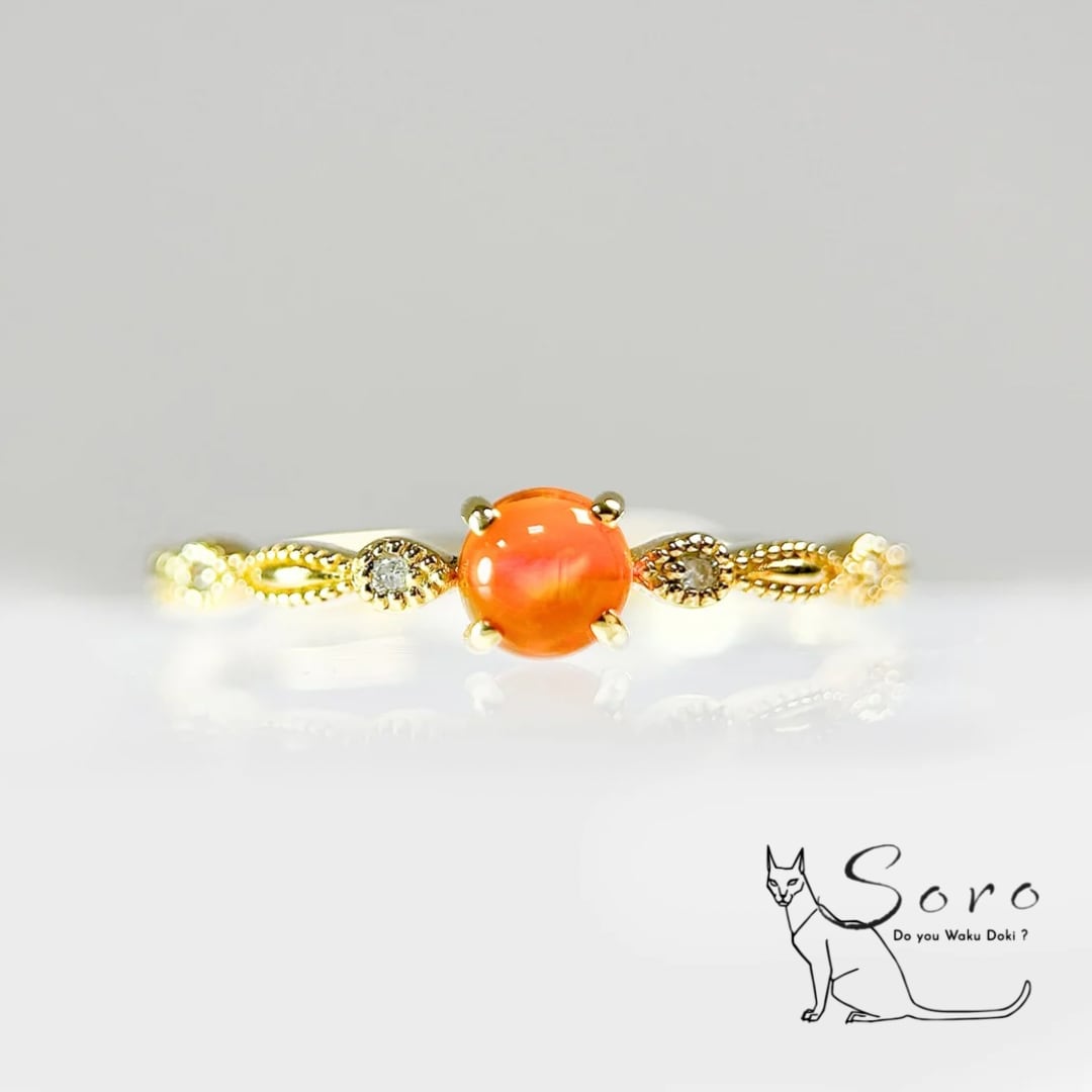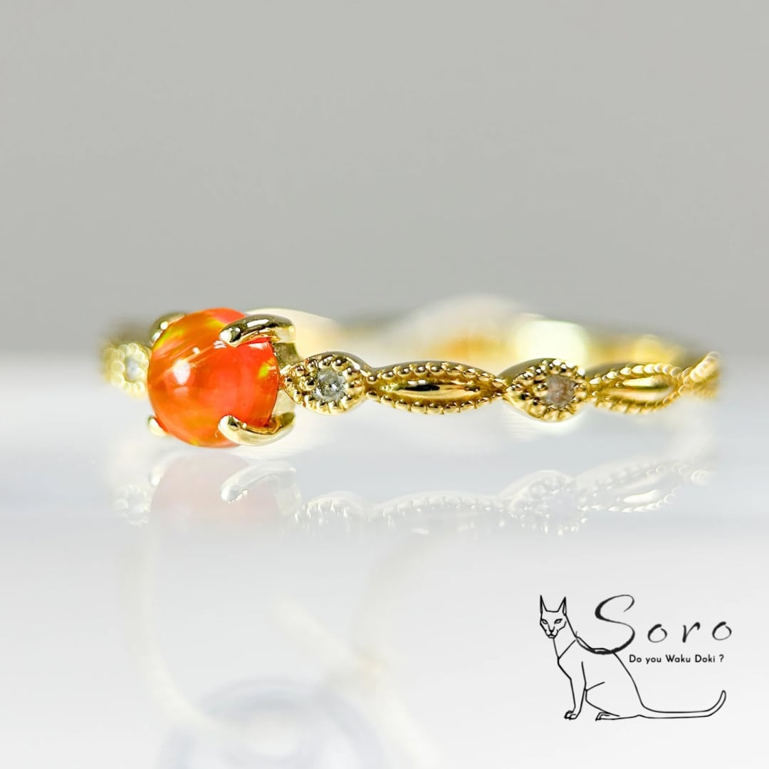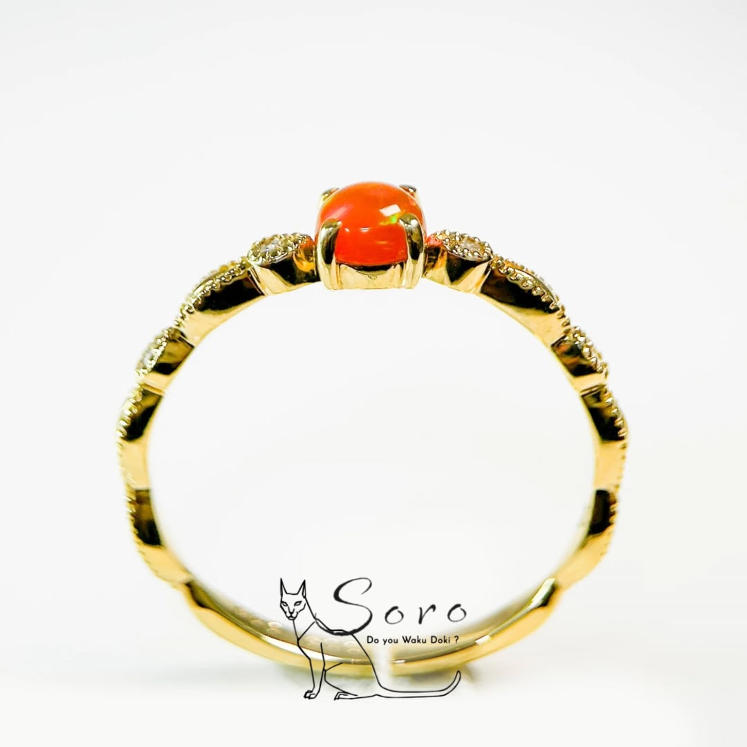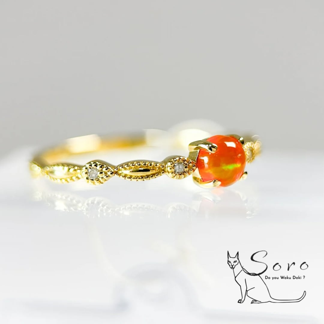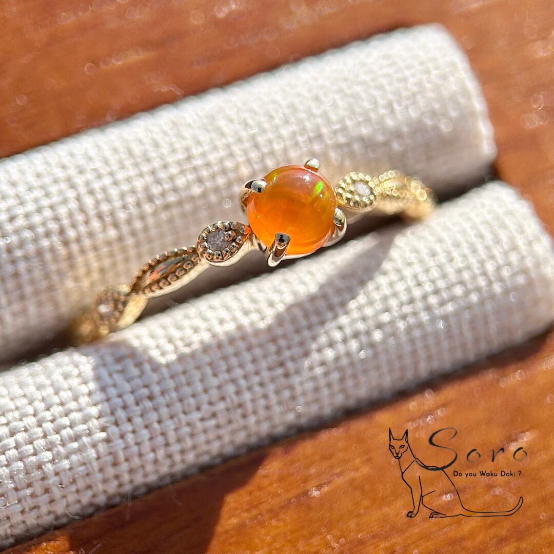 内側から燃えるようなオレンジの輝きを放つ、メキシコ産ファイアプレシャスオパールを主役にしたリング。