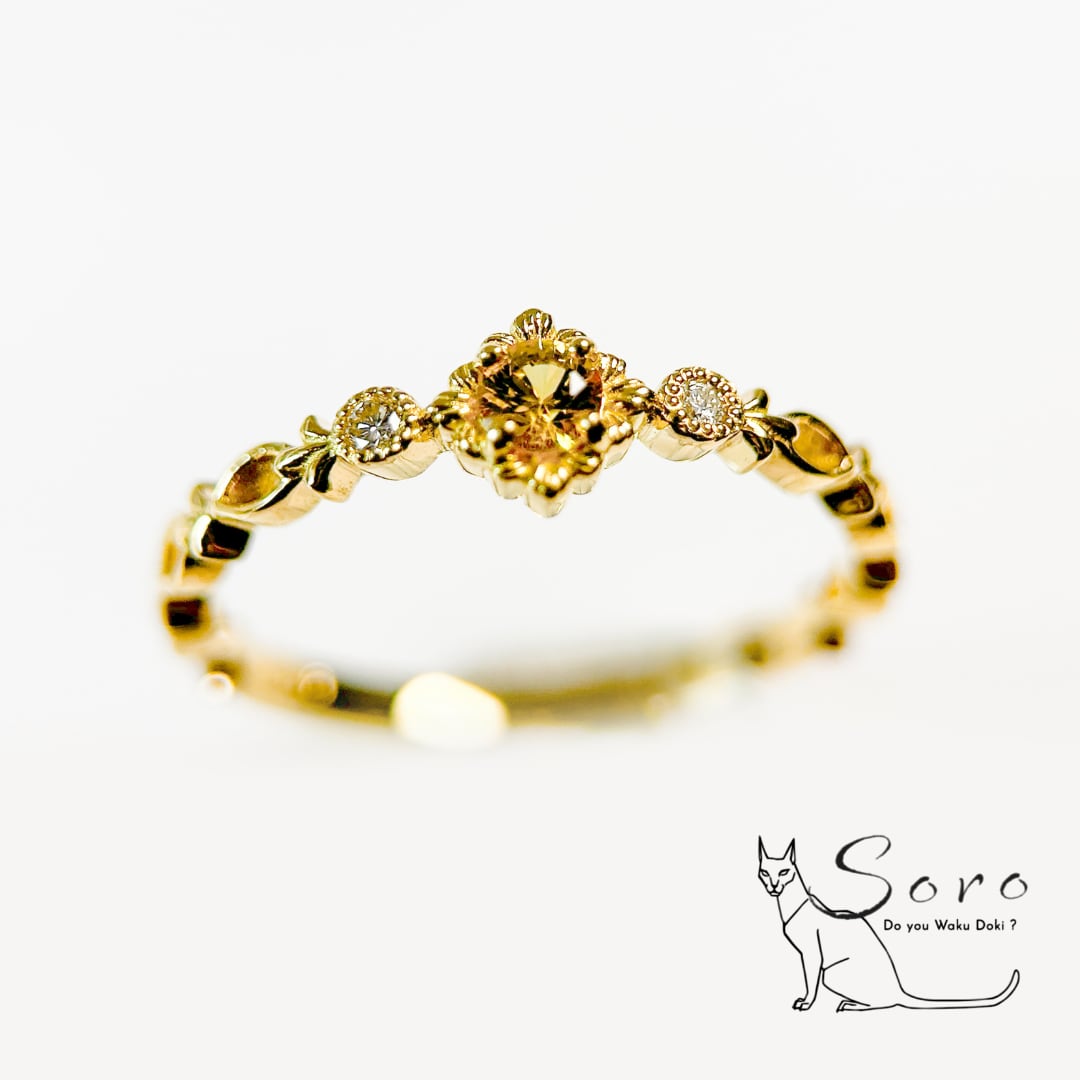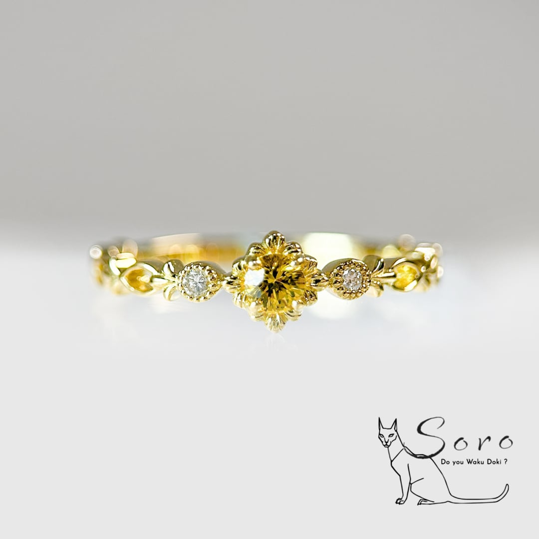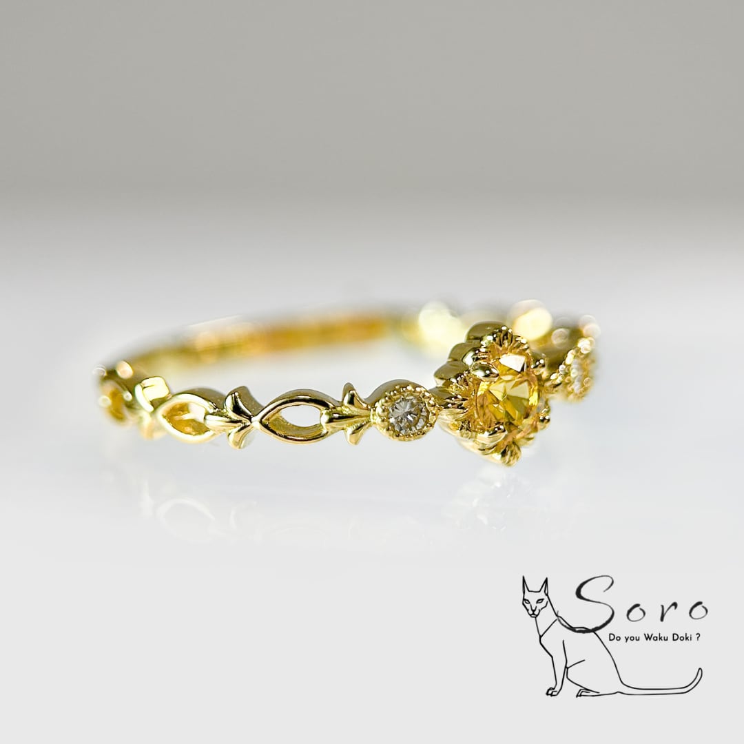 イエローサファイアの明るく華やかな輝きに、ダイヤモンドの澄んだ煌めきを添えたリング。