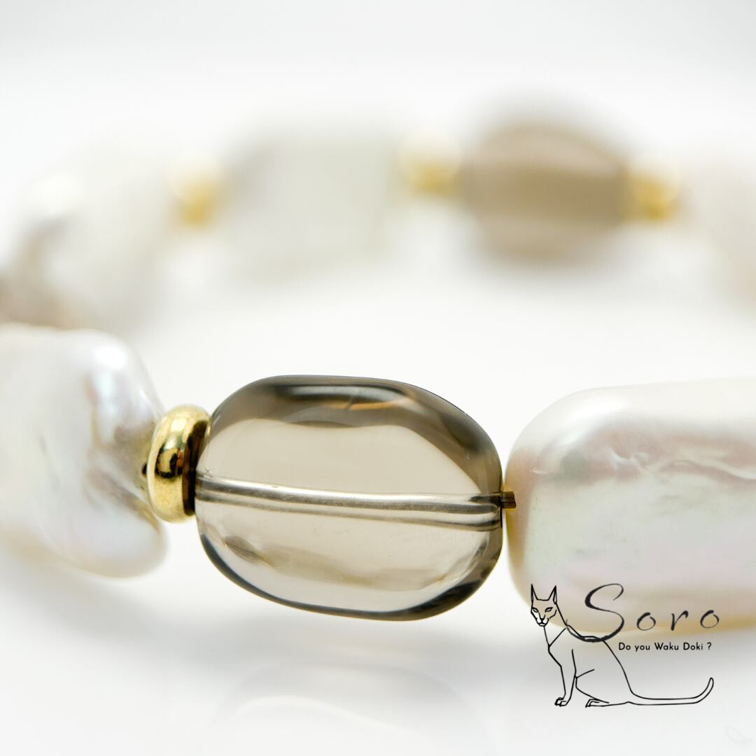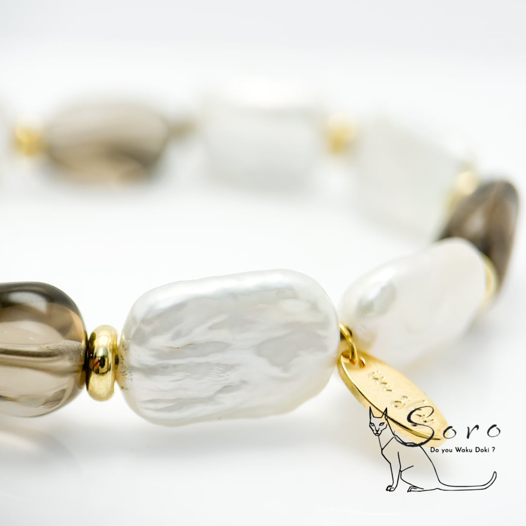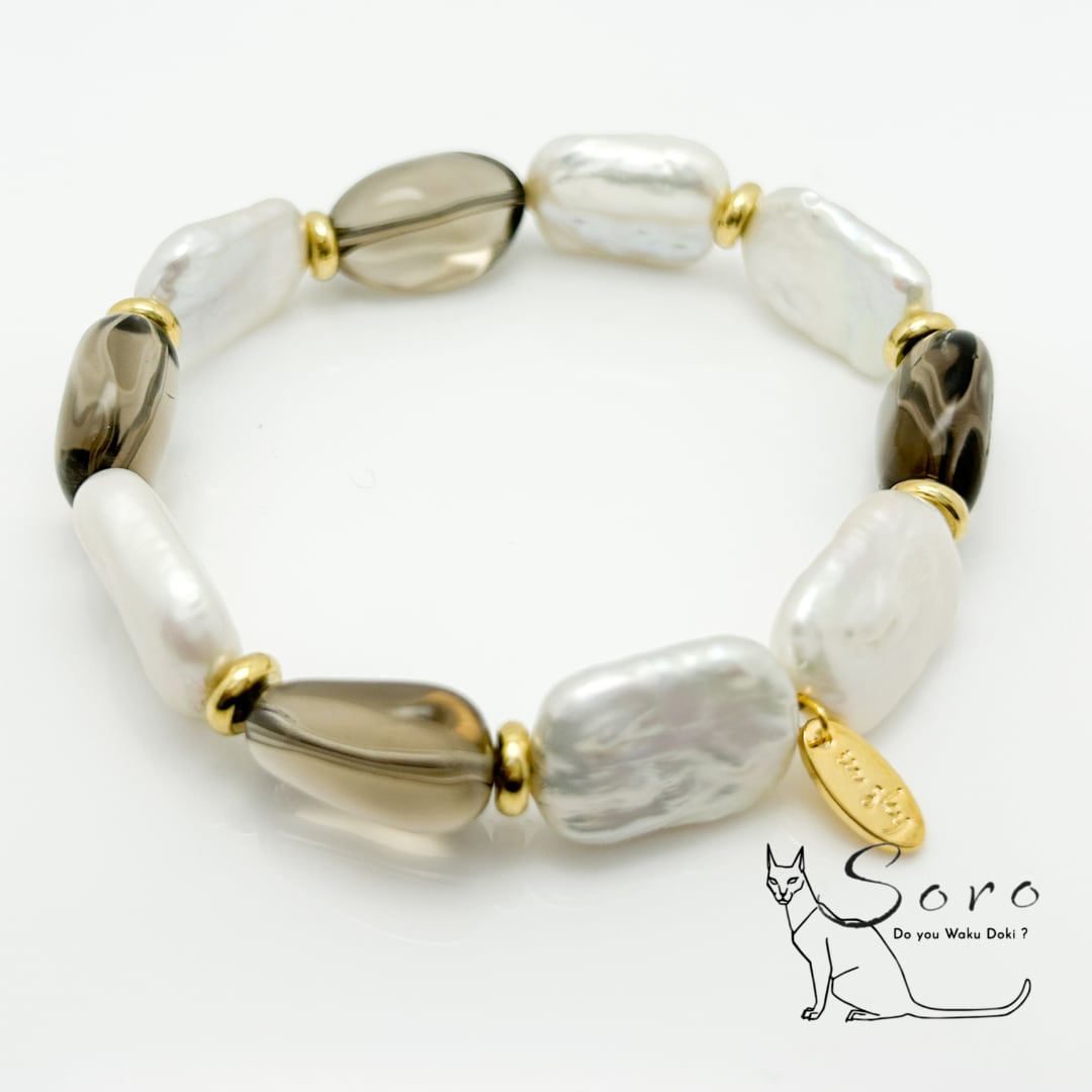 自然な艶を持つ淡水パールと、落ち着いた透明感のスモーキークォーツを組み合わせたブレスレット。