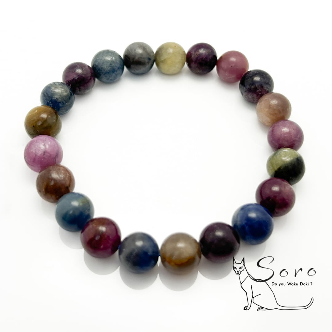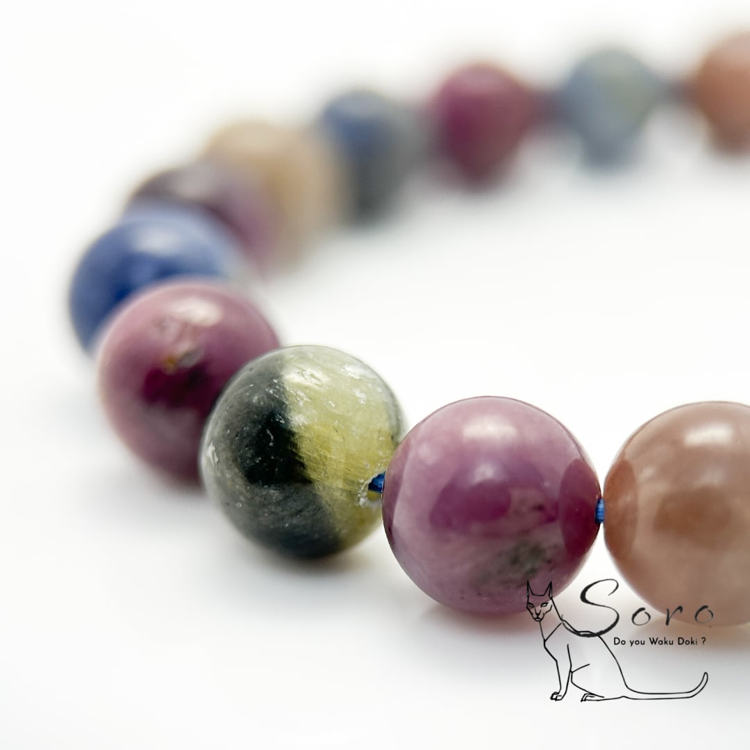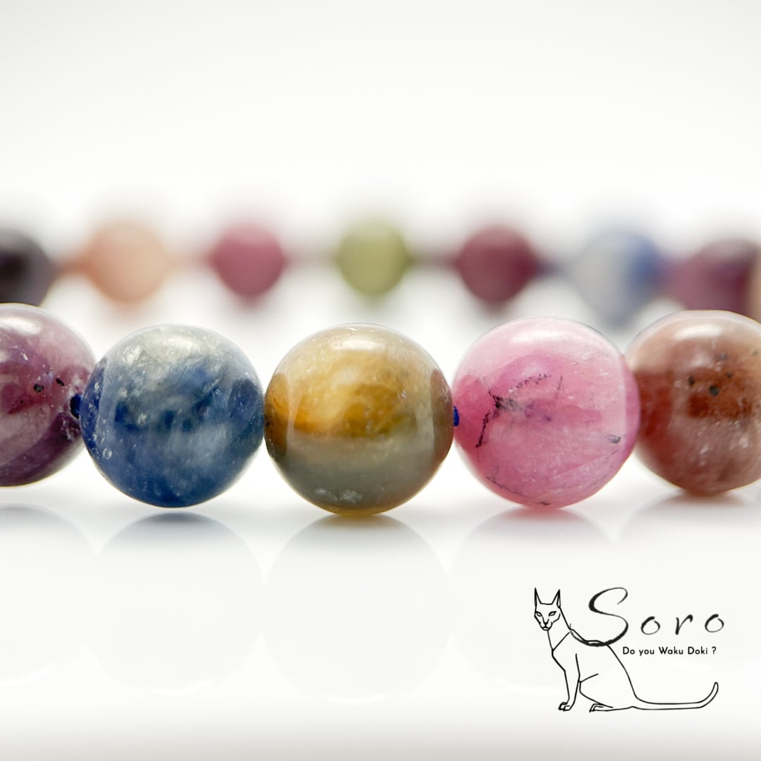 ミックスカラーサファイアは、ブルー・ピンク・イエロー・グリーン・パープルなど、複数の色合いを一つのブレスレットに集めたサファイアです。
