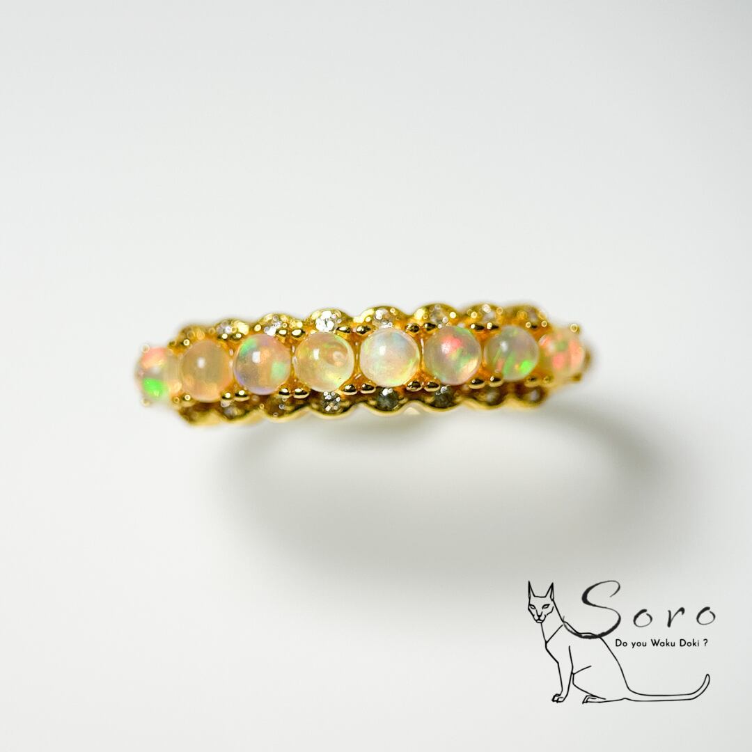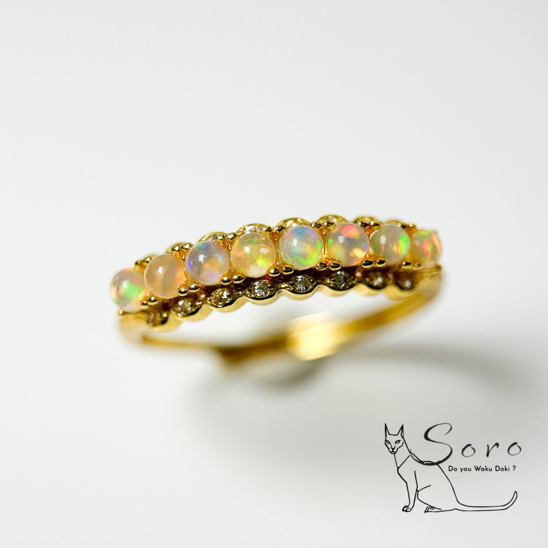 小粒のプレシャスオパールを贅沢に連ねた、ハーフエタニティリングです。
