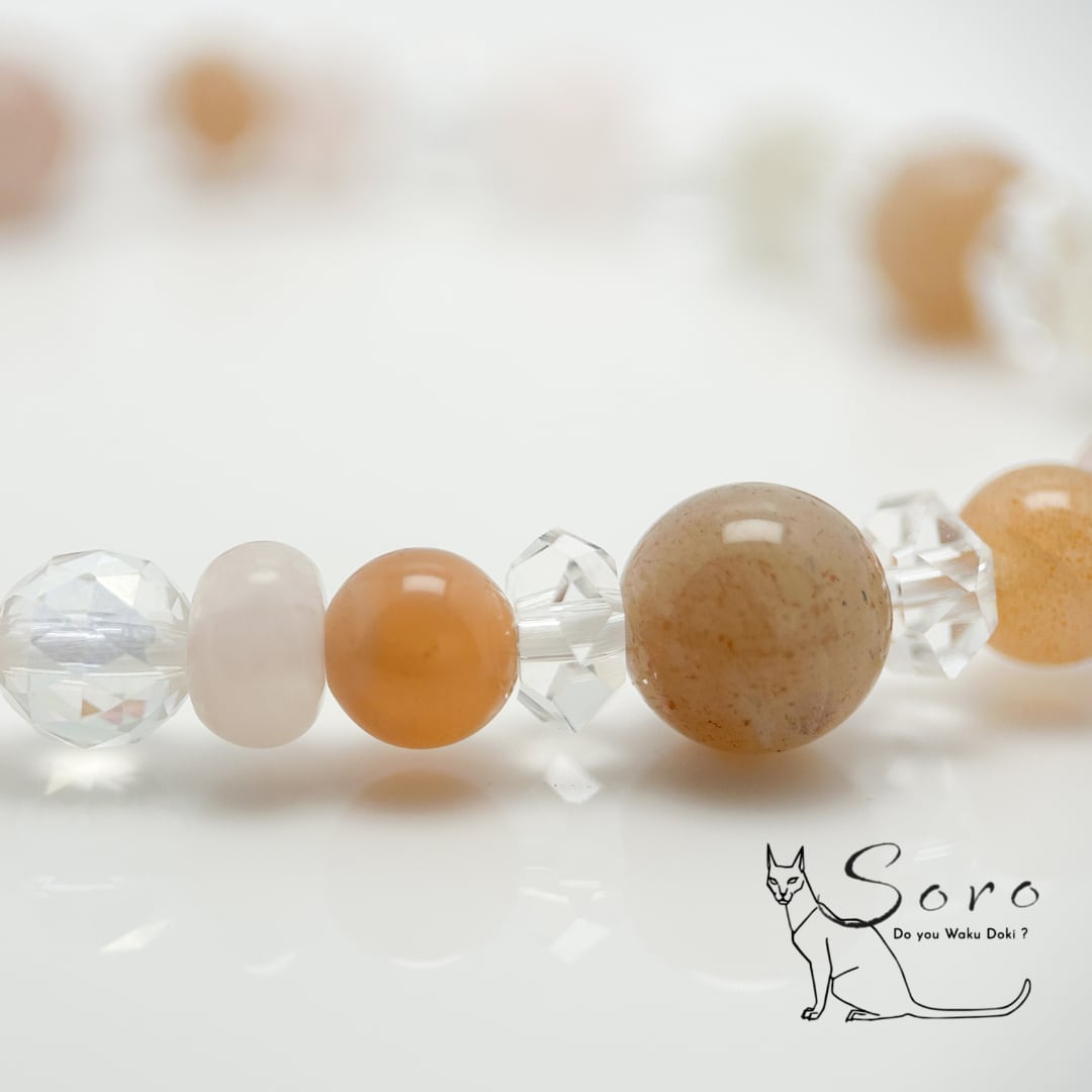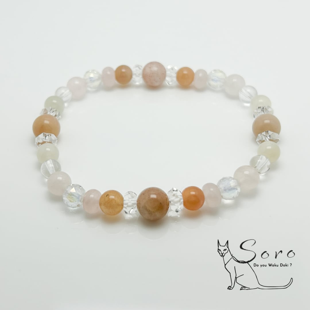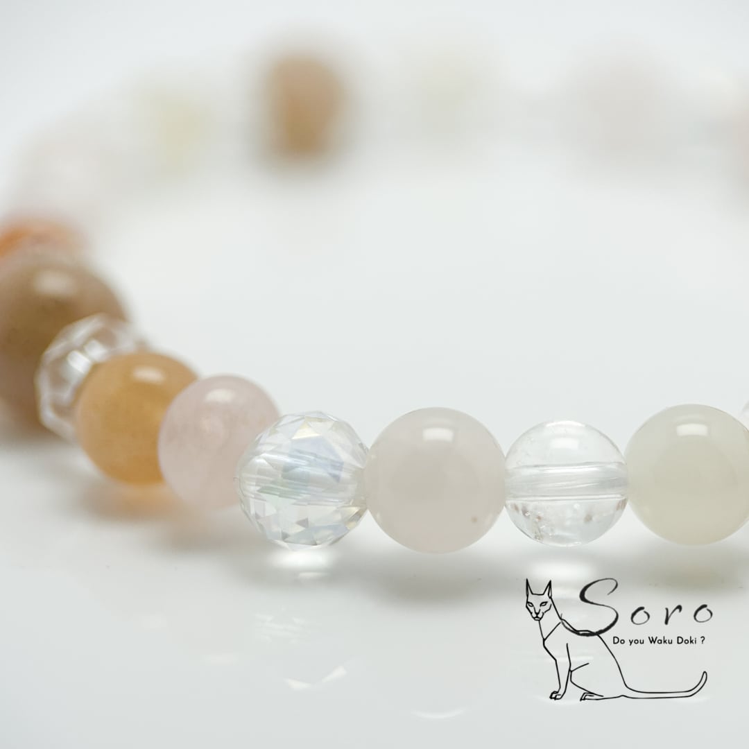 ホワイト~ベージュのムーンストーンの穏やかで柔らかな色合いと、淡いピンクが愛らしいローズクォーツに清らかな水晶を組み合わせた恋愛系ブレスレット。