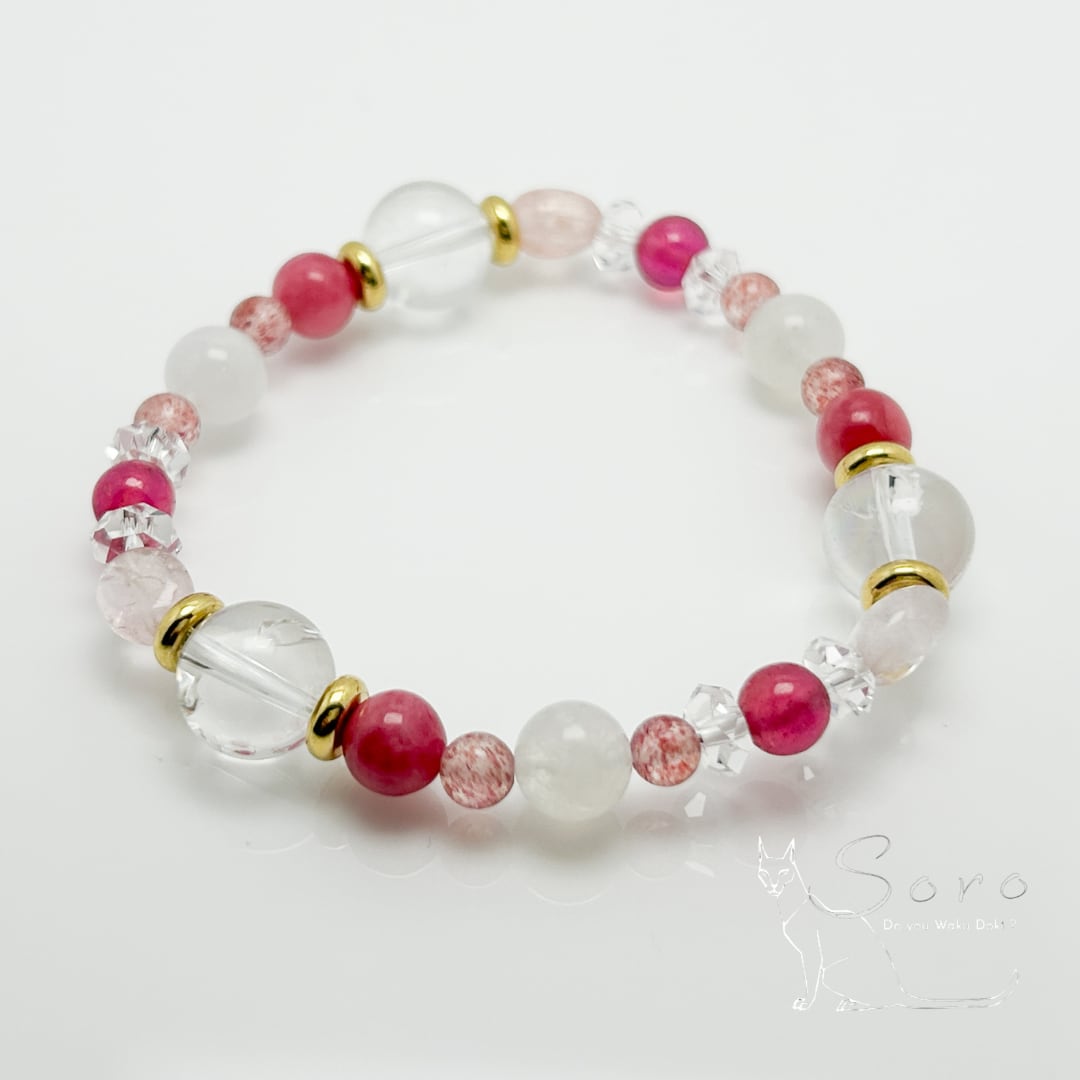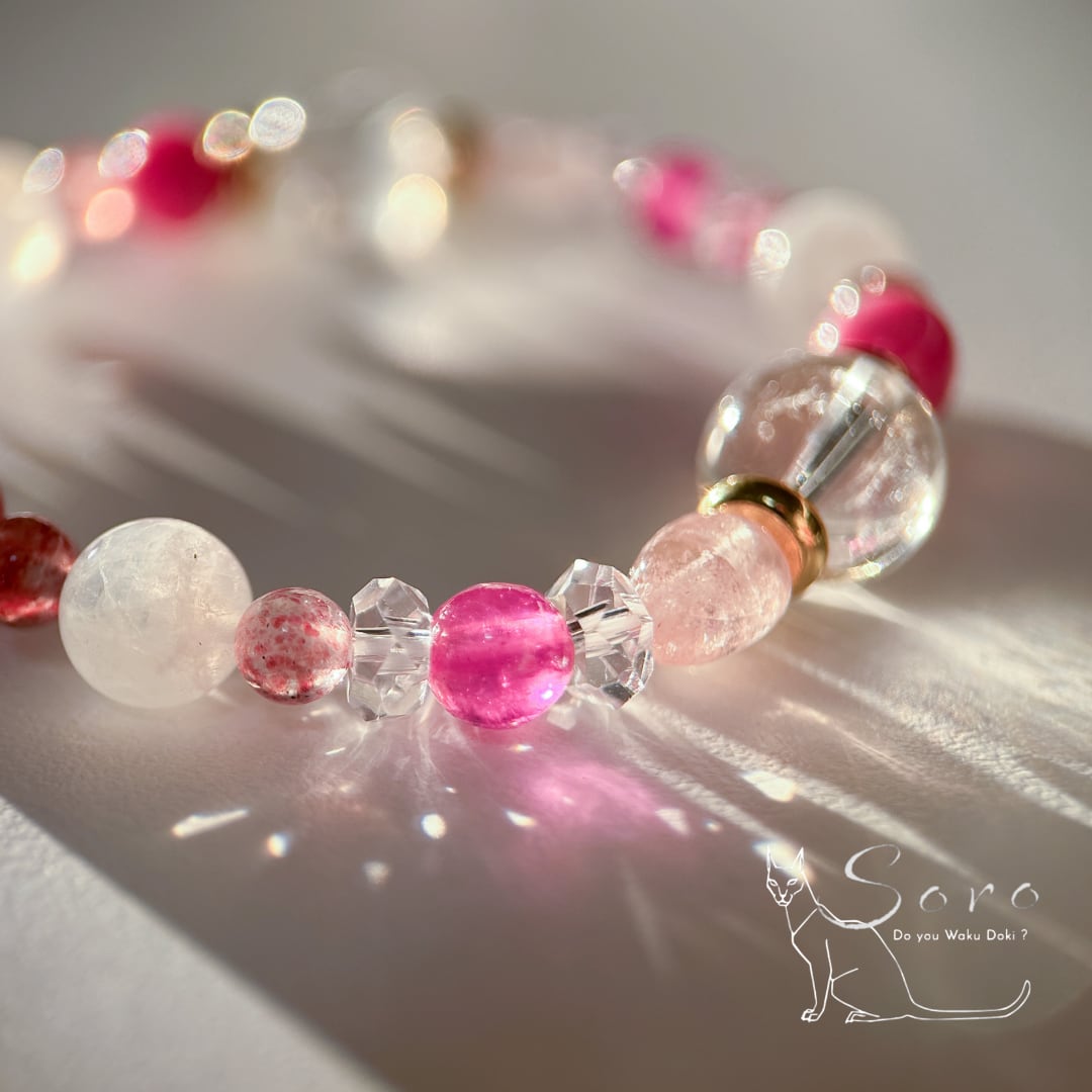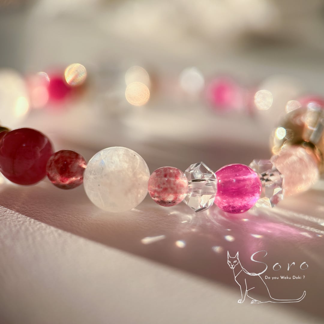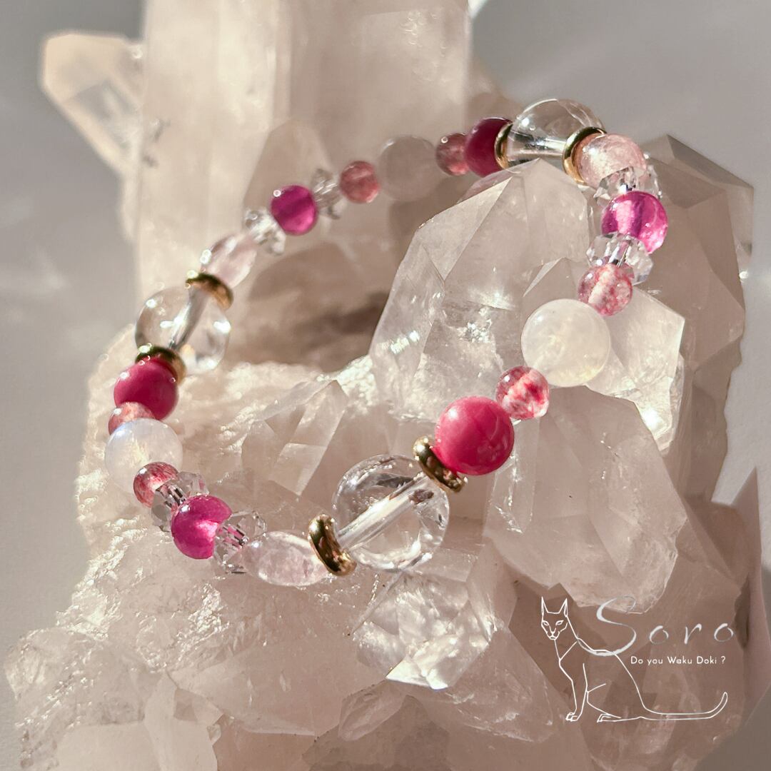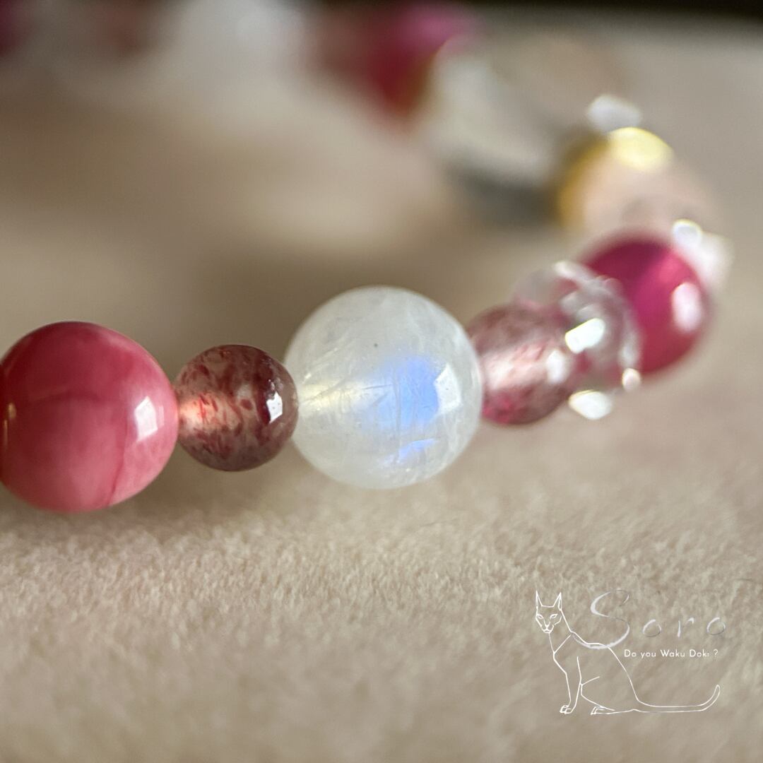 情熱的な輝きを放つルビーをはじめ、優しいピンクのモルガナイト、虹の光を宿すアイリスクォーツ、神秘的なブルームーンストーン、成長を象徴するエピドート、深い癒しのロードナイト、そして清らかな水晶を組み合わせたブレスレット。