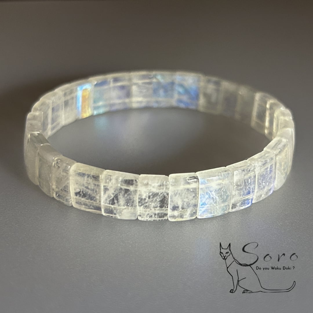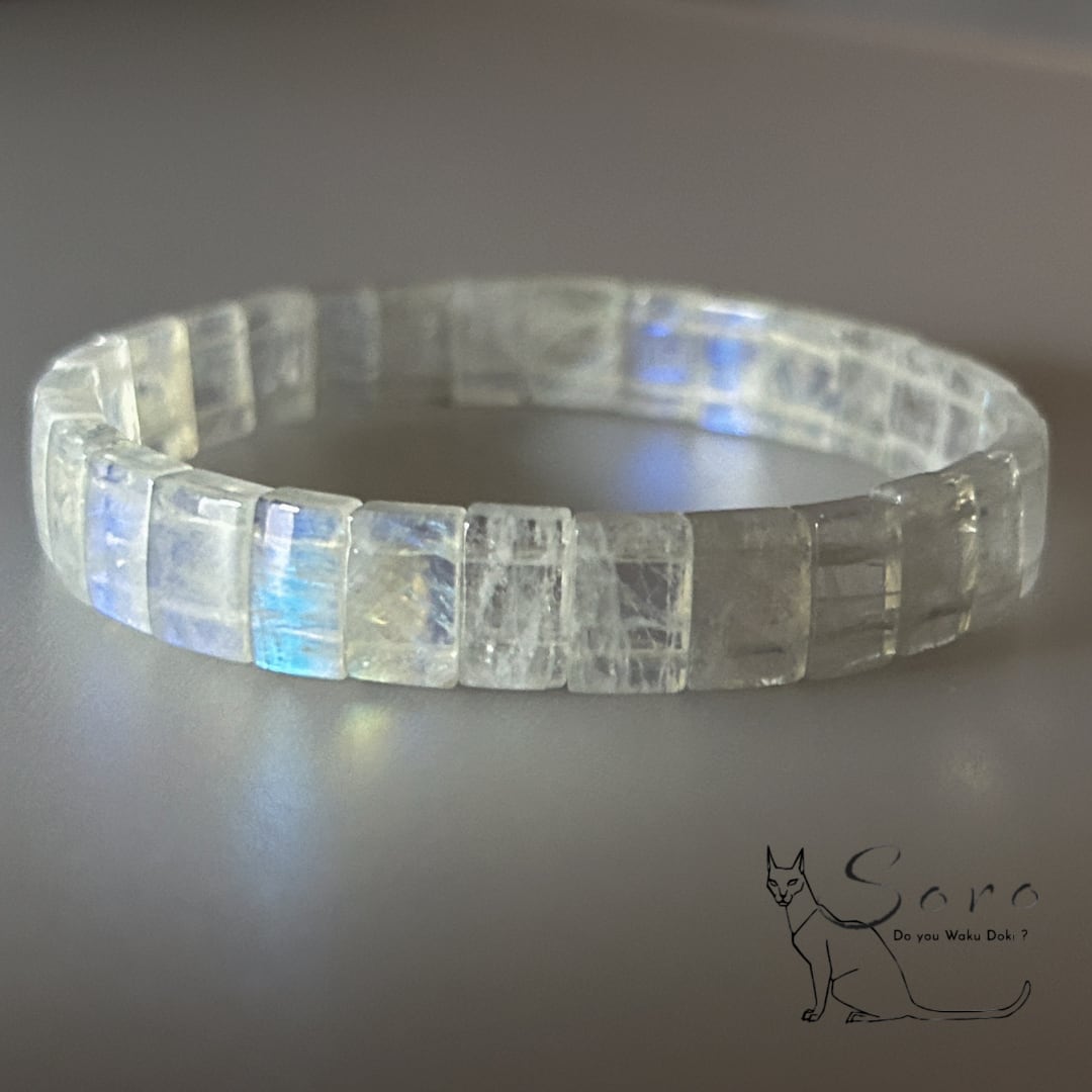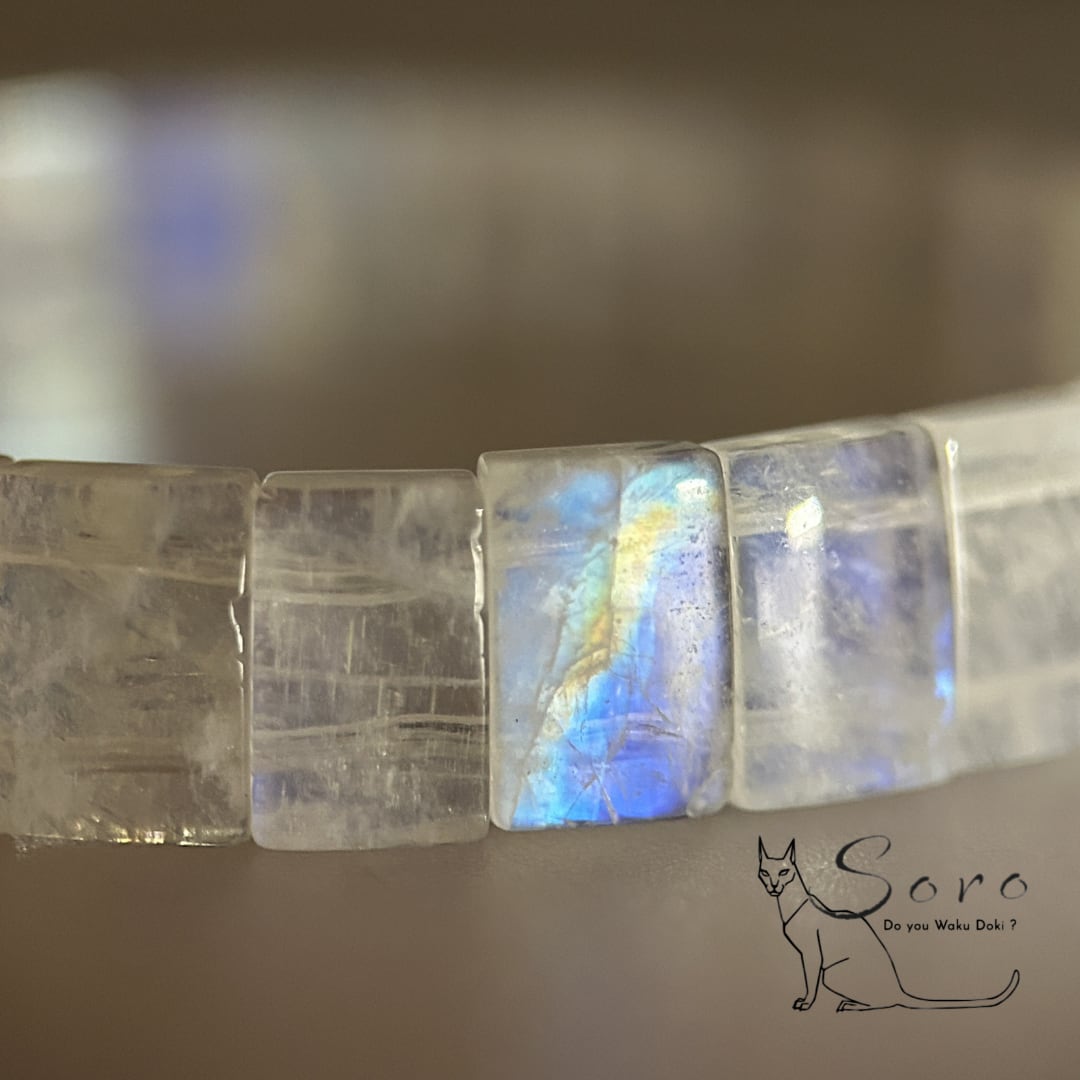 透明感のある乳白色の地に、「角度によって青く揺らめくシラー(光彩)」が美しく浮かび上がるブルームーンストーン。