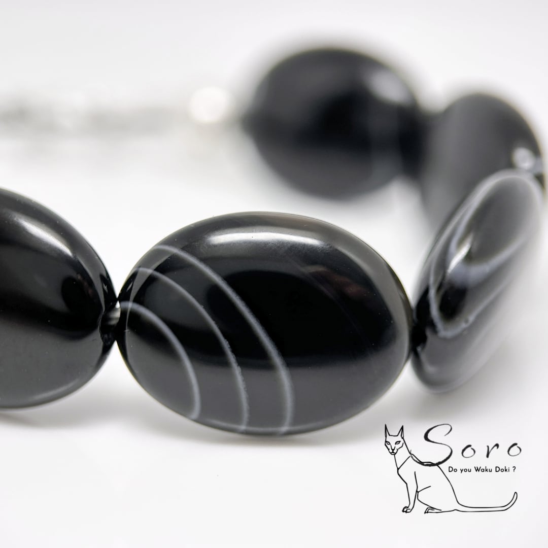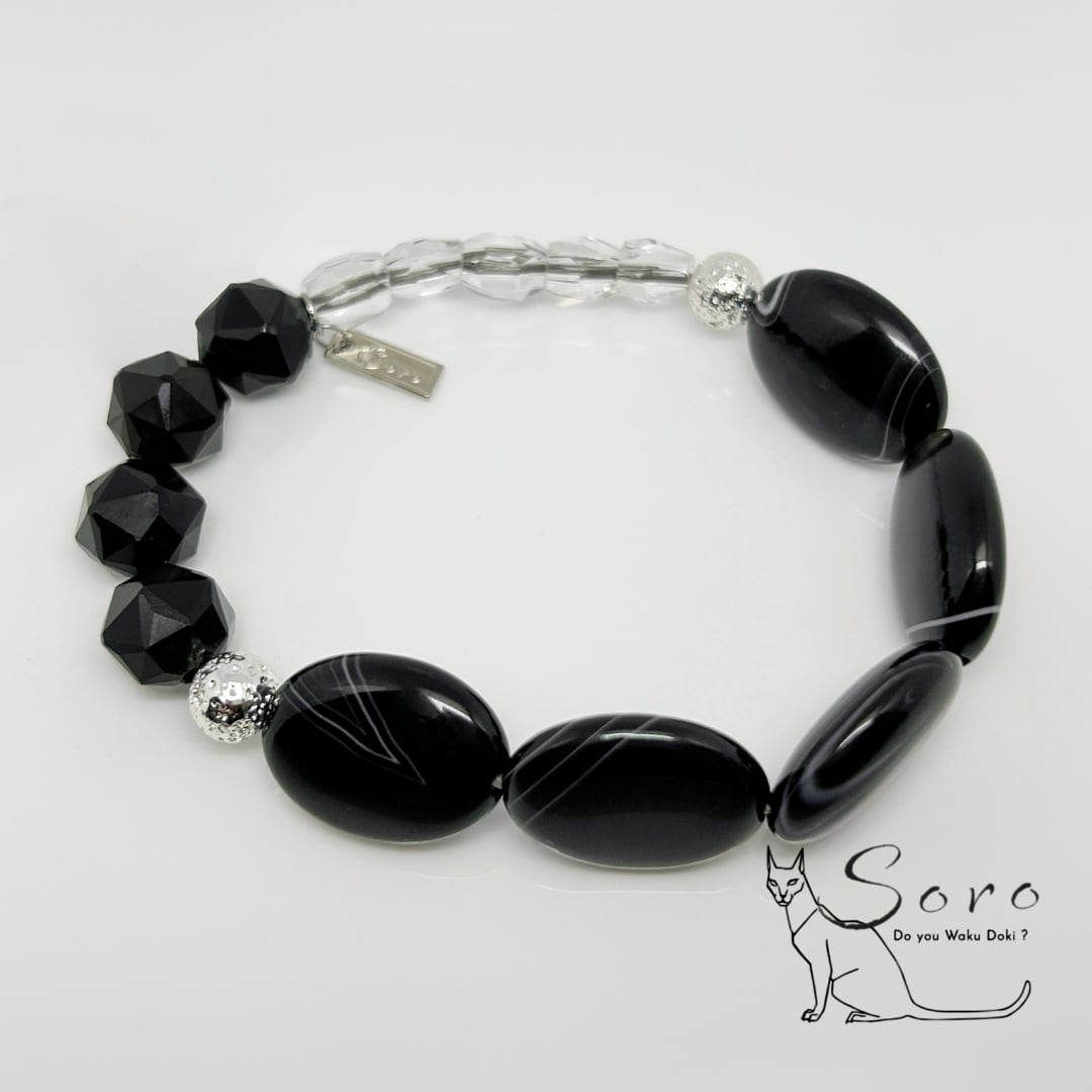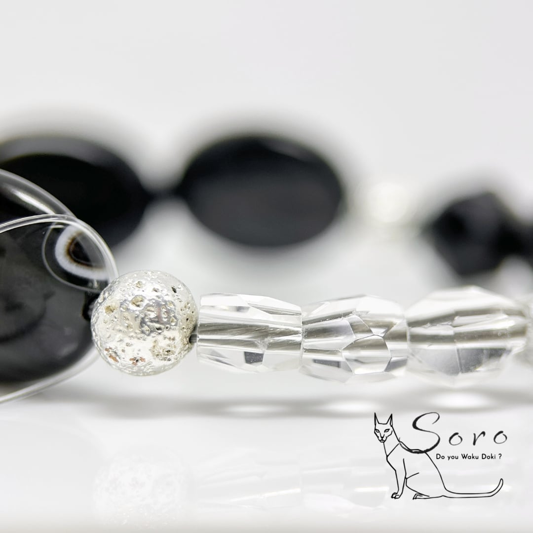 力強い縞模様が印象的な縞瑪瑙に、漆黒のモリオン、清らかな水晶、そして大地のエネルギーを宿すラバー溶岩石を組み合わせたオシャレな守護ブレスレット。