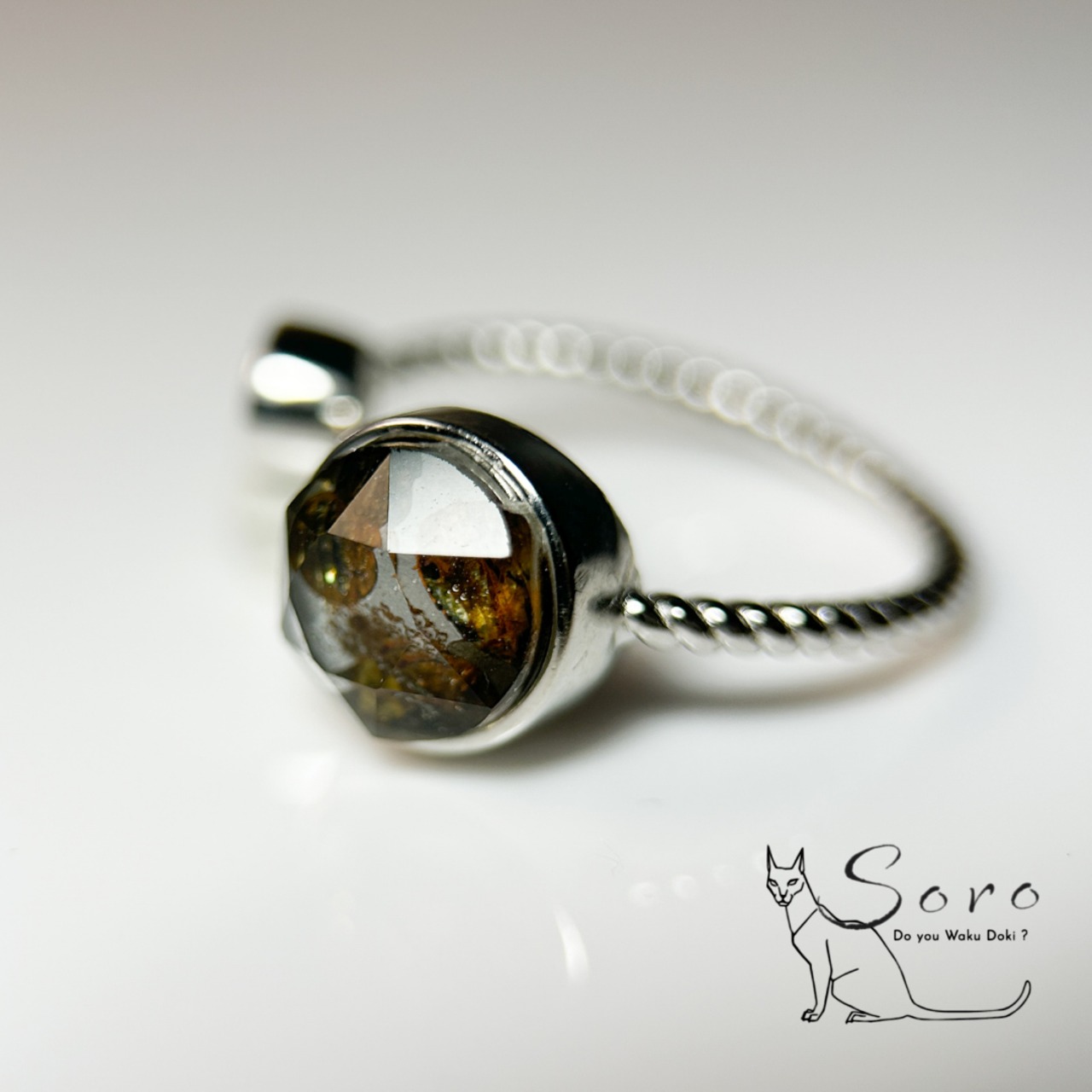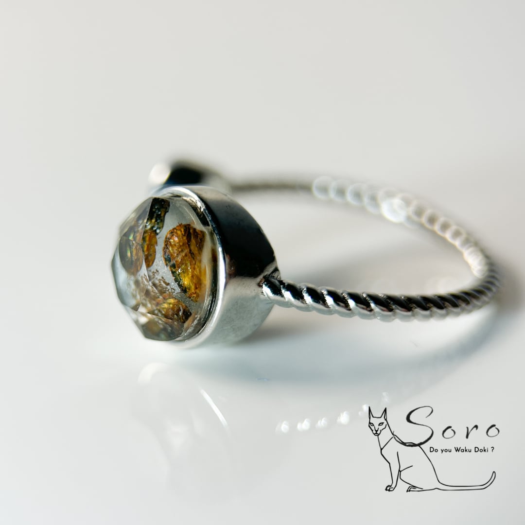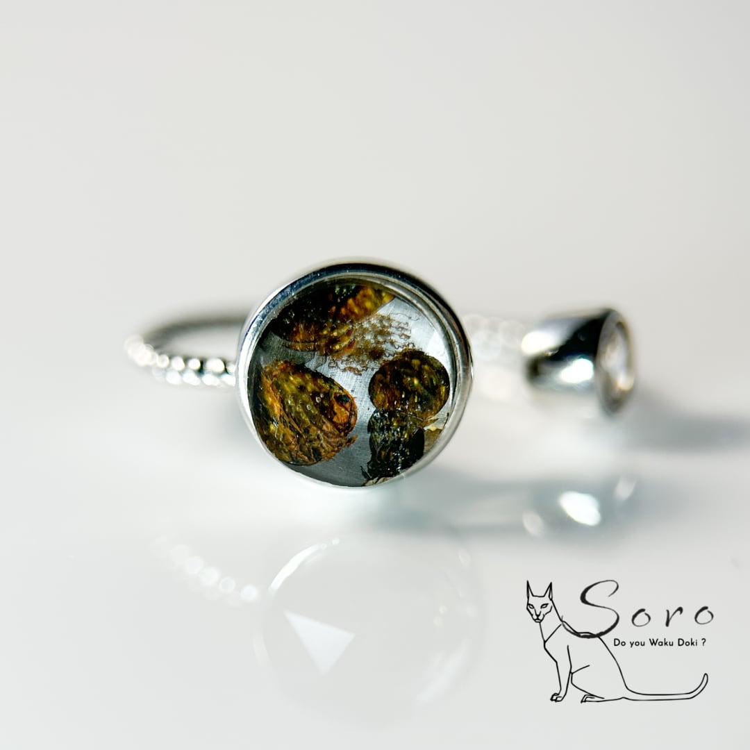 宇宙から飛来した希少なパラサイト隕石を主石に、澄んだ輝きを放つホワイトトパーズを添えた指輪。
