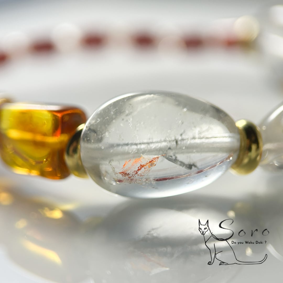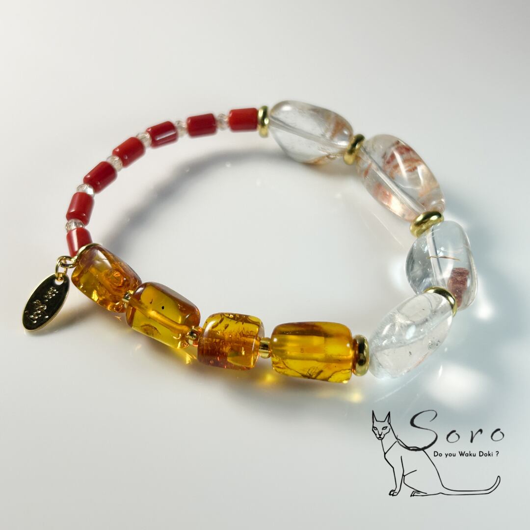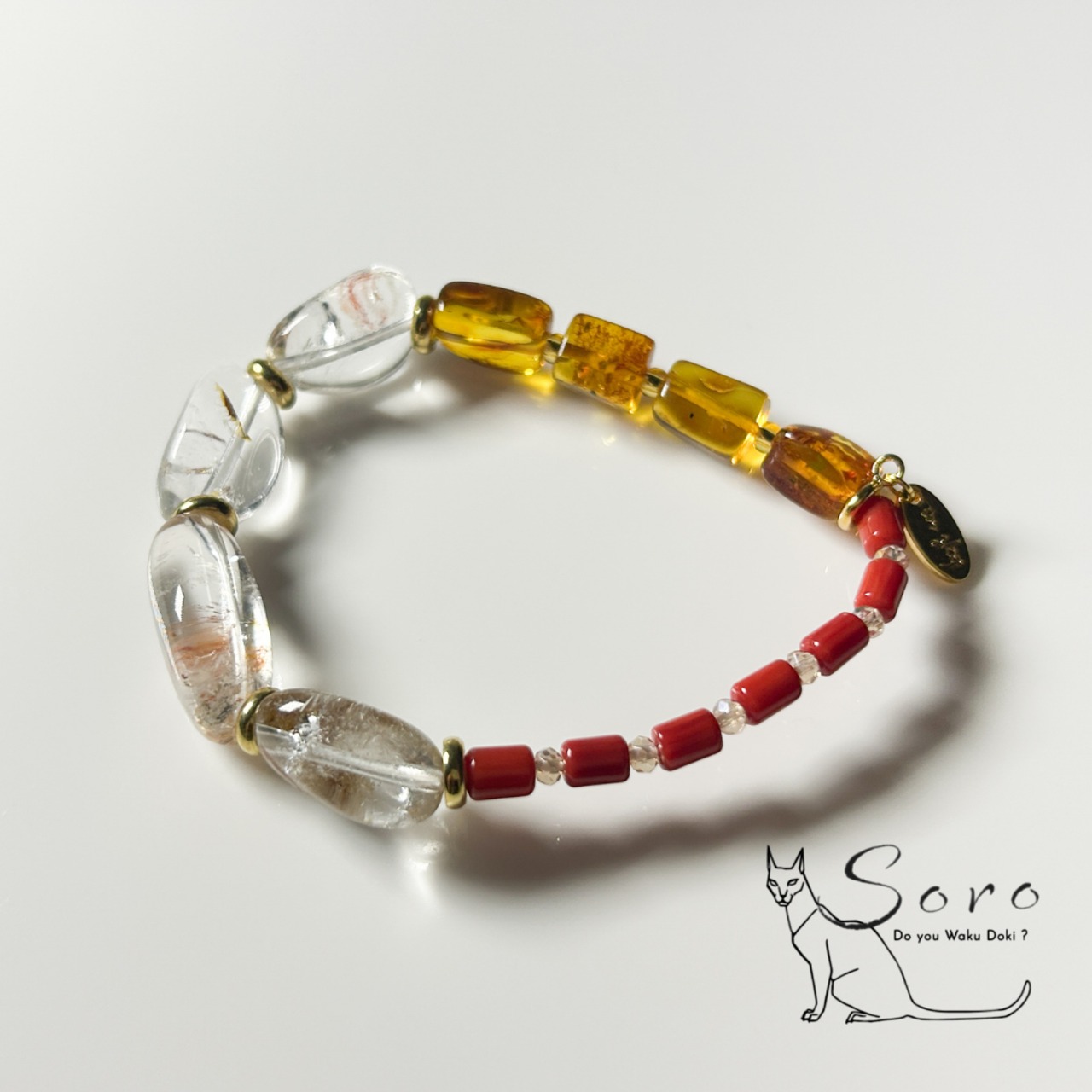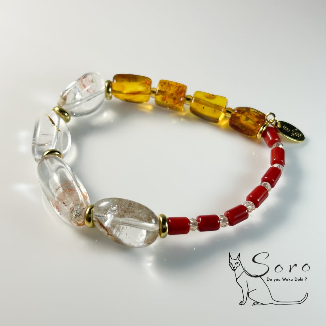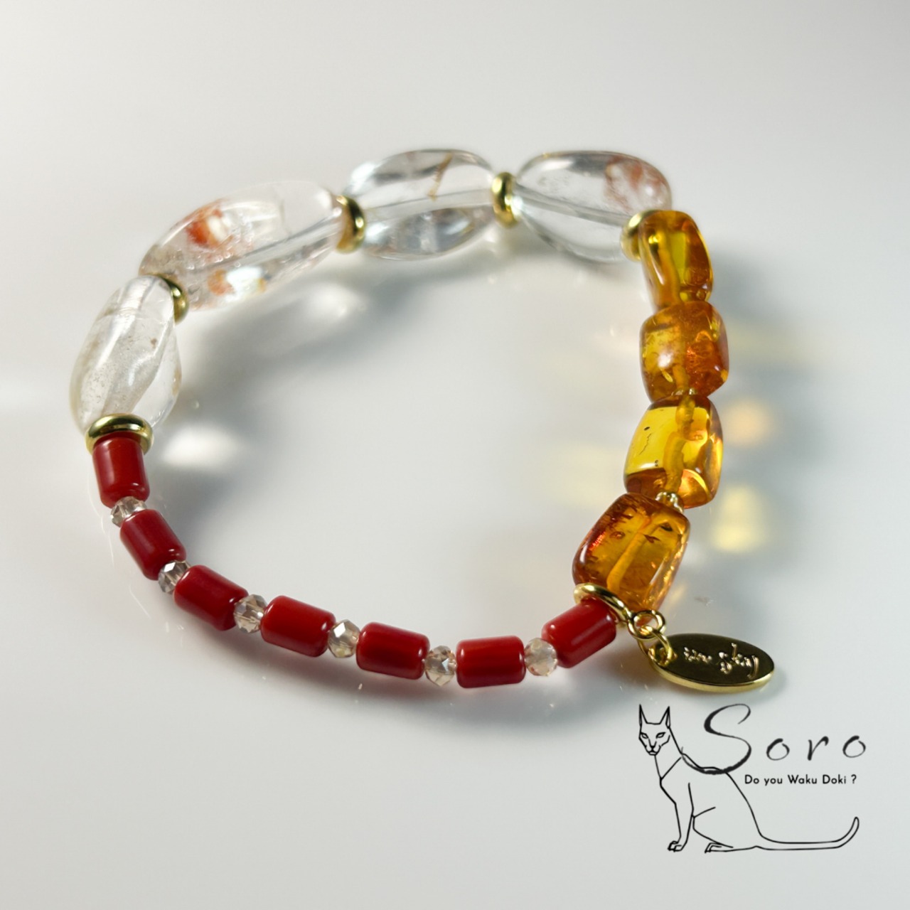 深みのある輝きを持つレッドヘマタイトインクォーツに、やさしく温もりを感じさせるアンバー、そして生命力あふれるレッドコーラルを組み合わせたブレスレット。