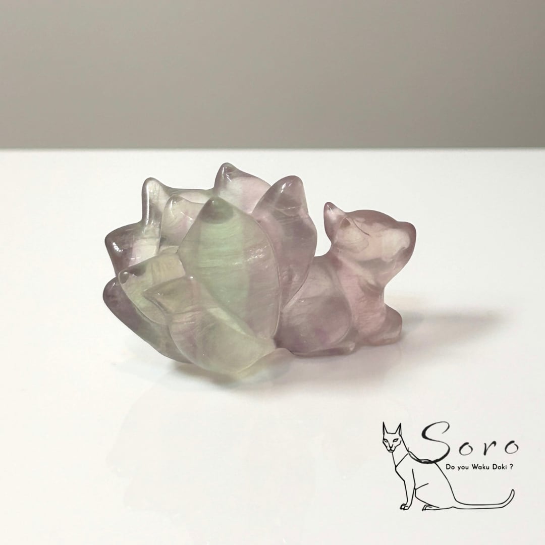神秘的な輝きを放つフローライトを贅沢に彫刻した、九尾の狐モチーフ。