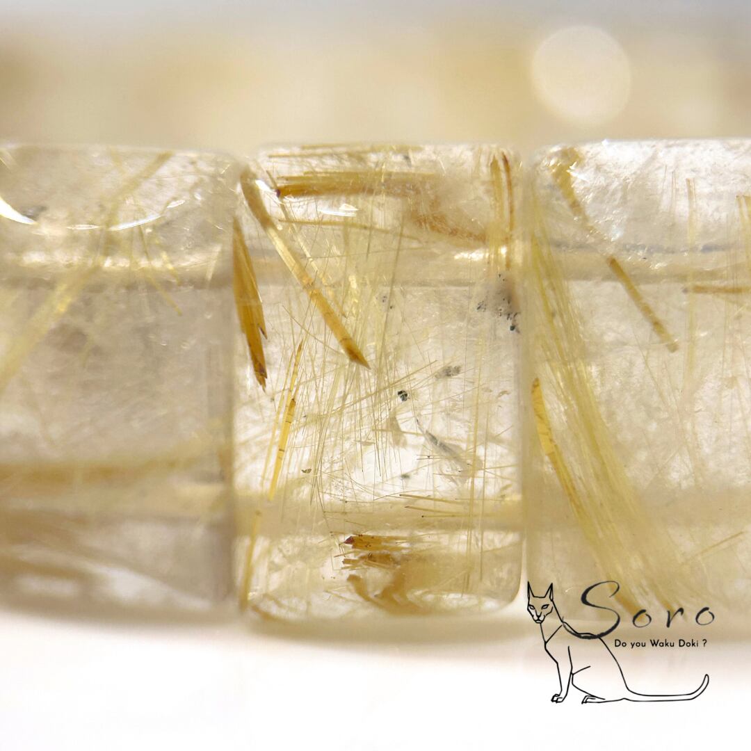 透明感のある水晶の中に、金色の針状結晶(ルチル)が美しく伸び、一本一本が異なる表情を見せてくれます。
