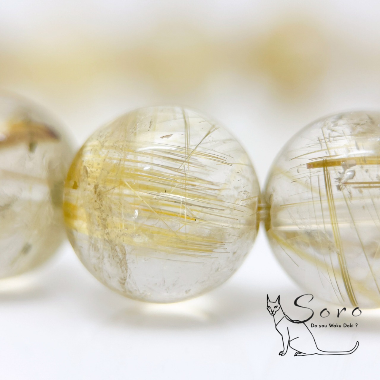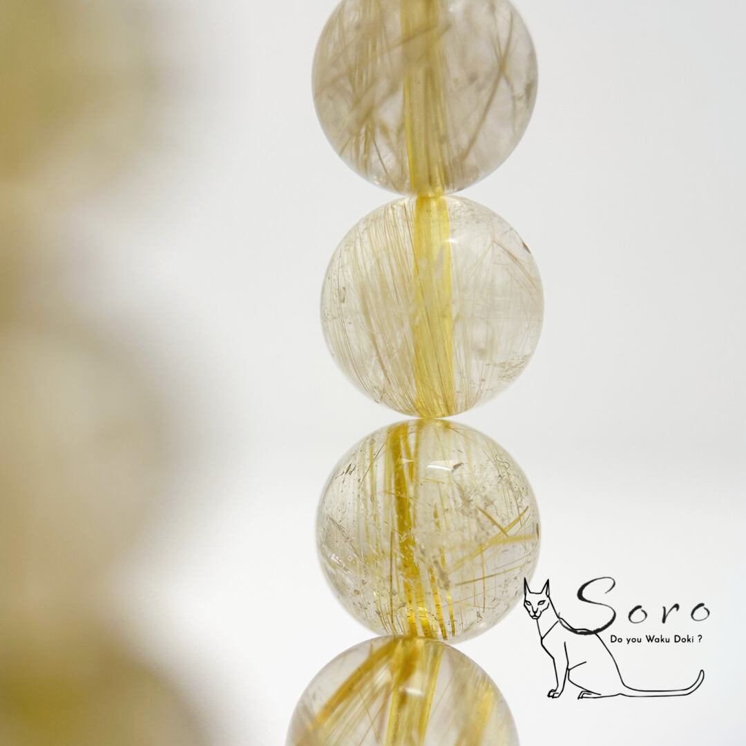 一粒一粒に異なる表情を持つルチル(金紅石)が内包され、光を受けるたびに繊細で力強い輝きを放ちます。
