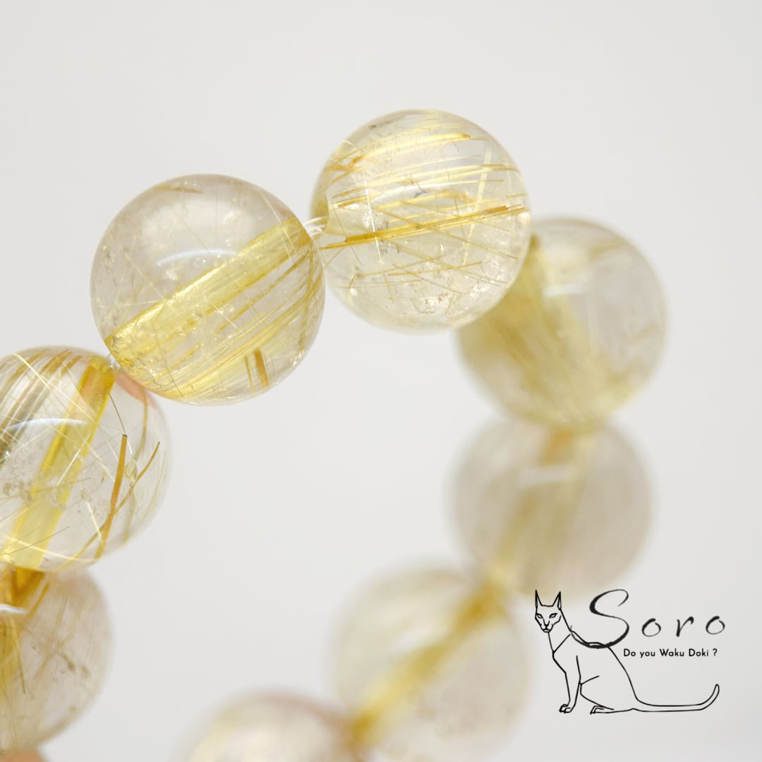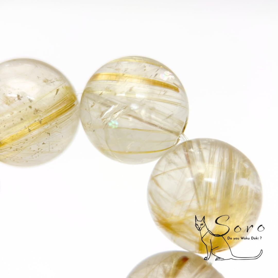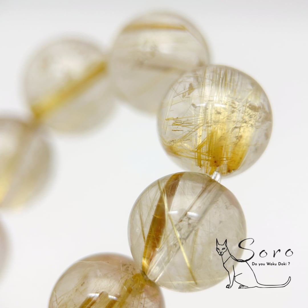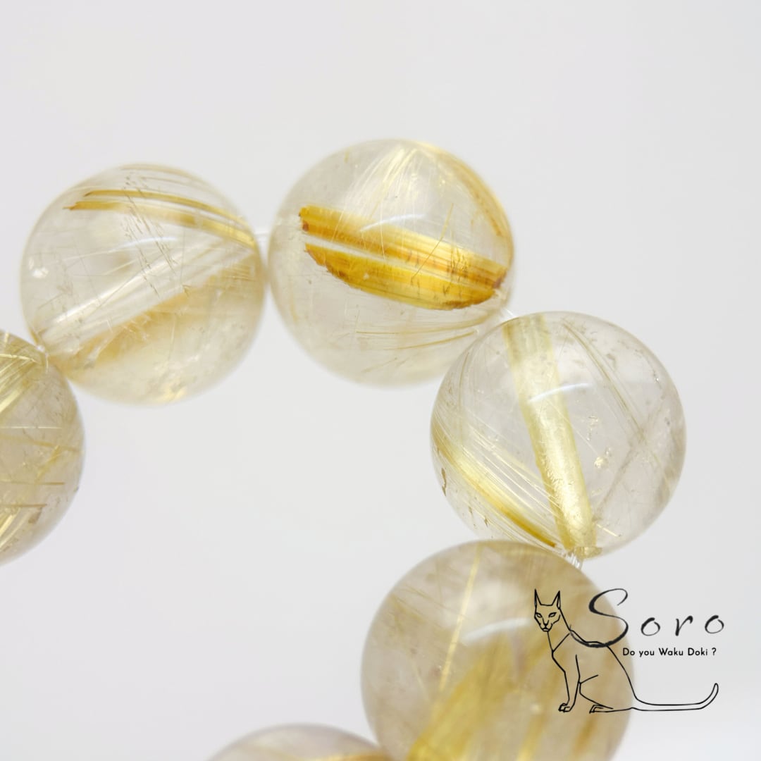 透明感のある水晶の中に、金色の針状結晶が美しく広がるルチルクォーツのブレスレット。