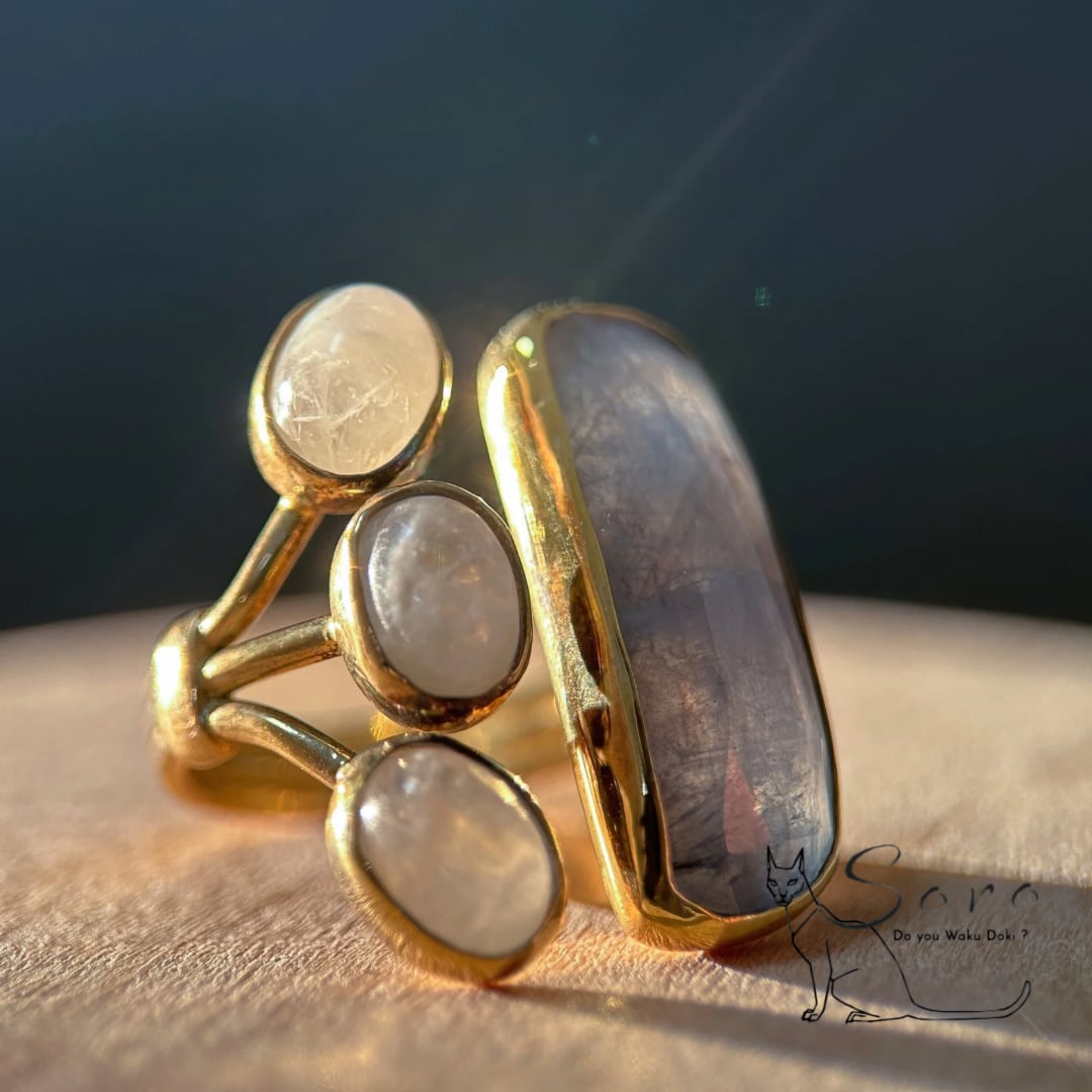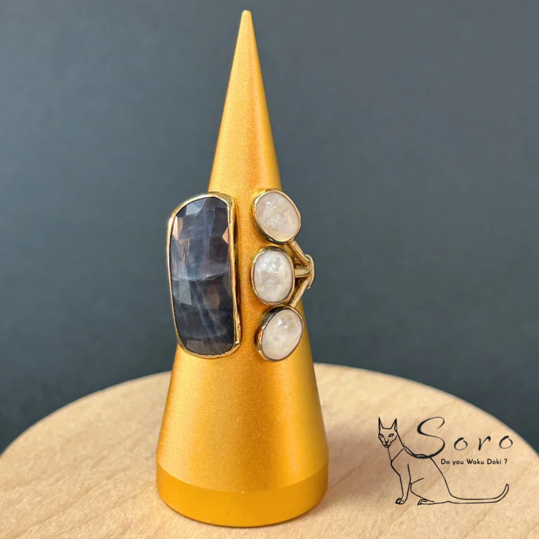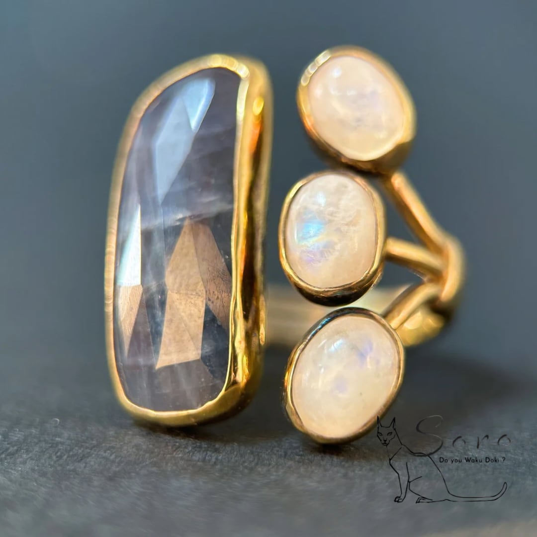 深く澄んだサファイアの輝きと、幻想的なシラーを放つブルームーンストーンを大胆に組み合わせた個性派リング。