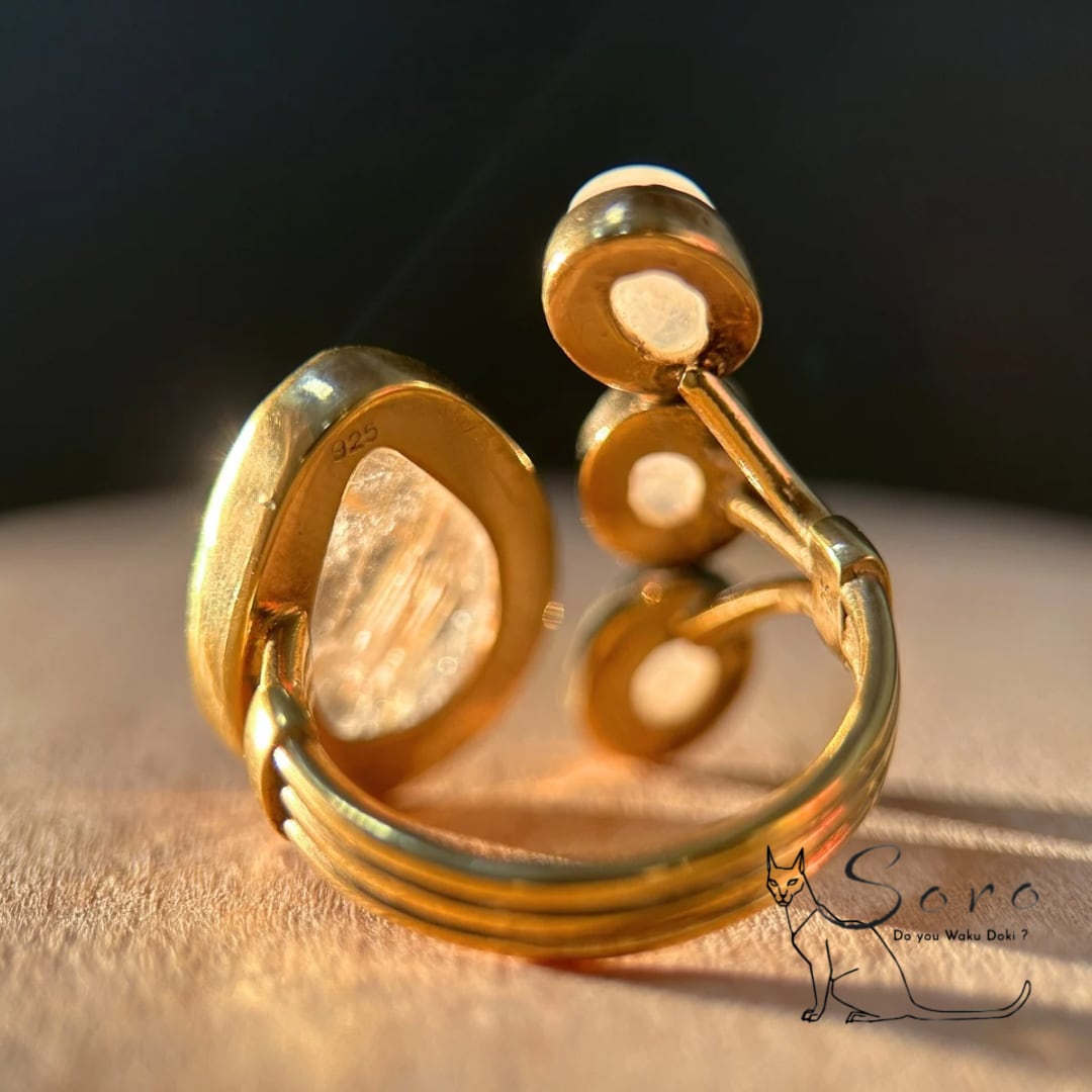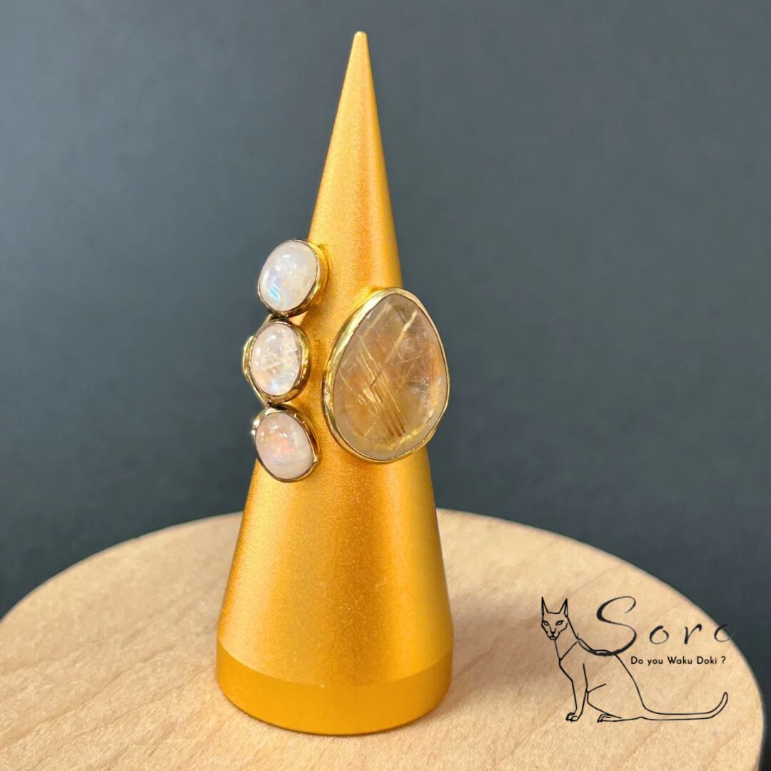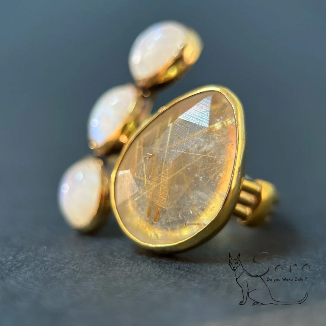 マットな質感のカットの奥に輝くルチルクォーツと、幻想的なシラーを放つブルームーンストーンを大胆に組み合わせたリング。