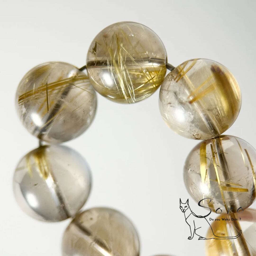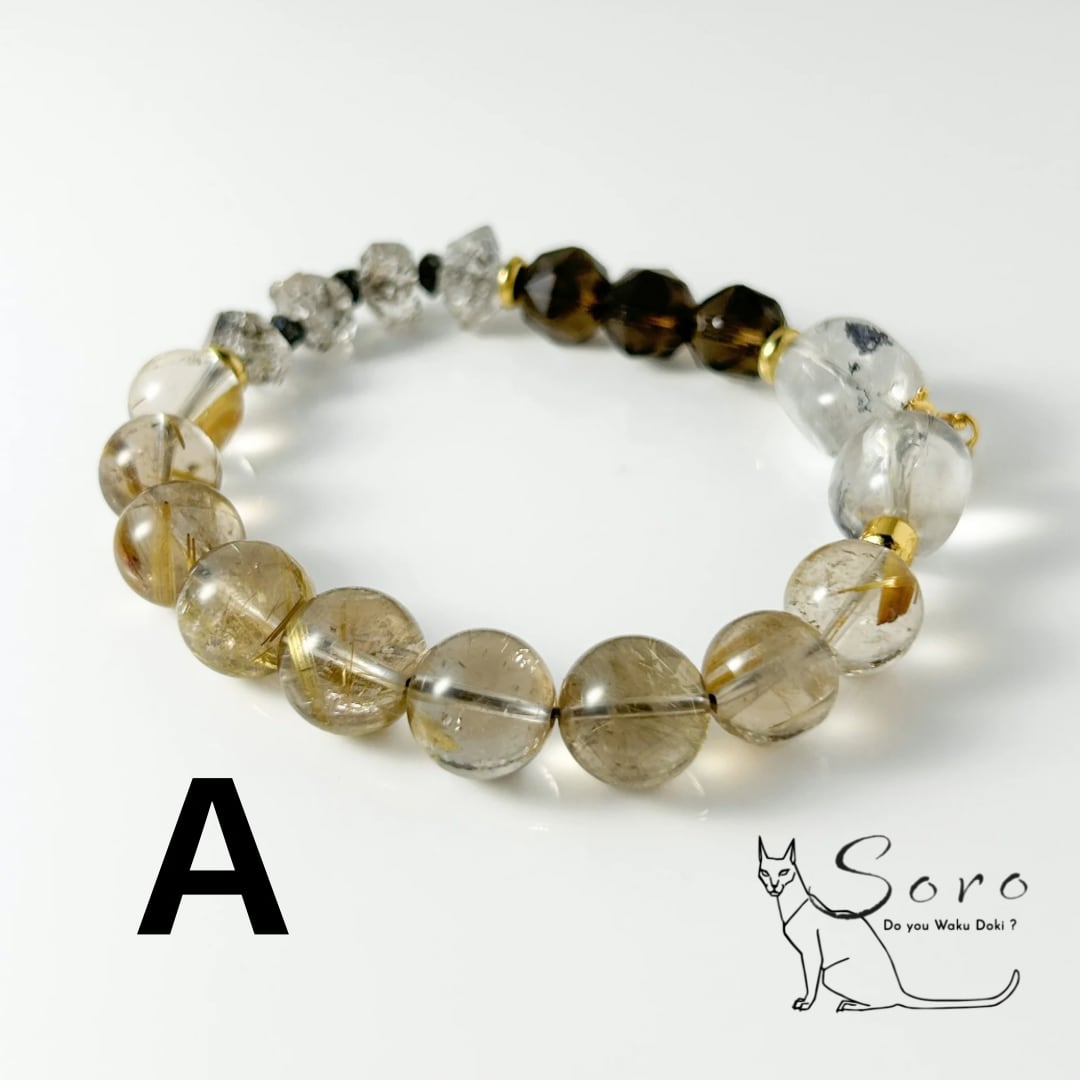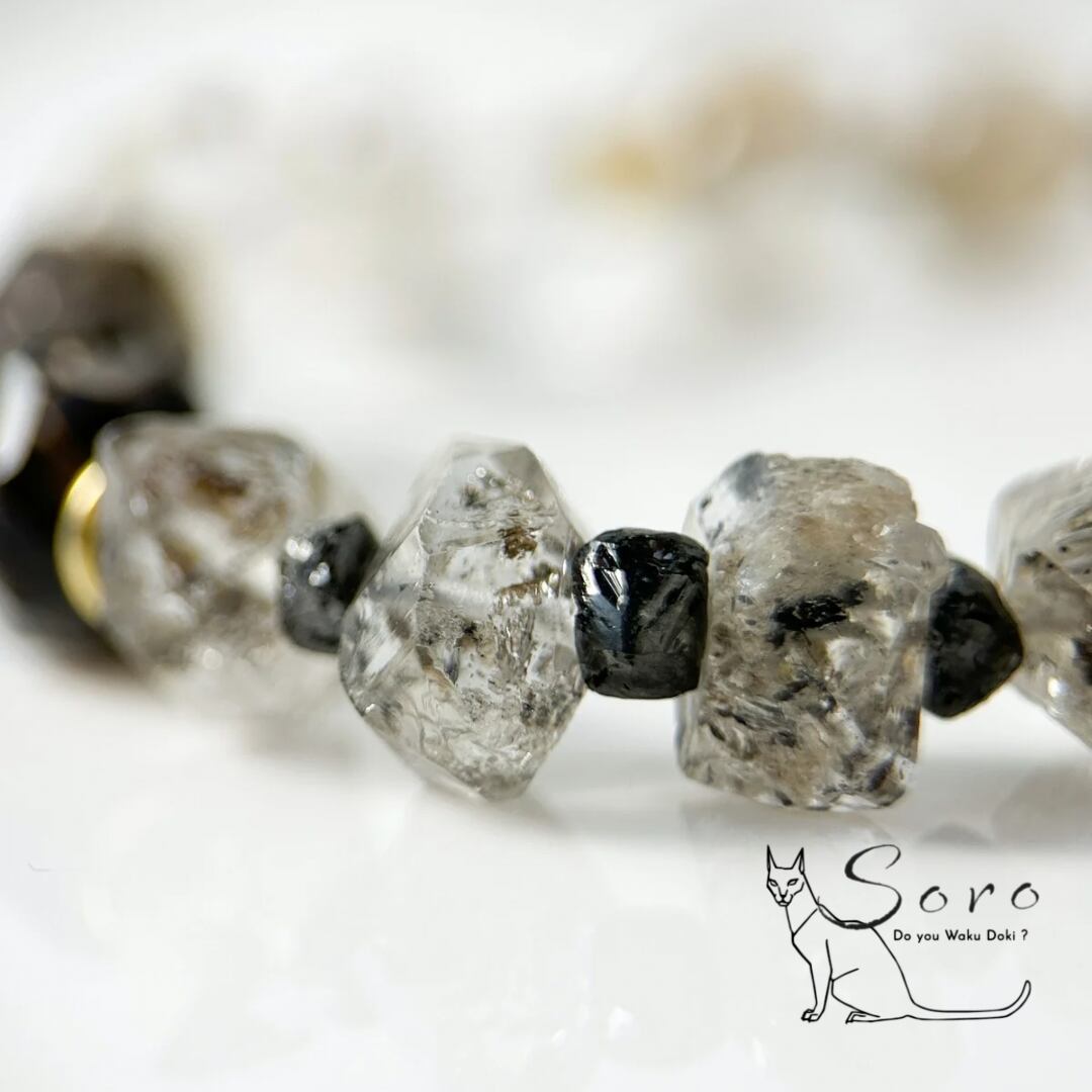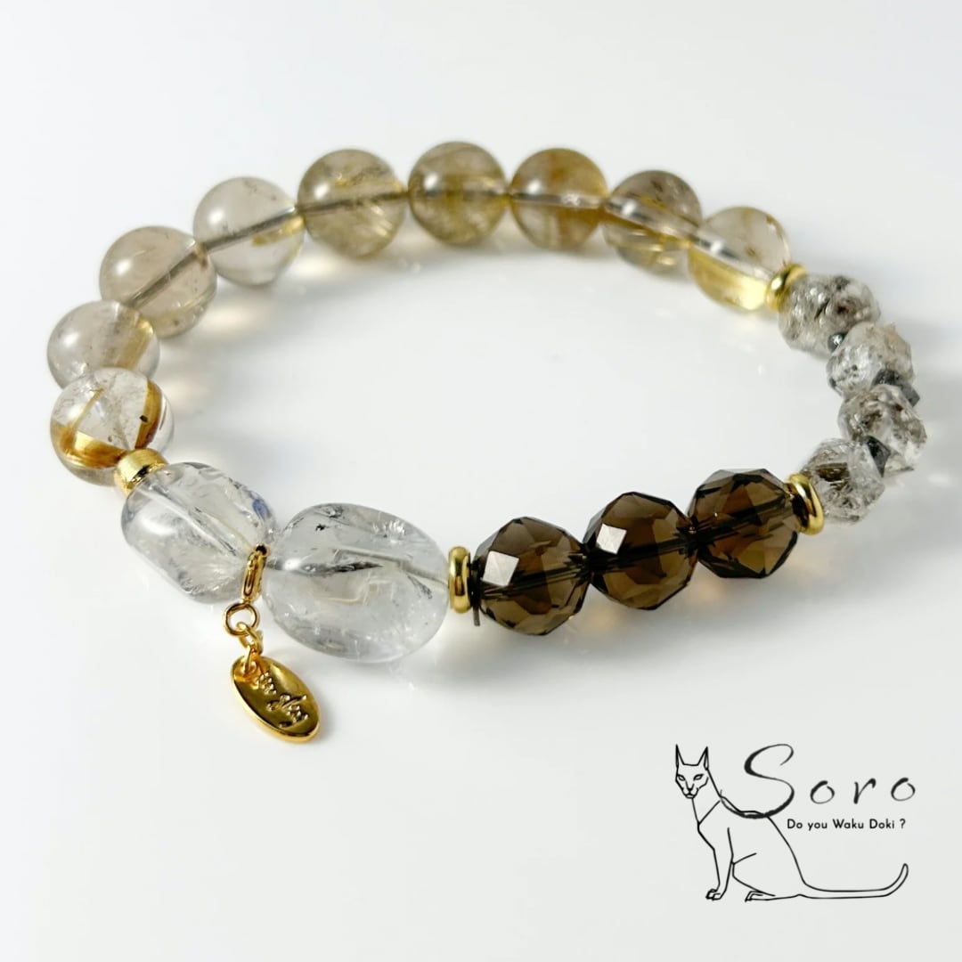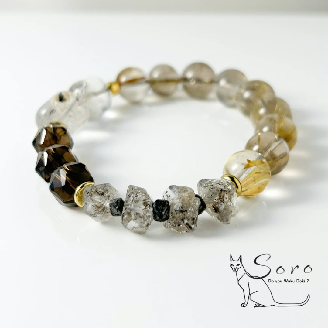 金の針が鋭く輝く11mmルチルクォーツを主役に、エレスチャルクォーツ、ダイヤモンド原石、ハーキマーダイヤモンド、スモーキークォーツを組み合わせた特別仕様のブレスレット。