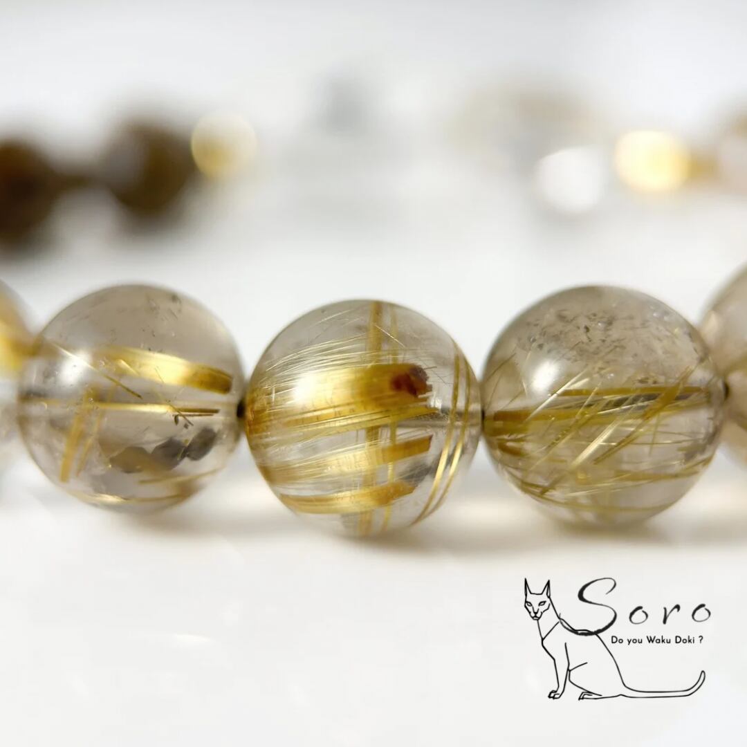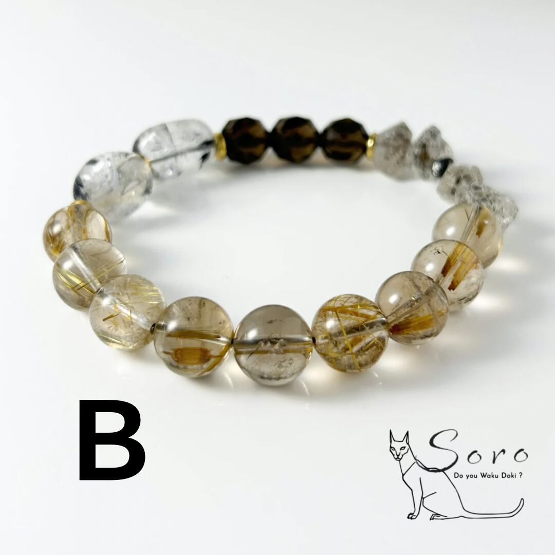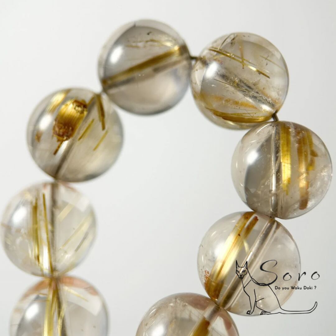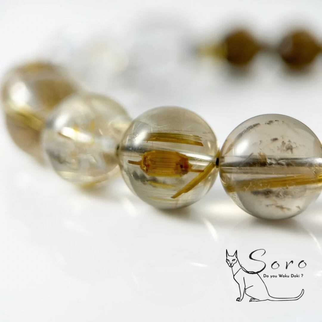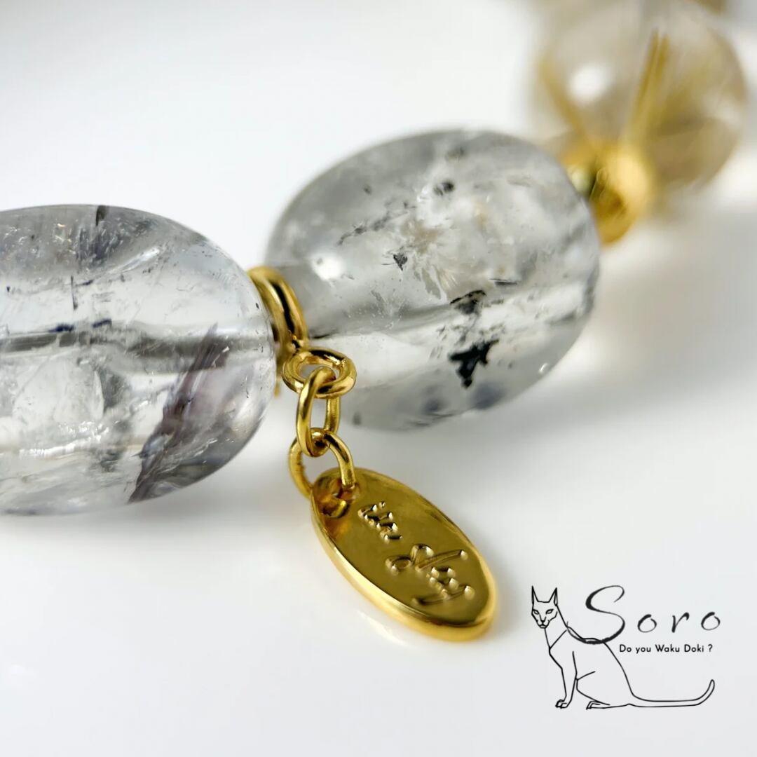 金の針が鋭く輝く11mmルチルクォーツを主役に、エレスチャルクォーツ、ダイヤモンド原石、ハーキマーダイヤモンド、スモーキークォーツを組み合わせた特別仕様のブレスレット。