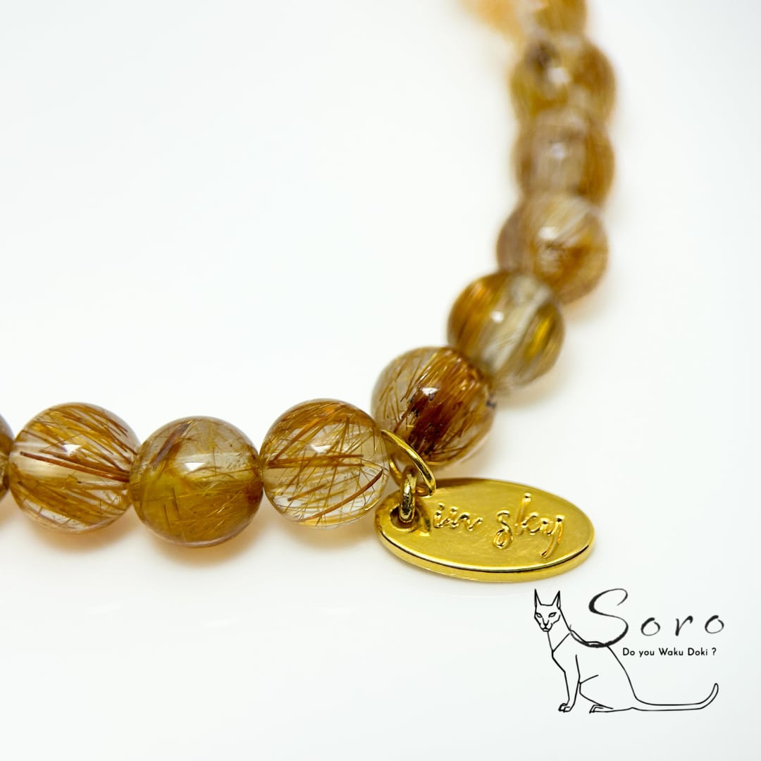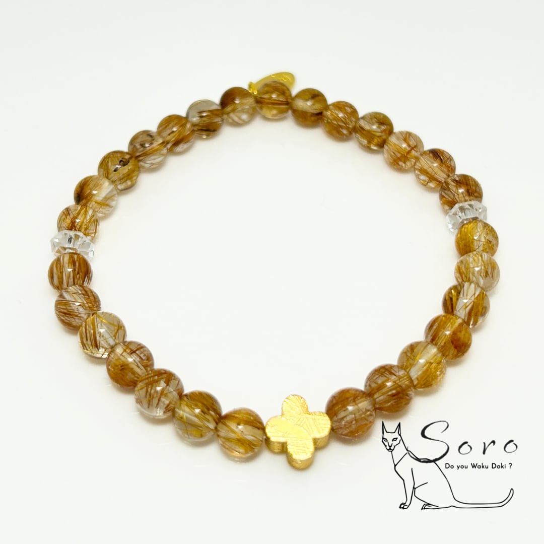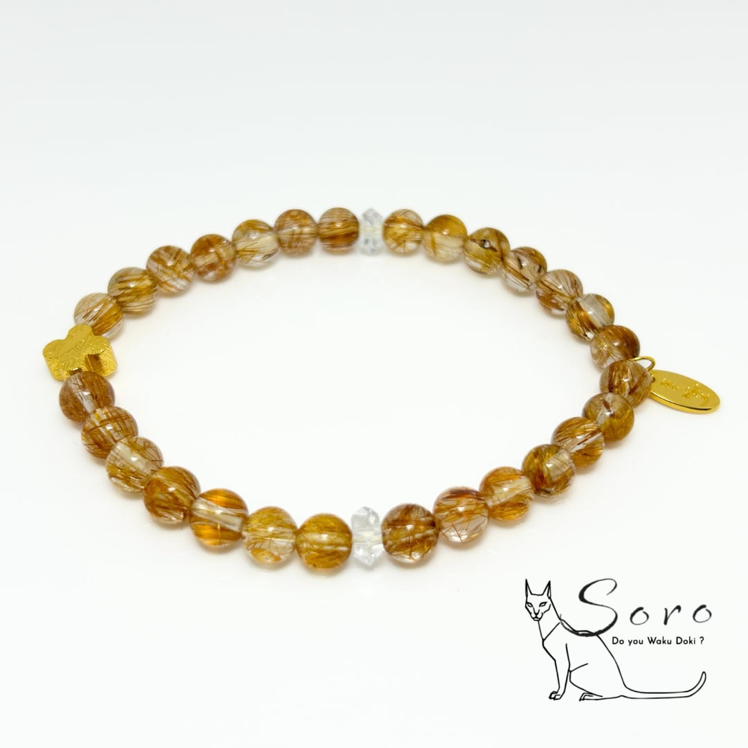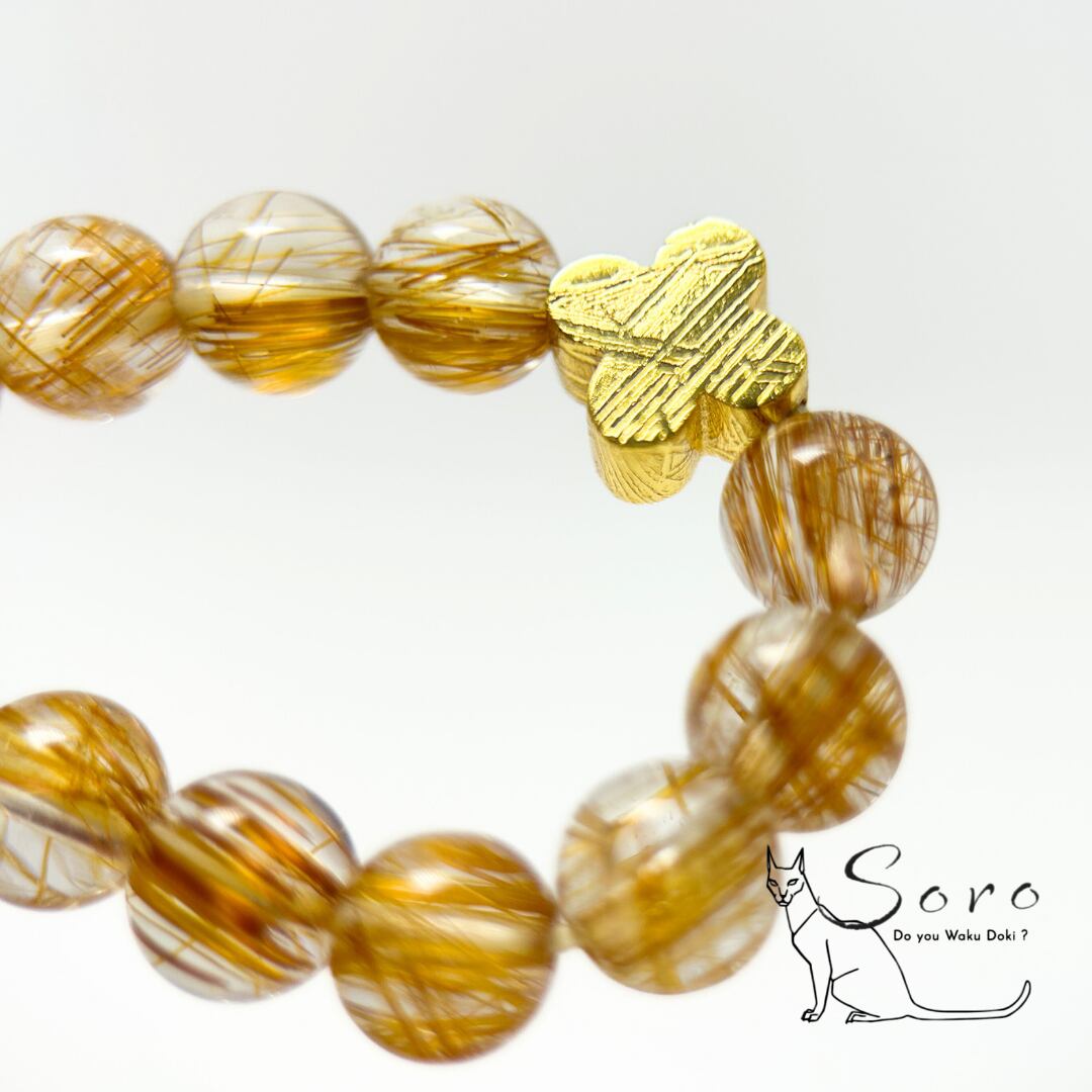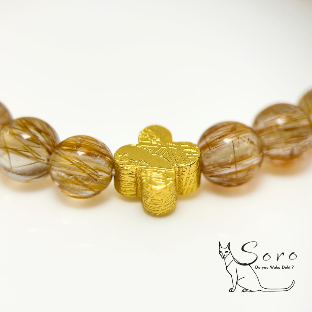 ブロンズルチルクォーツの力強い成功運と、ギベオン隕石の揺るぎない意志を支えるエネルギーが融合したブレスレット。