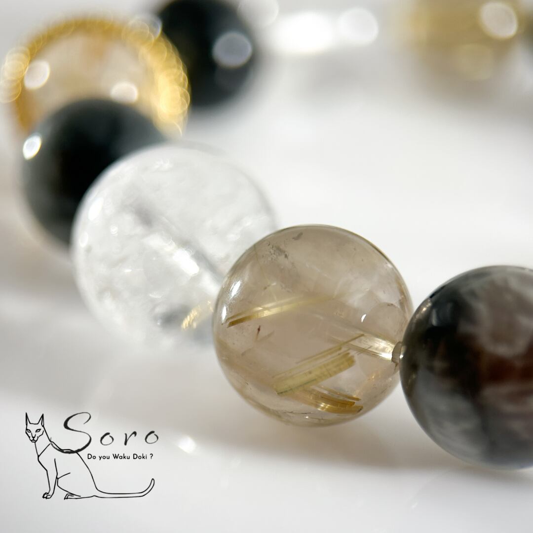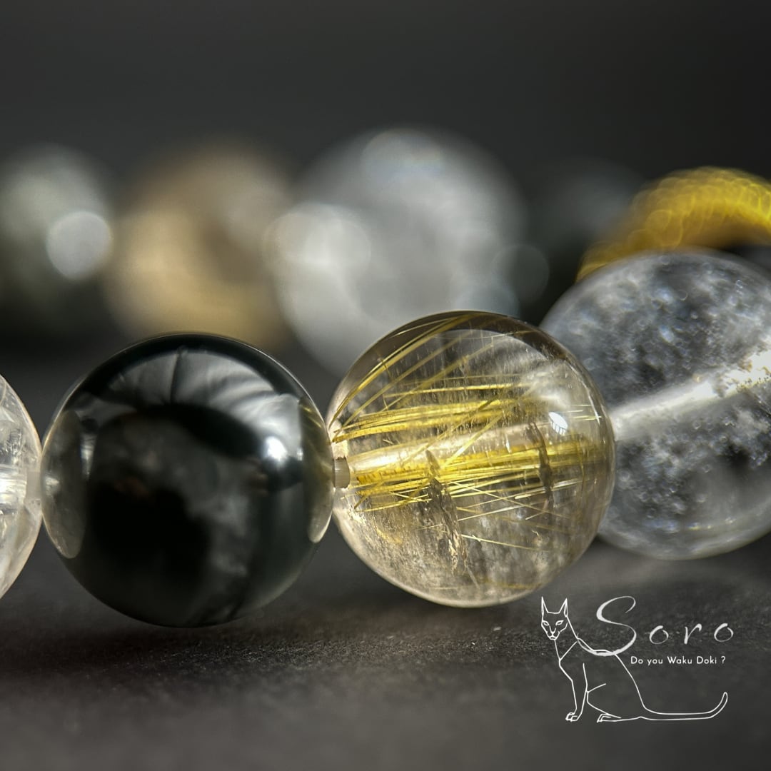 宇宙の神秘を宿すギベオン隕石に、黄金の針が輝くルチルクォーツ、虹を内包した天然アイリスクォーツ、そして深い光沢を持つイーグルアイを組み合わせたブレスレット。