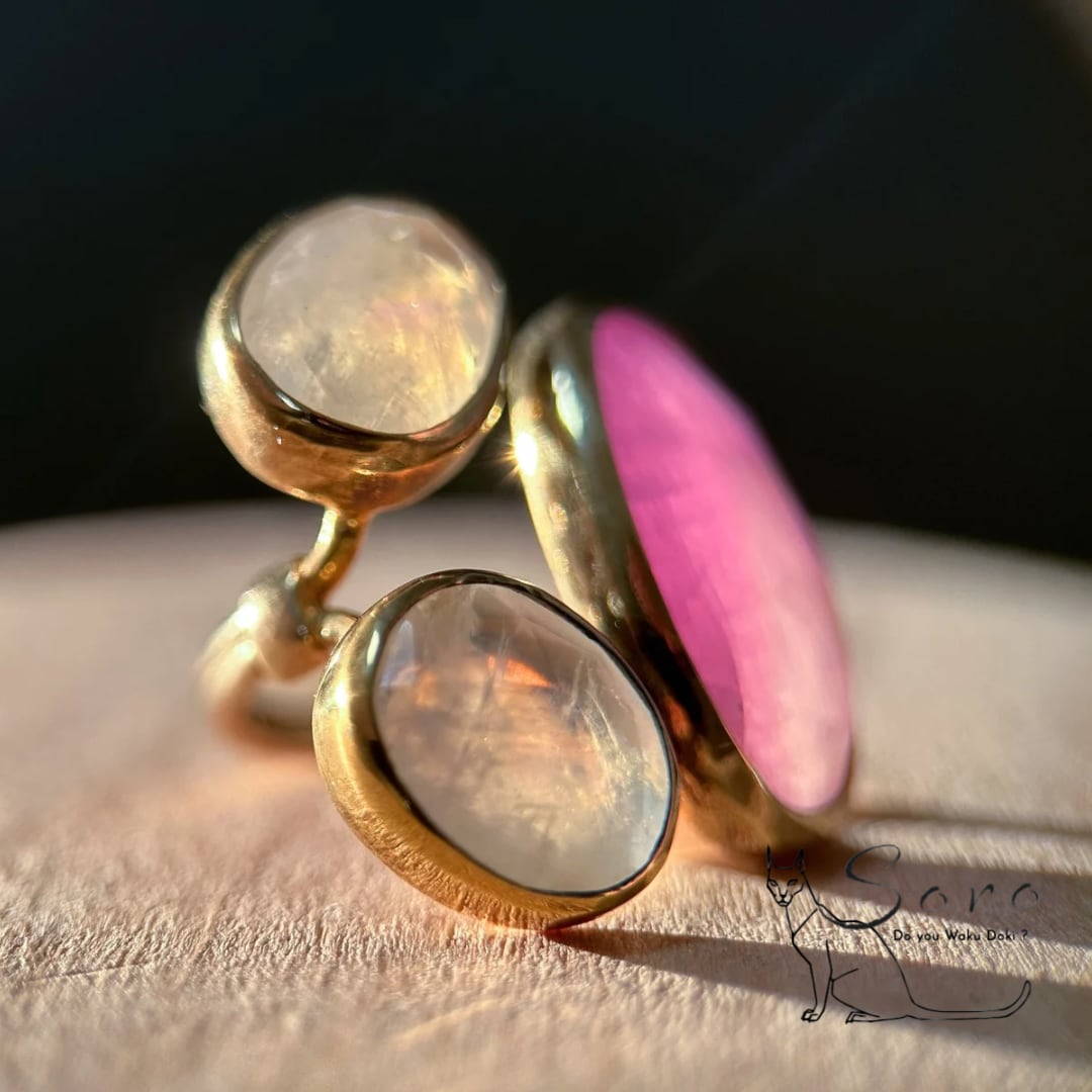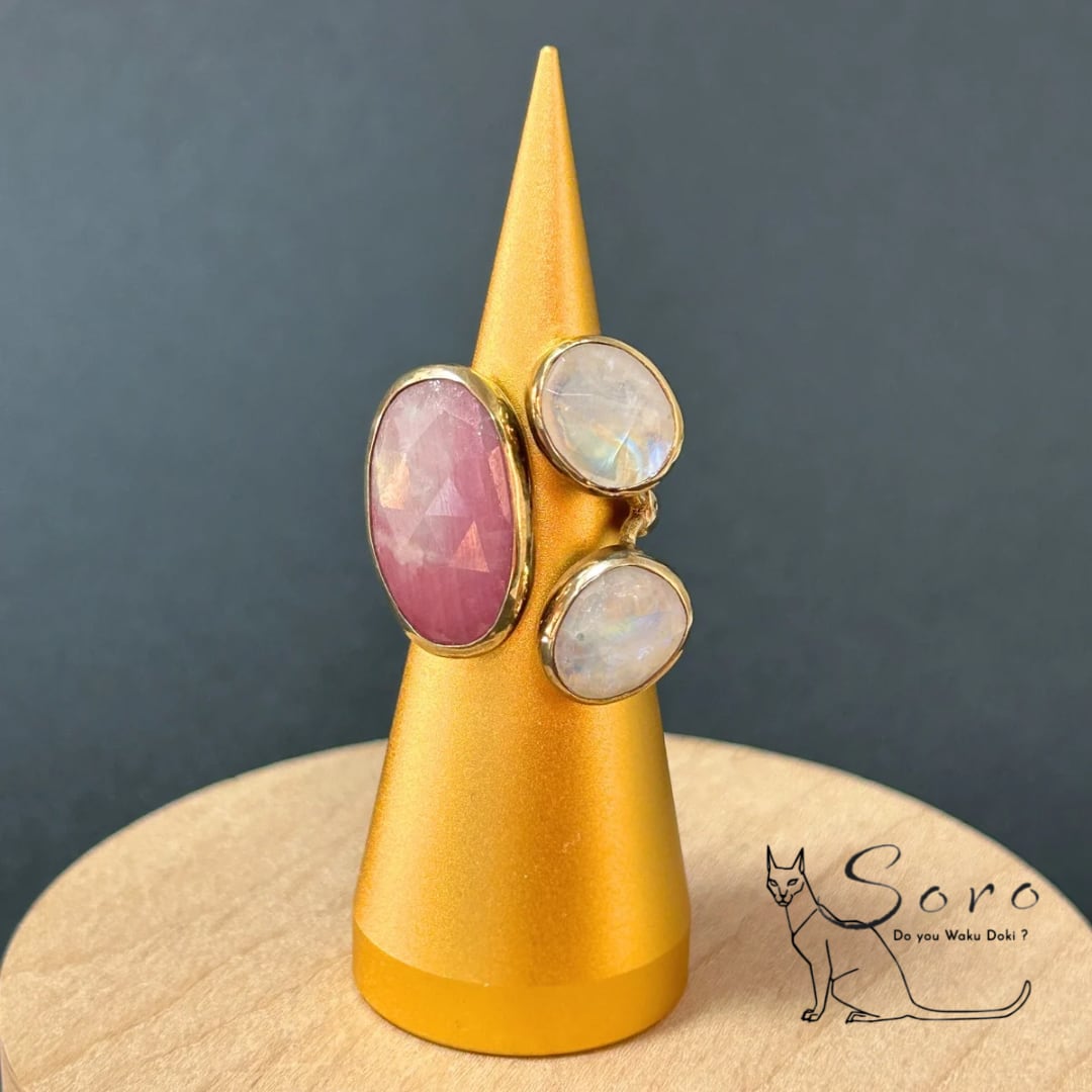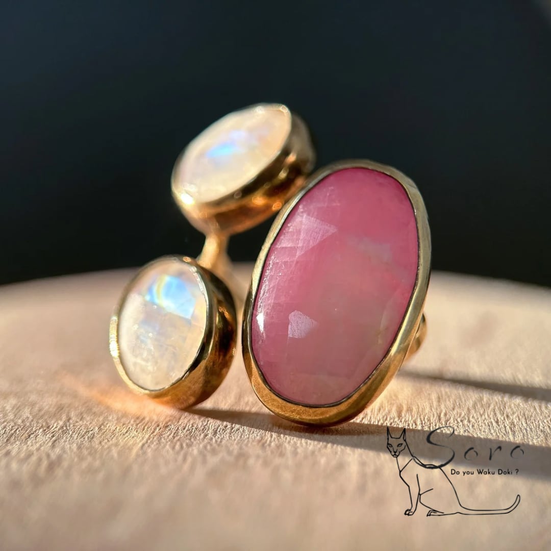 やわらかな発色が美しいピンクサファイアと、幻想的なシラーが浮かぶブルームーンストーンを組み合わせたリング。