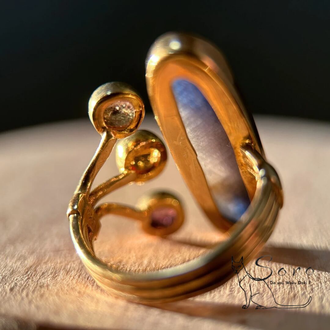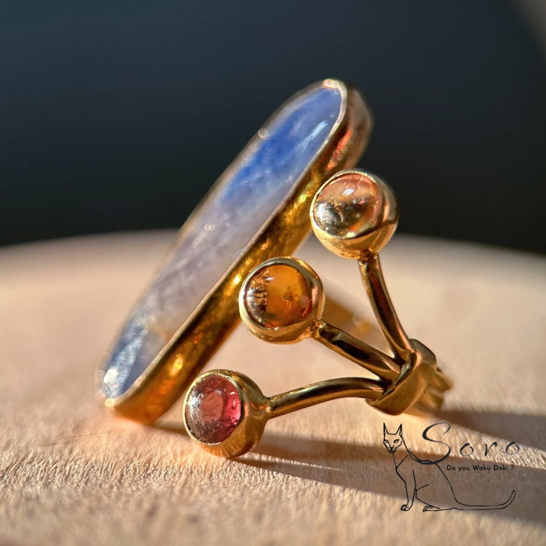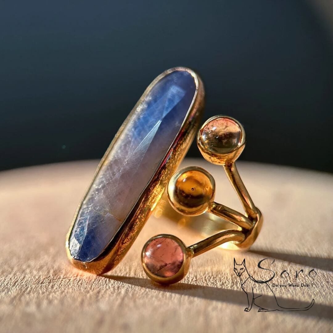 グラデーションのあるサファイアと、愛らしい透明感が魅力のトルマリンを組み合わせたリング。
