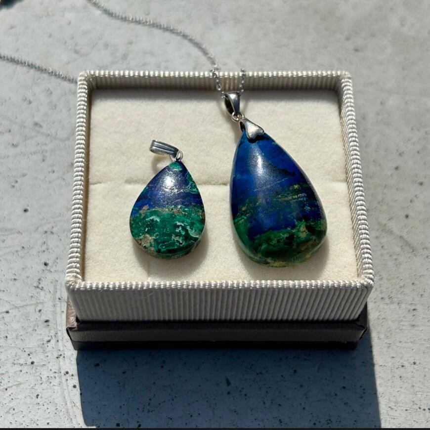 2つの鉱物が美しく混ざり合ったアズロマラカイトは、ネガティブな感情を浄化し、新しいパワーを生み出す効果をもつとされます。