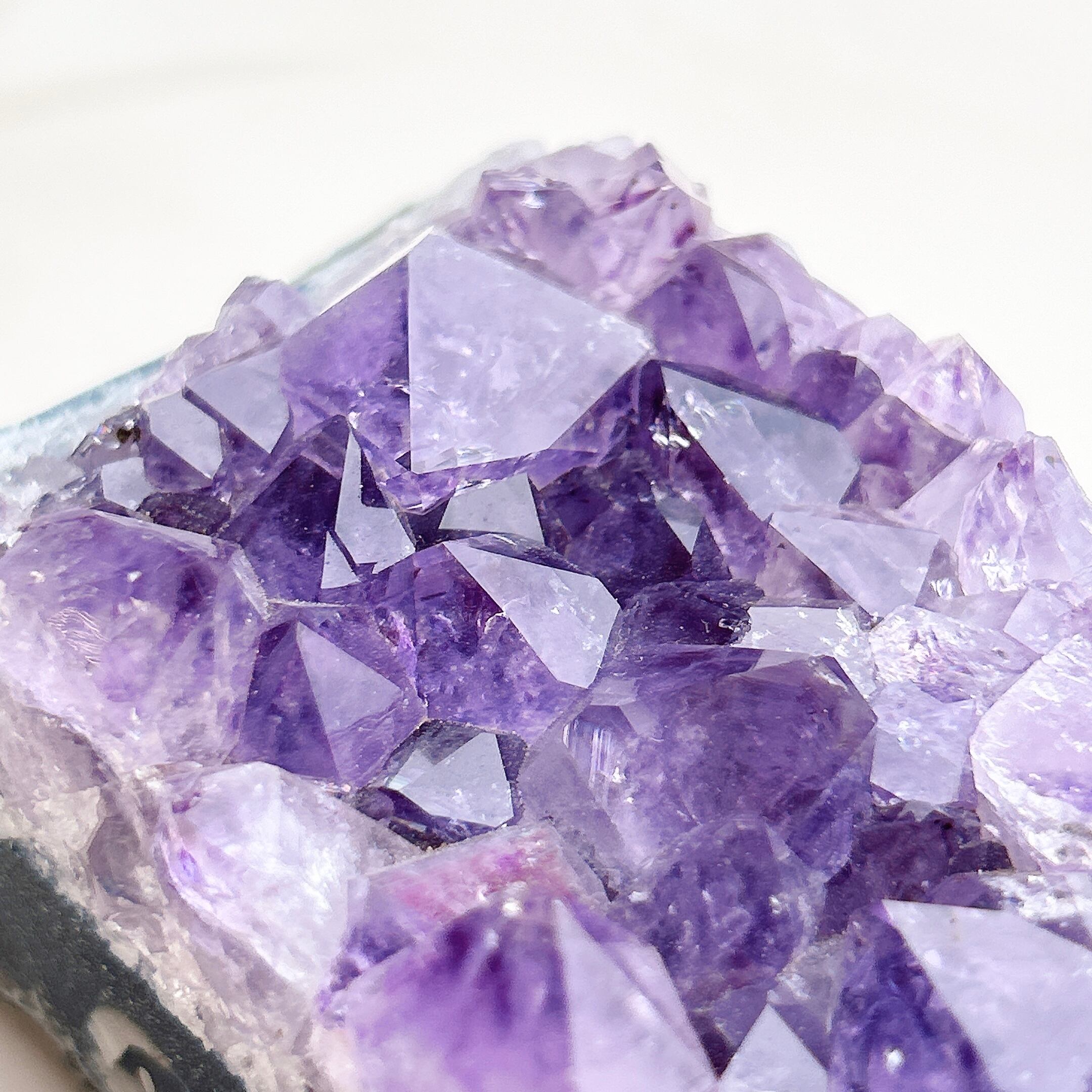 アメジストは「癒しの石」とも呼ばれていて、クラスター(集合体)はそのエネルギーを強めるとされてる。ストレスや不安を和らげて、心を穏やかにする効果が期待される。
