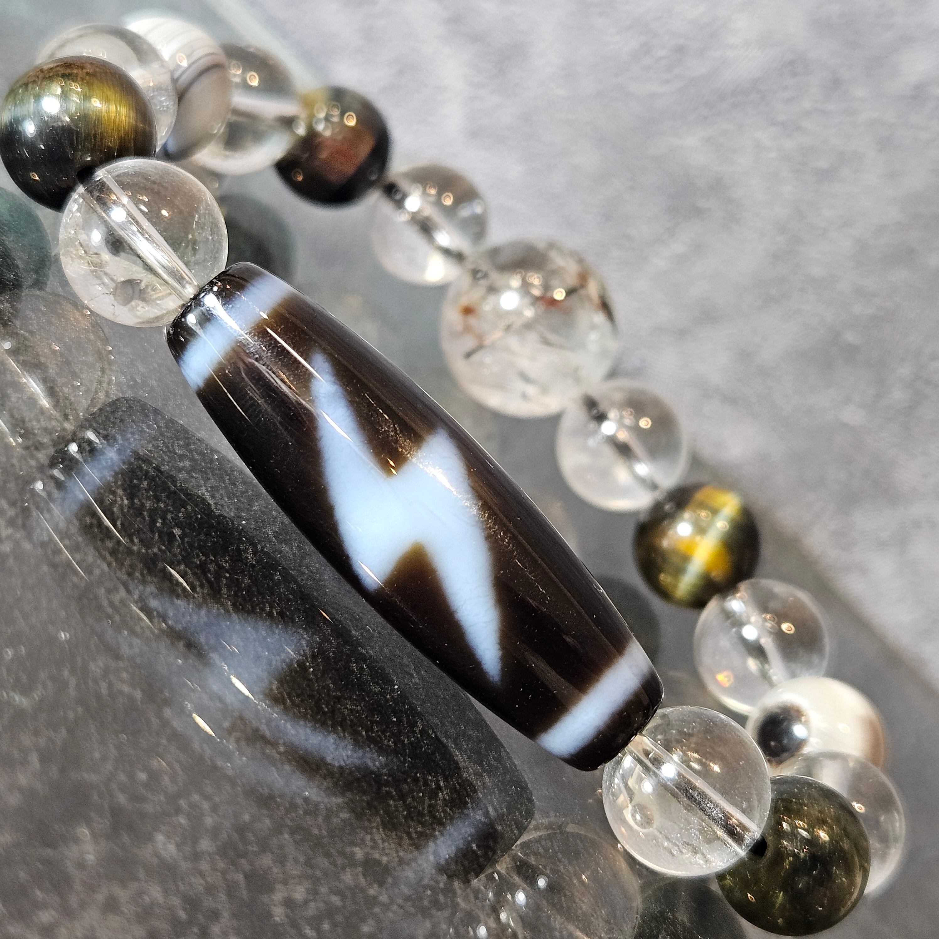 閃電五眼天珠とブラックタイガーアイの組み合わせが、金運や事業運の向上を助け、行動力を後押しします。